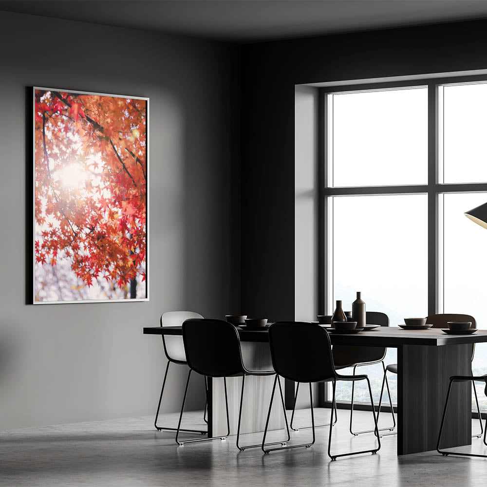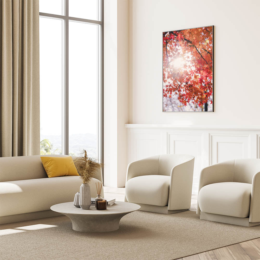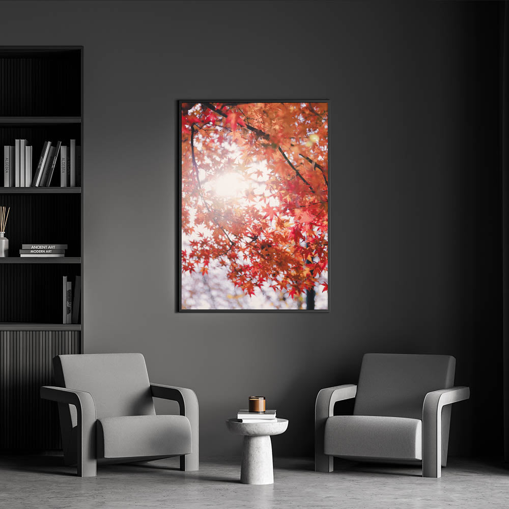 Capture the brilliance of fall with this autumn wall decor, featuring fiery red and orange maple leaves glowing under golden sunlight. This fall wall art embodies the warmth and vibrancy of the season, making it an eye-catching addition to any home. Whether you love the crisp autumn air or the magical colors of changing leaves, this fall canvas art brings seasonal beauty indoors.