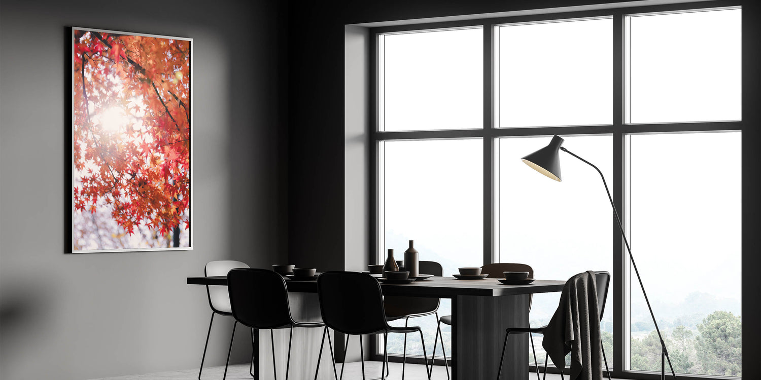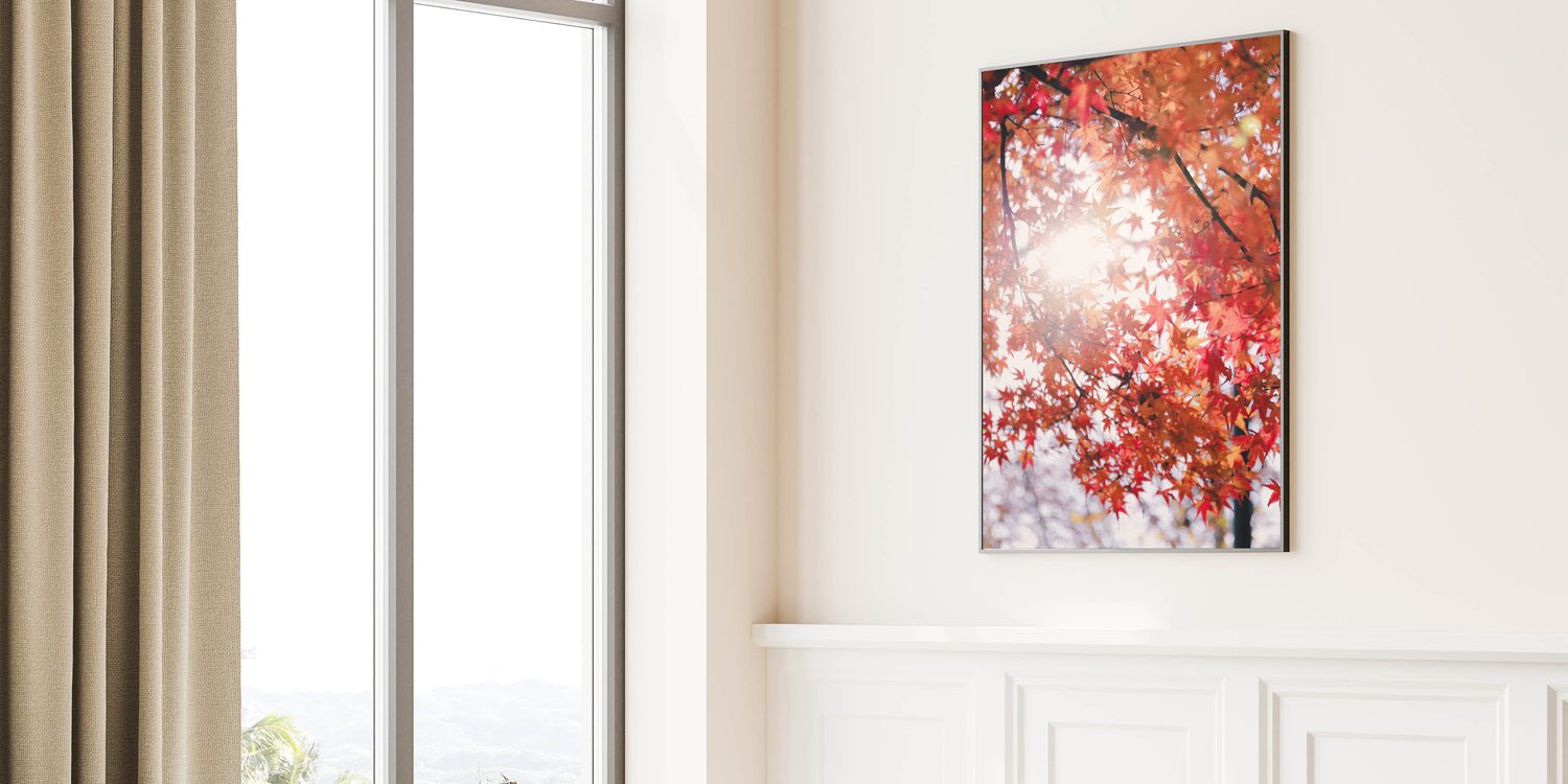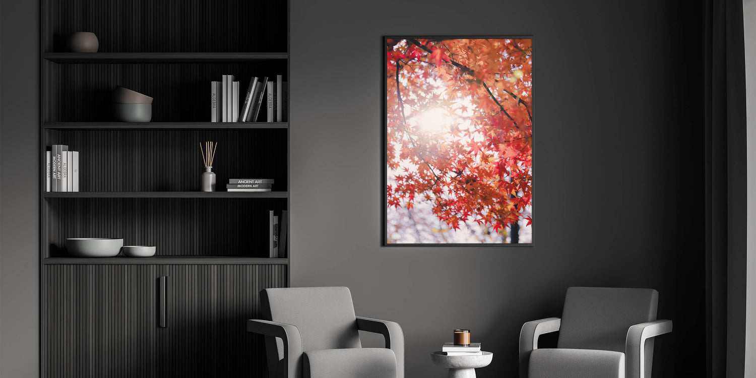 Capture the brilliance of fall with this autumn wall decor, featuring fiery red and orange maple leaves glowing under golden sunlight. This fall wall art embodies the warmth and vibrancy of the season, making it an eye-catching addition to any home. Whether you love the crisp autumn air or the magical colors of changing leaves, this fall canvas art brings seasonal beauty indoors.