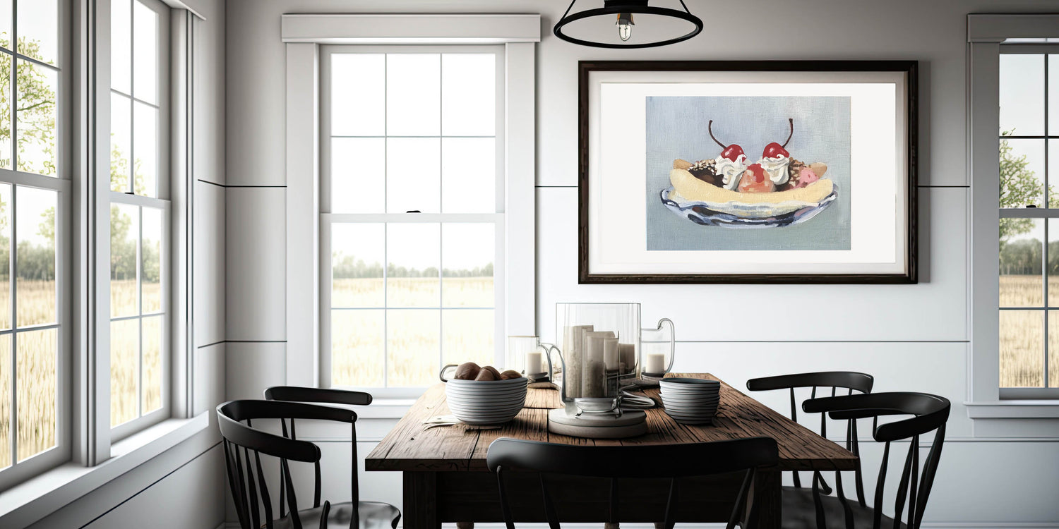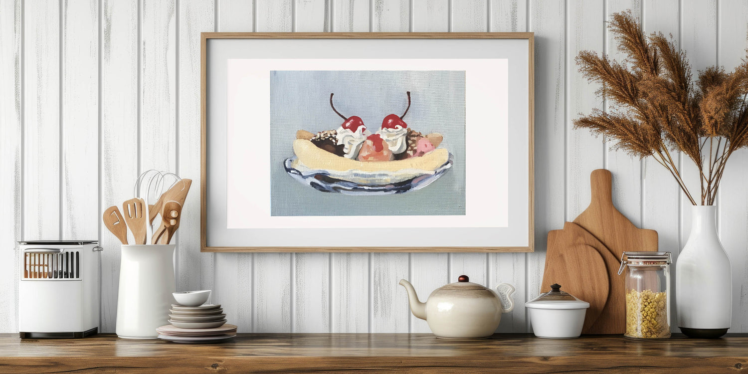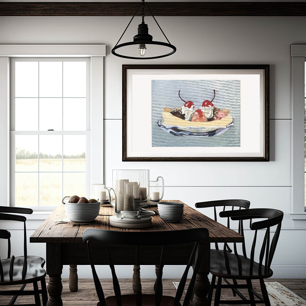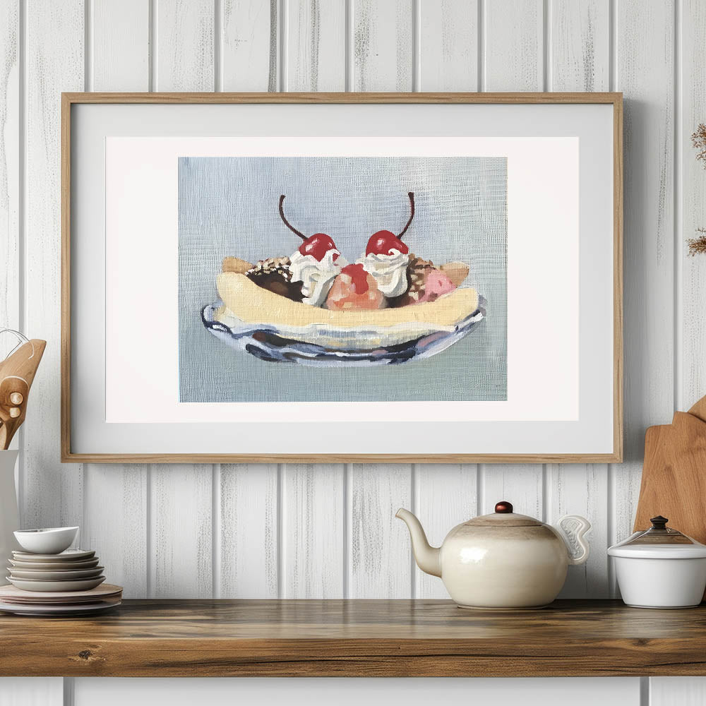 Indulge in the charm of this delicious dessert-themed Fruits Wall Art, featuring a beautifully painted banana split with creamy scoops of ice cream, whipped cream, and cherries on top. The soft pastel hues and textured brushstrokes add a nostalgic, vintage touch, making this Fruit Art Print a delightful addition to Kitchen Fruit Decor, cafés, ice cream parlors, or dessert lovers' collections.