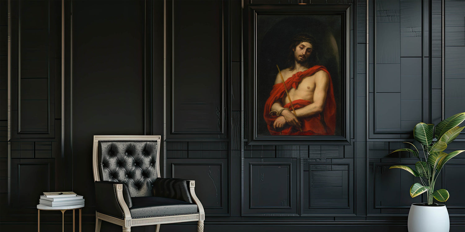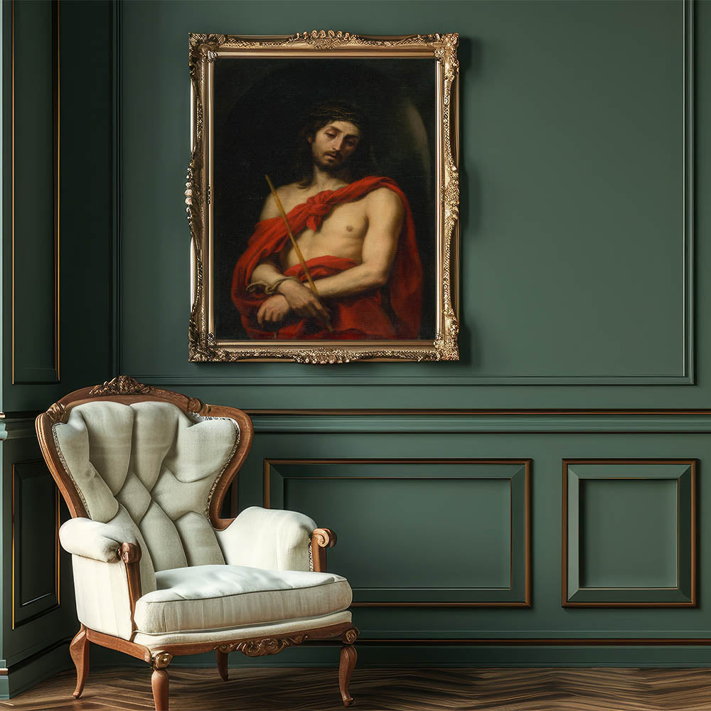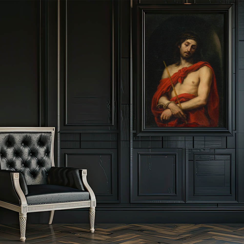 Elevate your space with this powerful Baroque art print featuring Christ adorned with a crown of thorns, symbolizing sacrifice and divine suffering. Richly rendered with exceptional detail and emotional depth, the artwork captures the essence of religious Baroque masterpieces. The vivid red drapery contrasts beautifully against the dark background, creating a visually striking and contemplative focal point for your interiors.