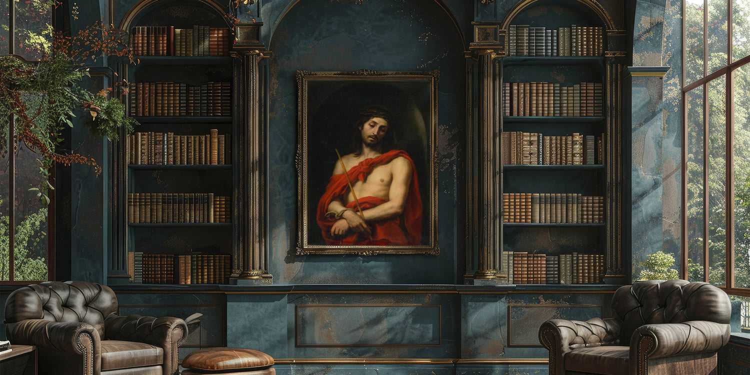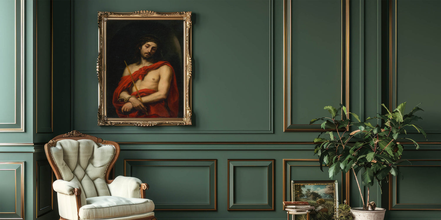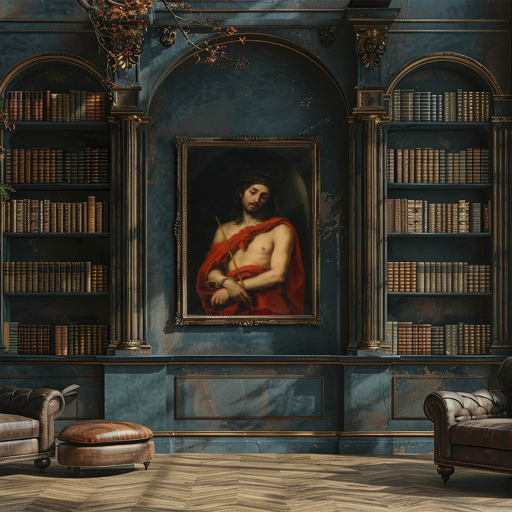Elevate your space with this powerful Baroque art print featuring Christ adorned with a crown of thorns, symbolizing sacrifice and divine suffering. Richly rendered with exceptional detail and emotional depth, the artwork captures the essence of religious Baroque masterpieces. The vivid red drapery contrasts beautifully against the dark background, creating a visually striking and contemplative focal point for your interiors.