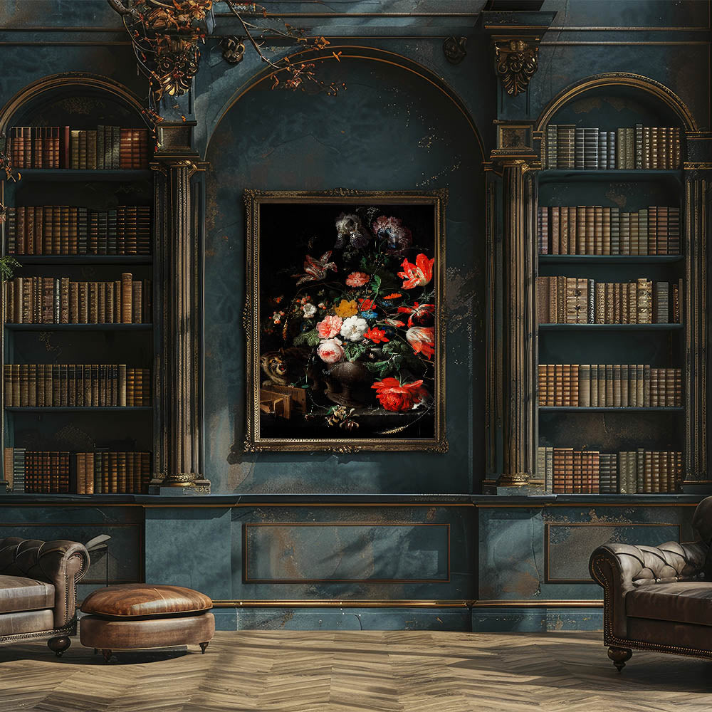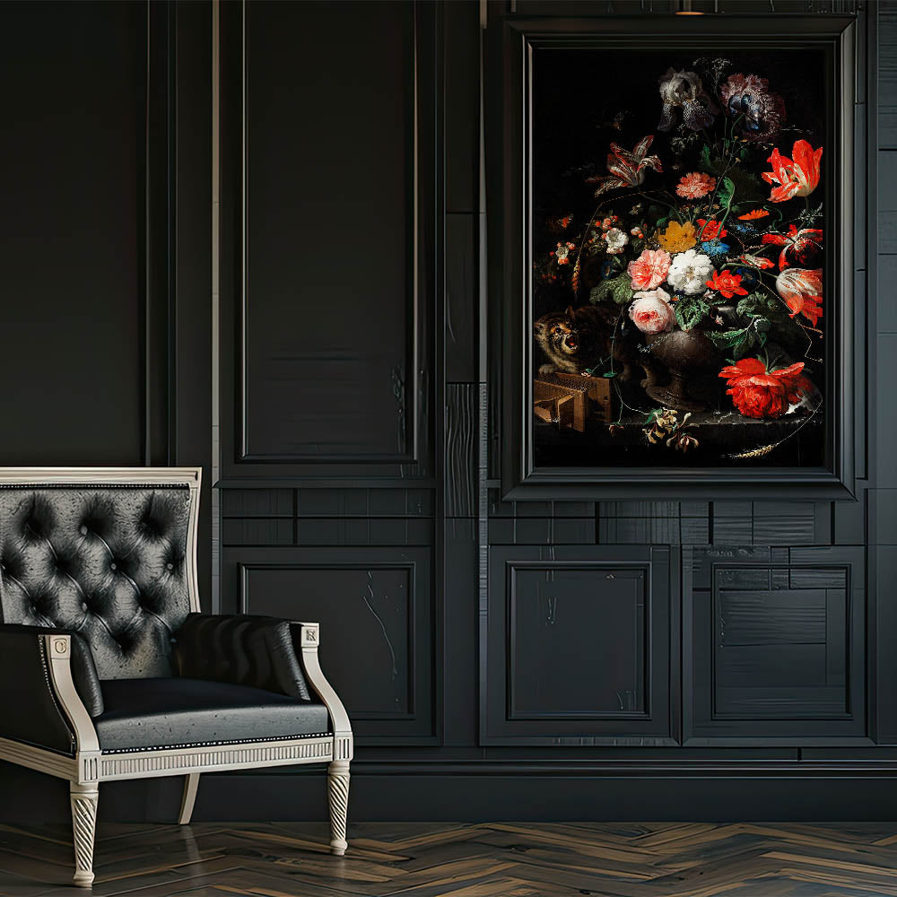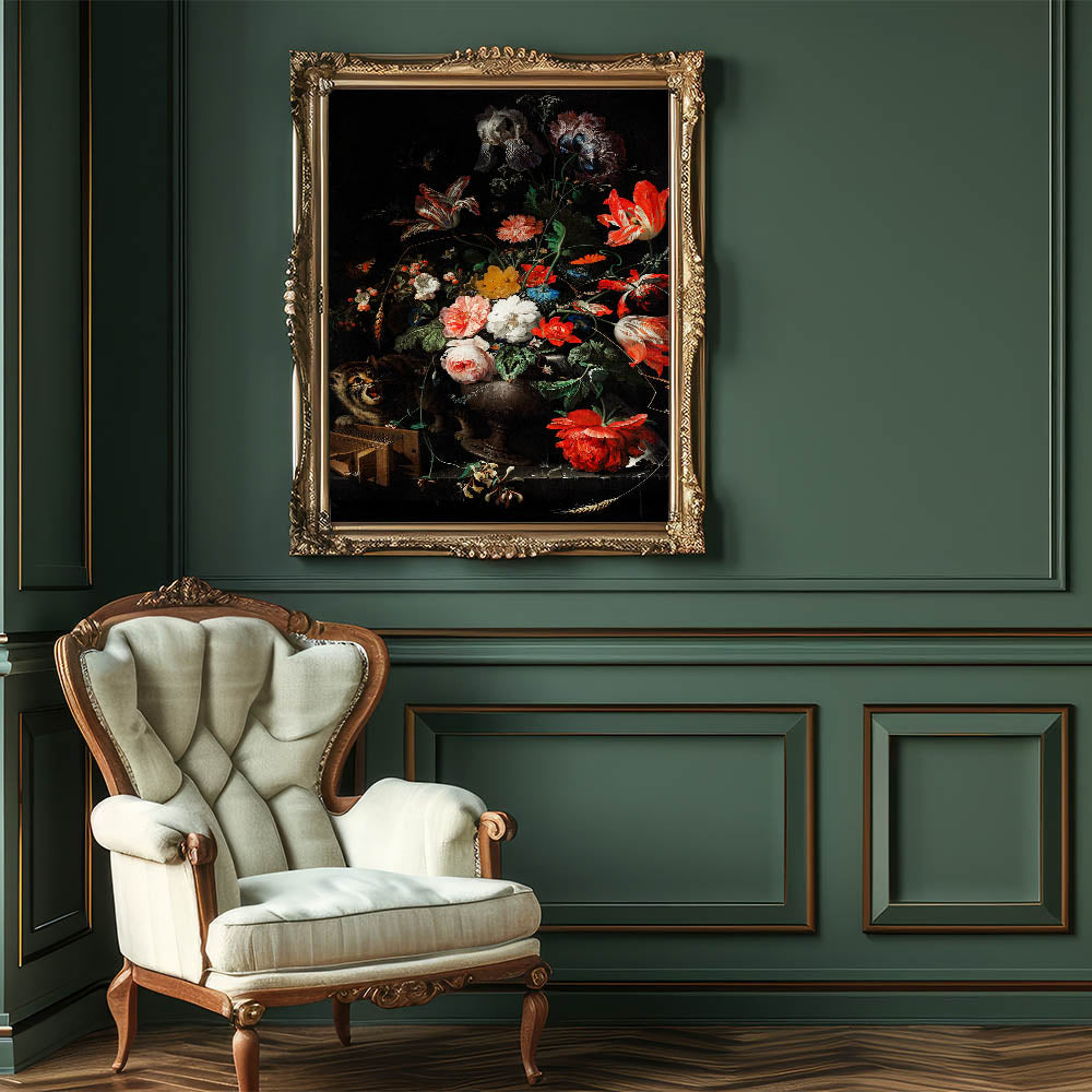 Immerse yourself in the elegance of Baroque artistry with this exquisite floral still life featuring vivid blooms and an intriguing cat. This masterpiece captures the intricate detailing and vibrant contrasts characteristic of the Baroque period. Its lush arrangement of roses, tulips, and other blossoms is set against a dramatic dark background, making the colors pop with timeless artistic expression.