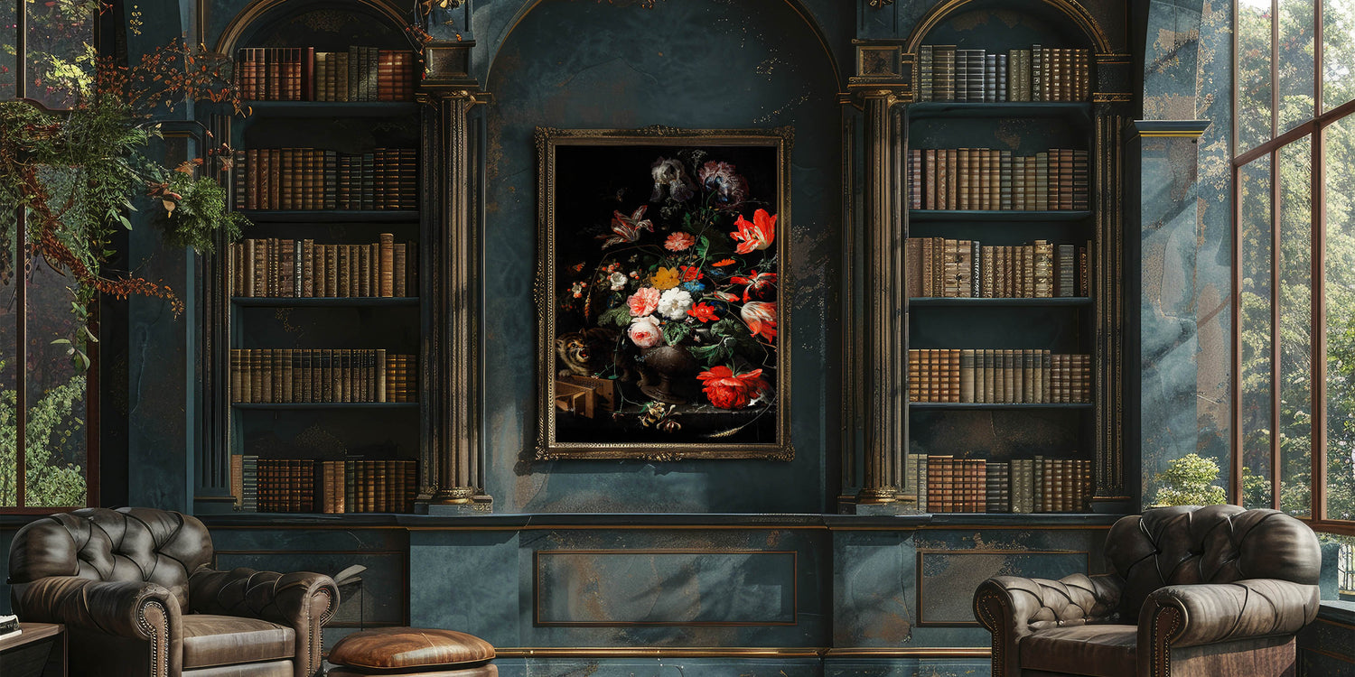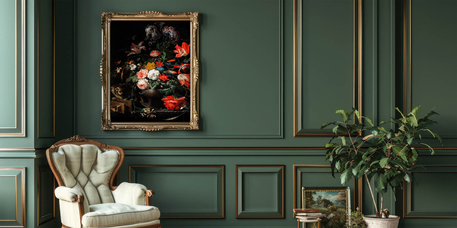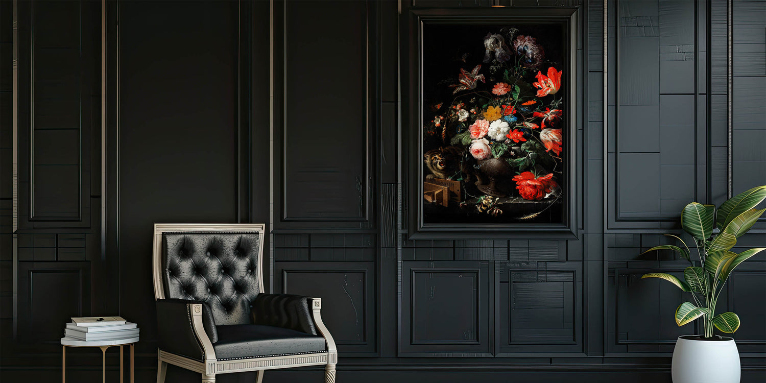 Immerse yourself in the elegance of Baroque artistry with this exquisite floral still life featuring vivid blooms and an intriguing cat. This masterpiece captures the intricate detailing and vibrant contrasts characteristic of the Baroque period. Its lush arrangement of roses, tulips, and other blossoms is set against a dramatic dark background, making the colors pop with timeless artistic expression.