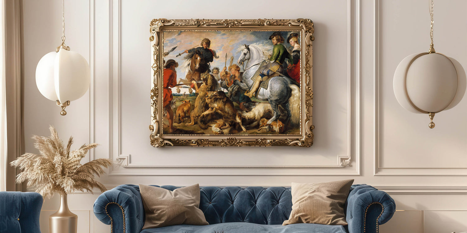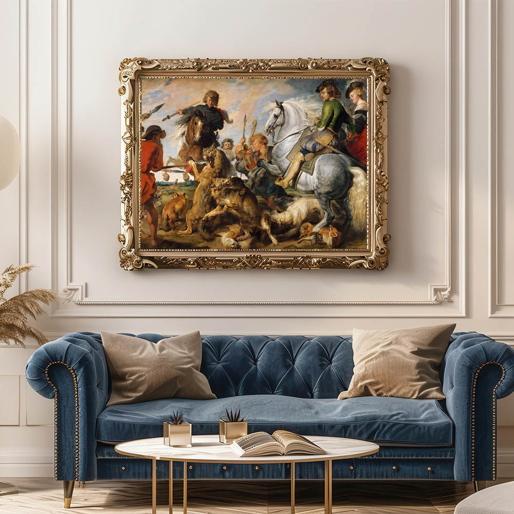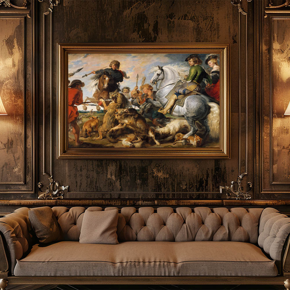 Immerse yourself in the drama and dynamism of Baroque Art with this vivid hunting scene. Depicting a fierce battle between man, horse, and wild animals, this masterpiece showcases detailed Baroque designs with expressive figures, intricate textures, and a breathtaking use of color and motion. Perfect for lovers of historical art, this artwork brings the intensity and grandeur of the hunt to life.