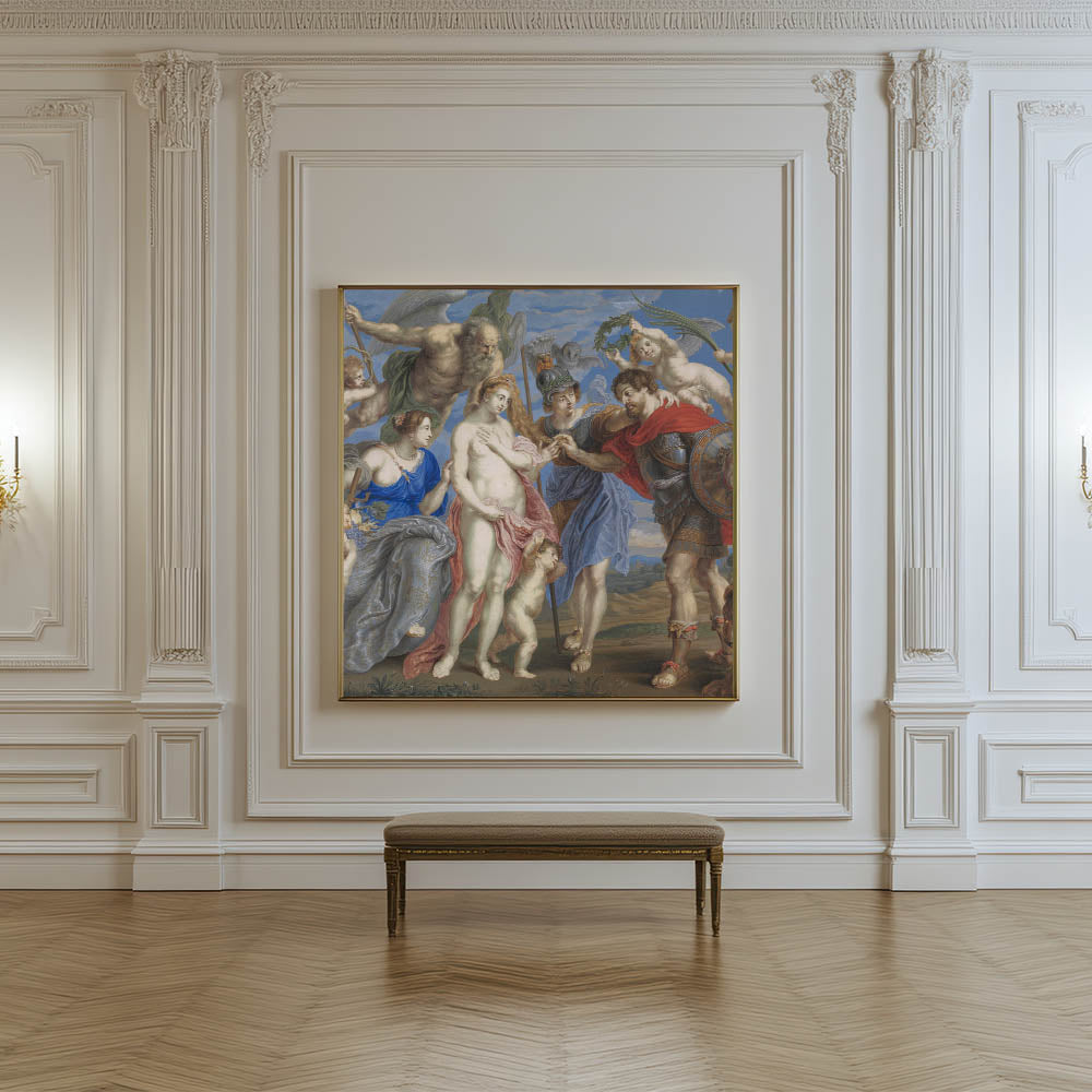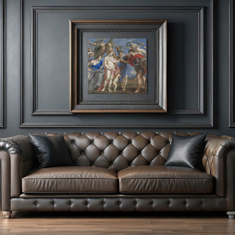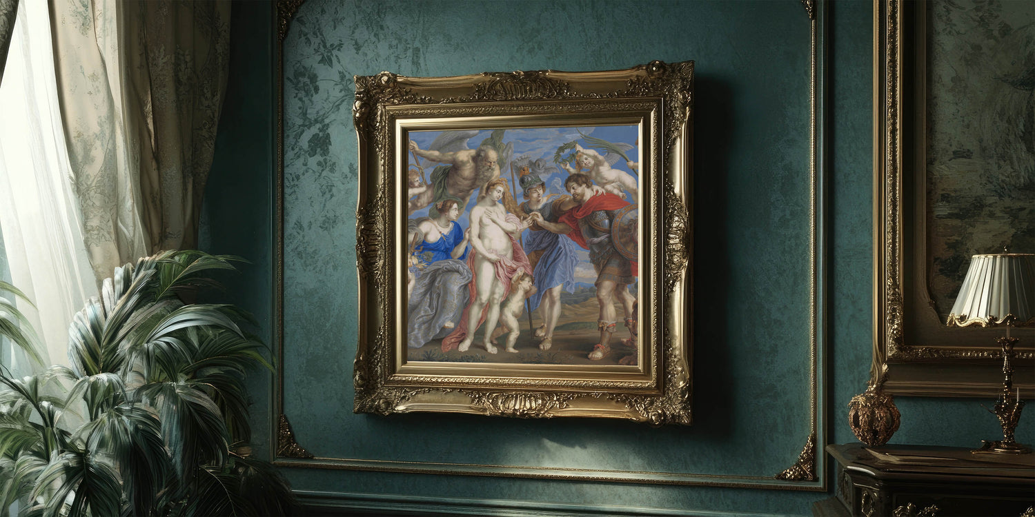 Immerse yourself in the grandeur of Baroque Art with this vibrant mythological scene. This captivating artwork features dramatic figures, celestial beings, and intricate details that exemplify the detailed Baroque designs of the era. The striking contrasts between armor, flowing fabrics, and ethereal cherubs create a dynamic and timeless artistic expression that is sure to captivate viewers.