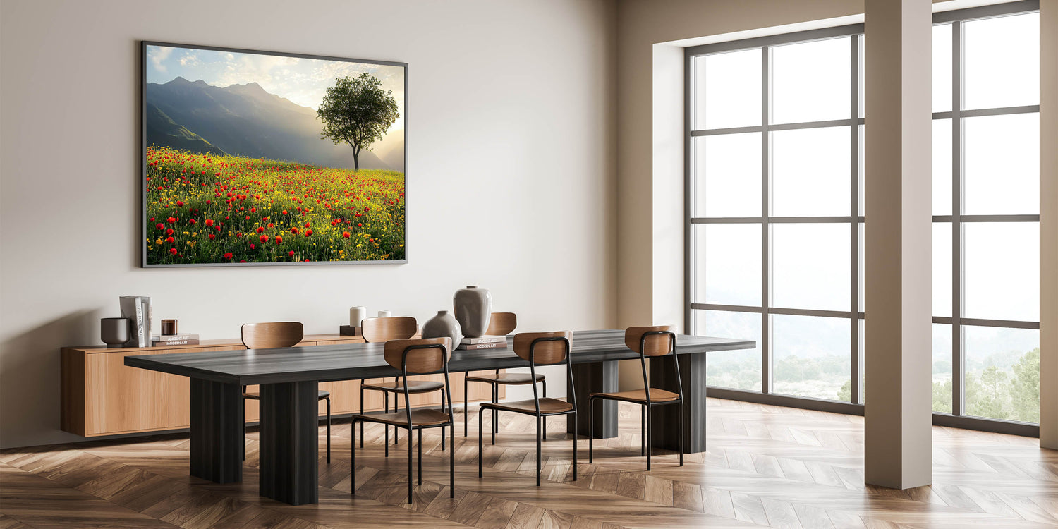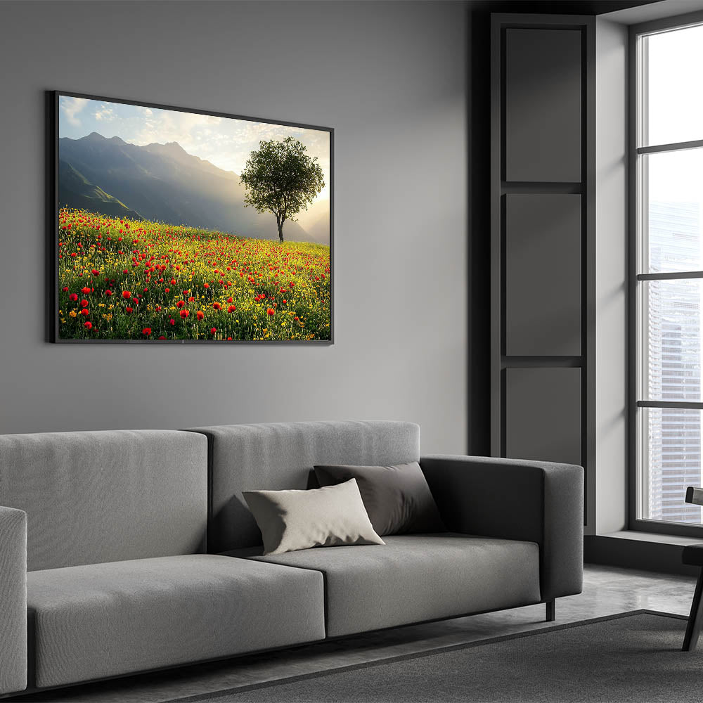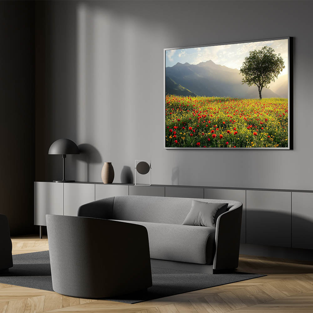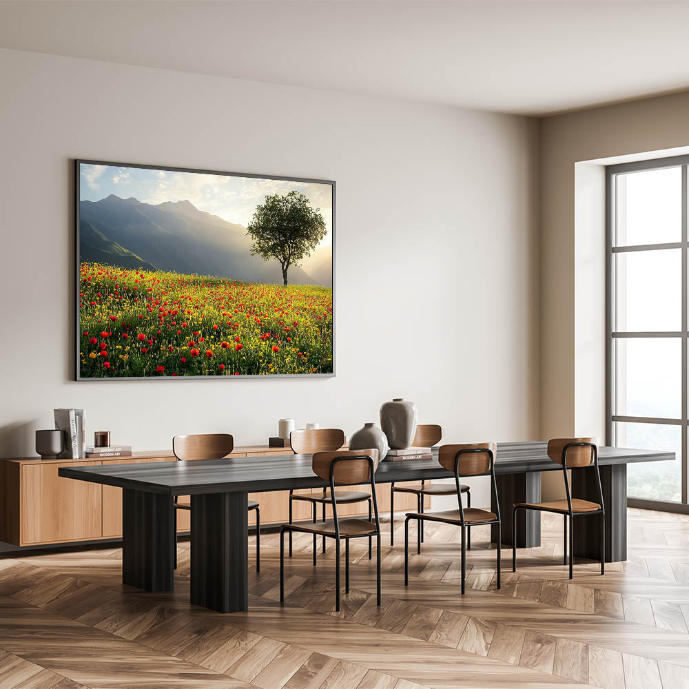 Celebrate the serene beauty of nature with this exquisite countryside wall art. Showcasing a vibrant meadow filled with red and yellow wildflowers, a solitary tree stands gracefully against the backdrop of majestic mountains illuminated by soft, golden sunlight. This artwork beautifully captures the tranquility of rural landscapes, making it a perfect addition to rustic farmhouse decor or nature-inspired interiors.