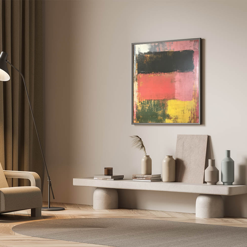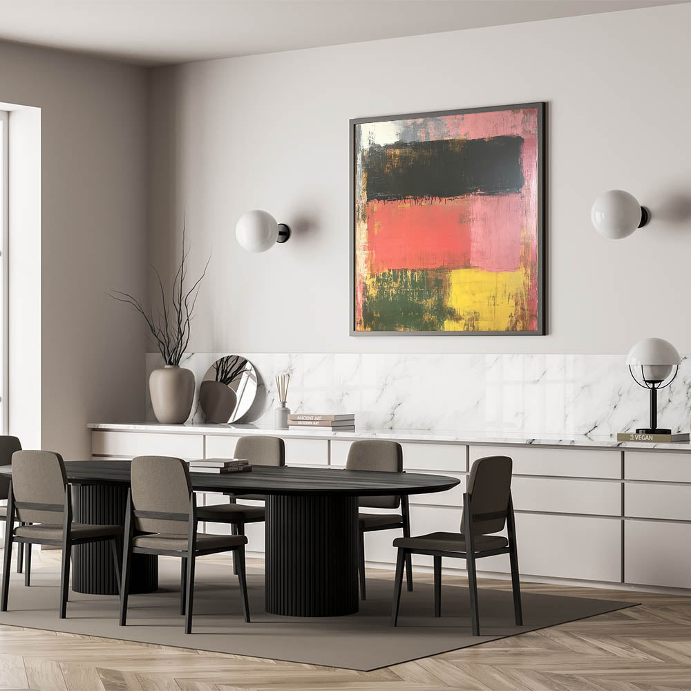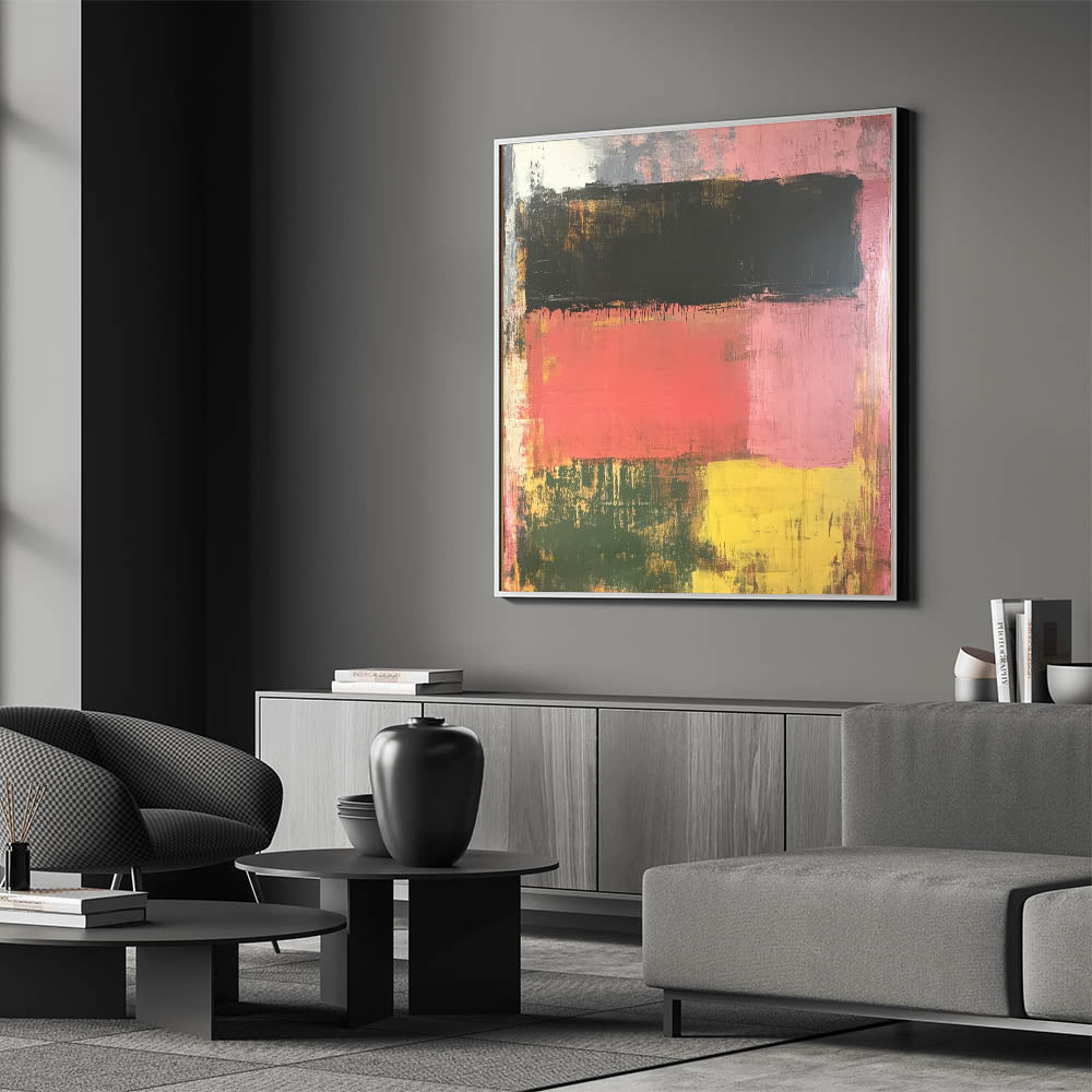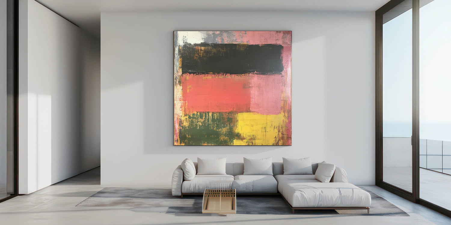 Make a statement with this Abstract Expressionist Art for Home Decor, featuring a bold interplay of black, red, pink, yellow, and green. This Original Abstract Expressionist Painting uses strong color blocking and expressive textures to evoke emotion and depth. The raw energy of the Expressionist Canvas Wall Art makes it an eye-catching piece for contemporary interiors.