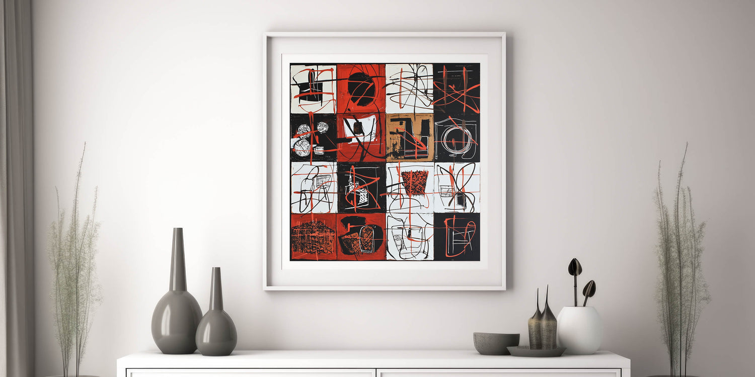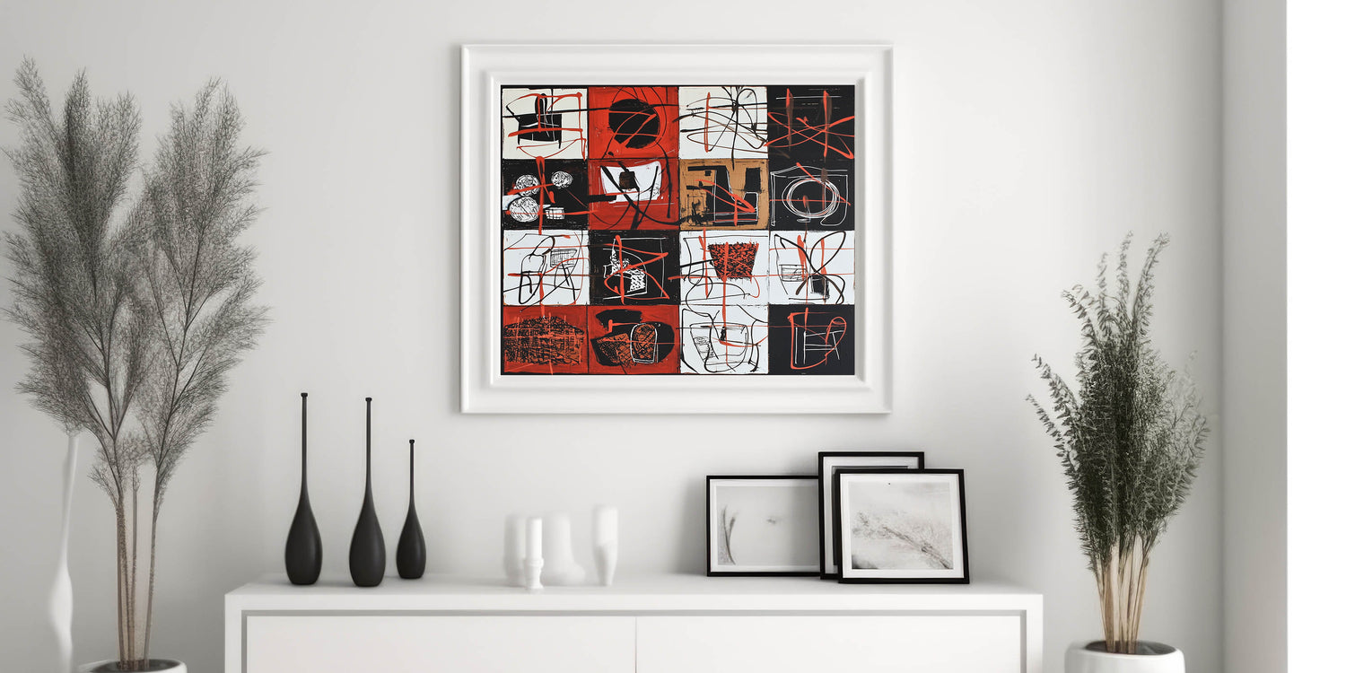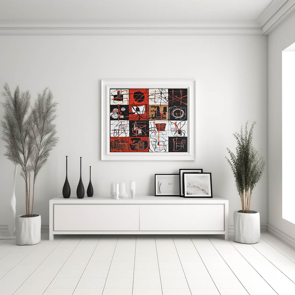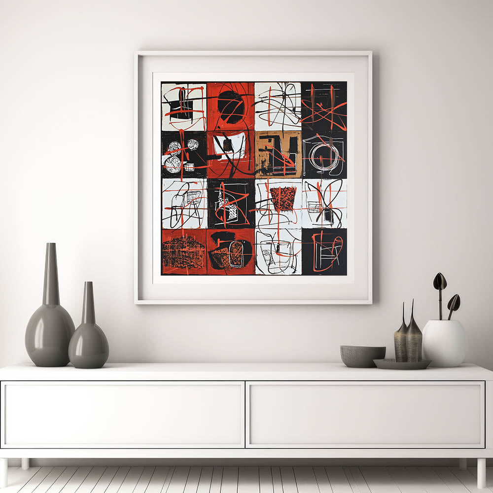 Bring energy and creativity into your space with this modern wall art, featuring a striking combination of red, black, white, and brown. The bold abstract composition, with expressive lines and geometric forms, makes this living room wall art a dynamic statement piece. Whether displayed as canvas wall art or framed wall art, this piece is perfect for those who appreciate abstract art pieces with a modern edge.