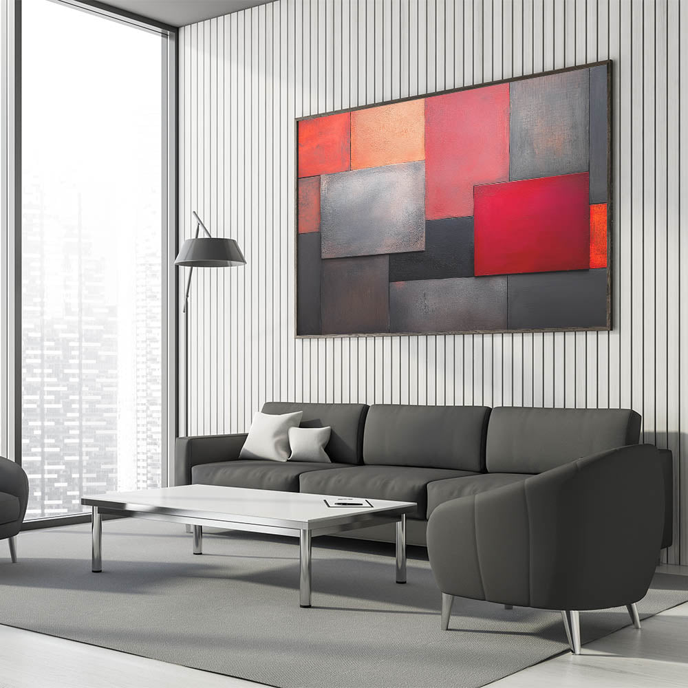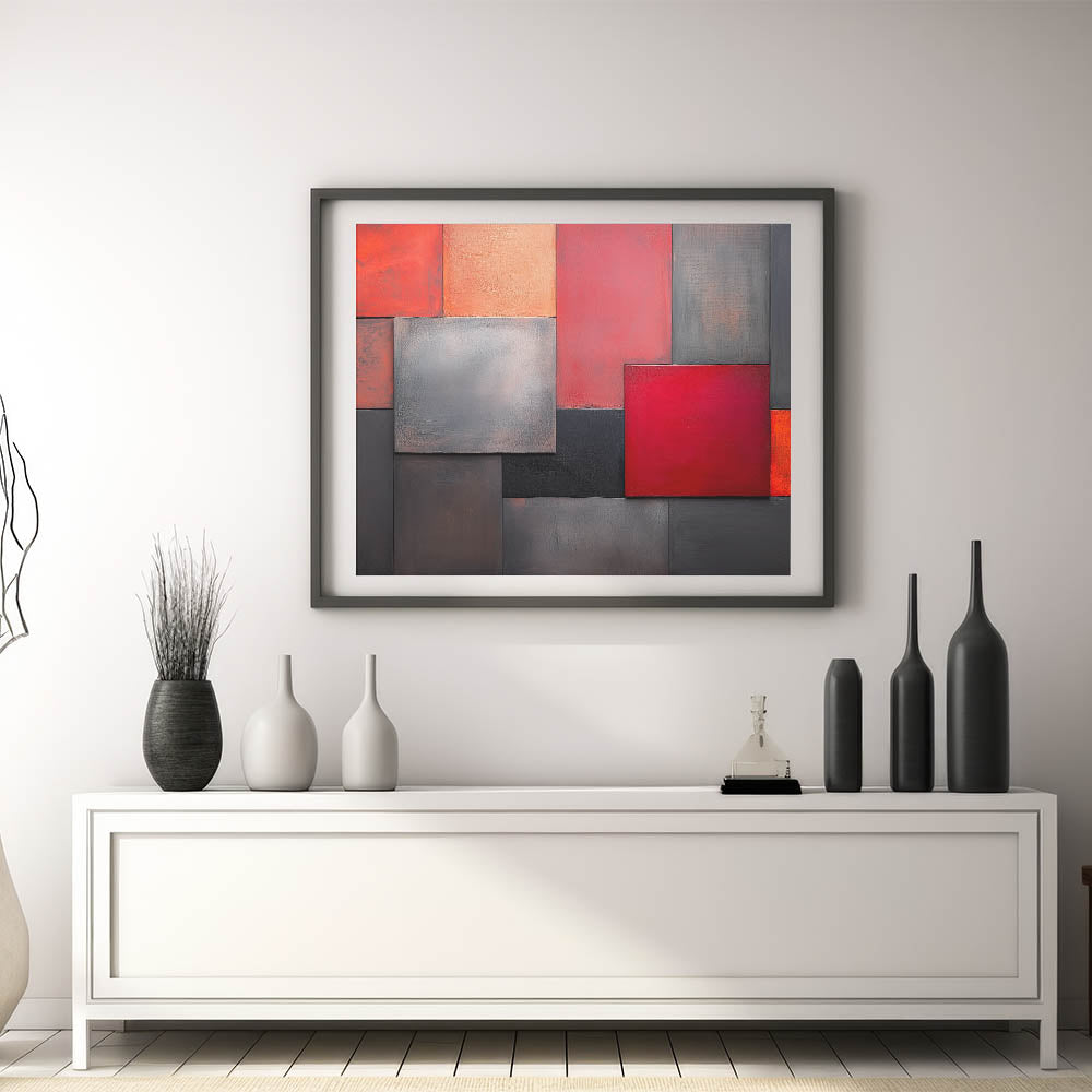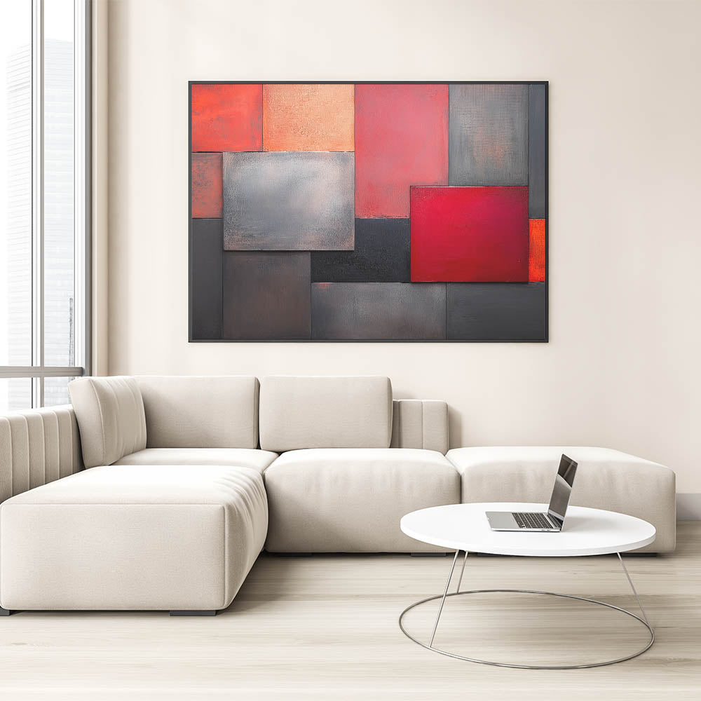 Make a powerful statement with this bold abstract wall art from our High-Contrast Abstracts collection. This structured grid of overlapping color blocks combines deep reds, burnt orange, charcoal black, and soft gray tones, bringing both balance and drama to your wall.
