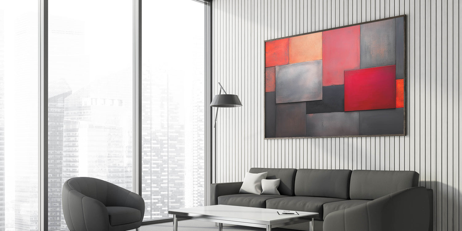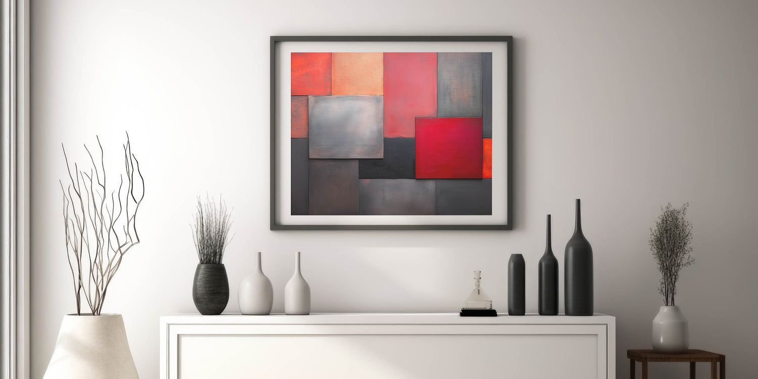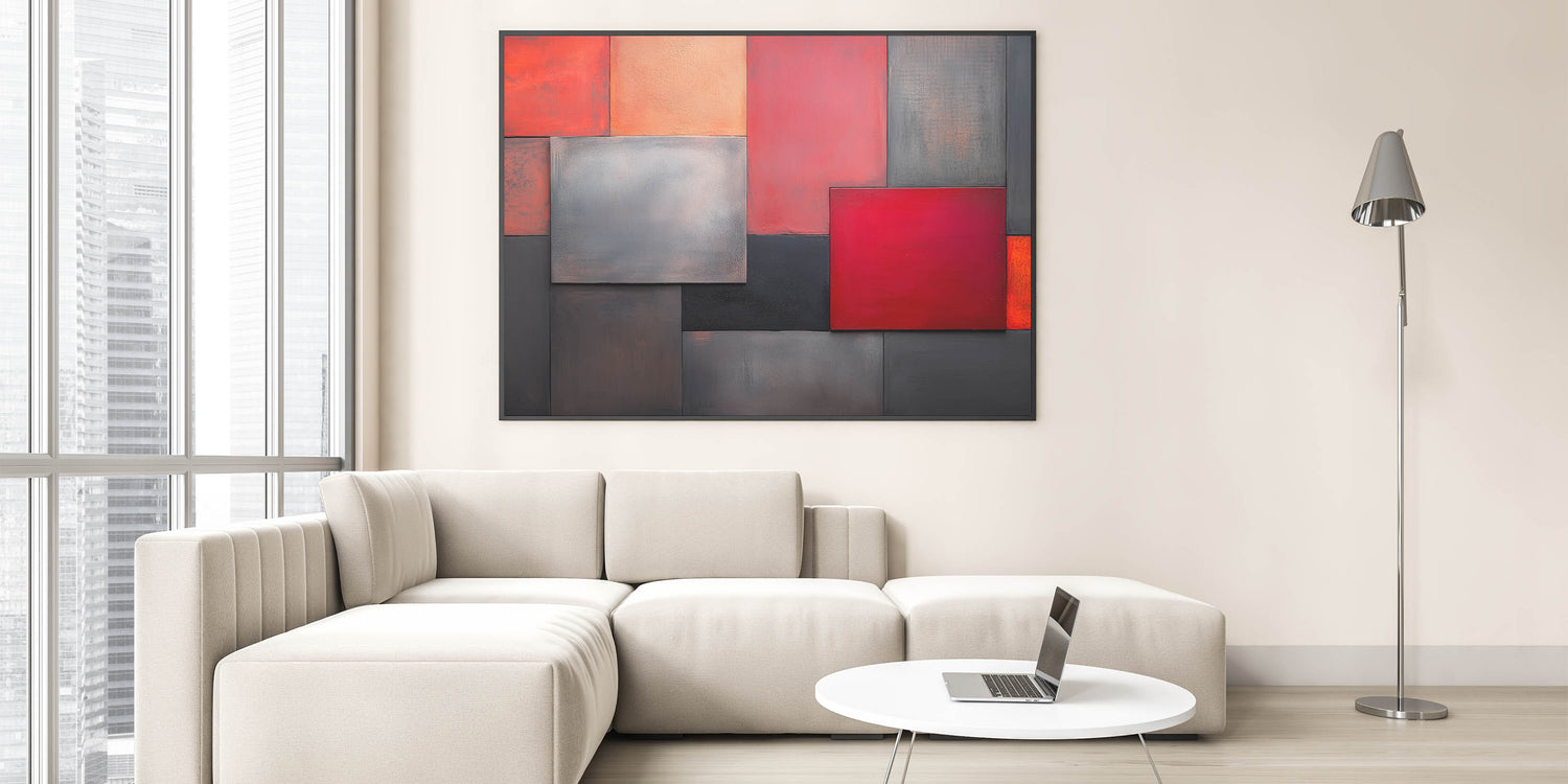 Make a powerful statement with this bold abstract wall art from our High-Contrast Abstracts collection. This structured grid of overlapping color blocks combines deep reds, burnt orange, charcoal black, and soft gray tones, bringing both balance and drama to your wall.