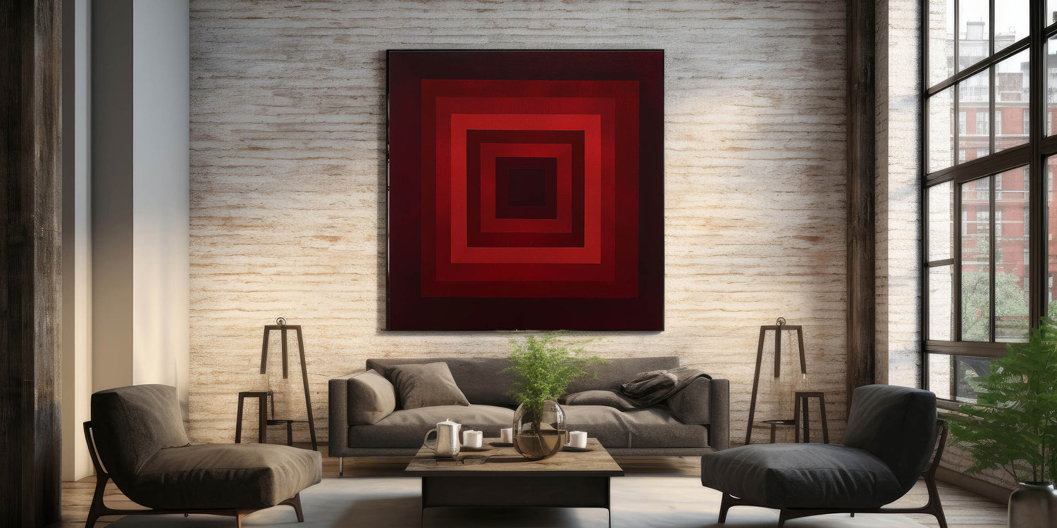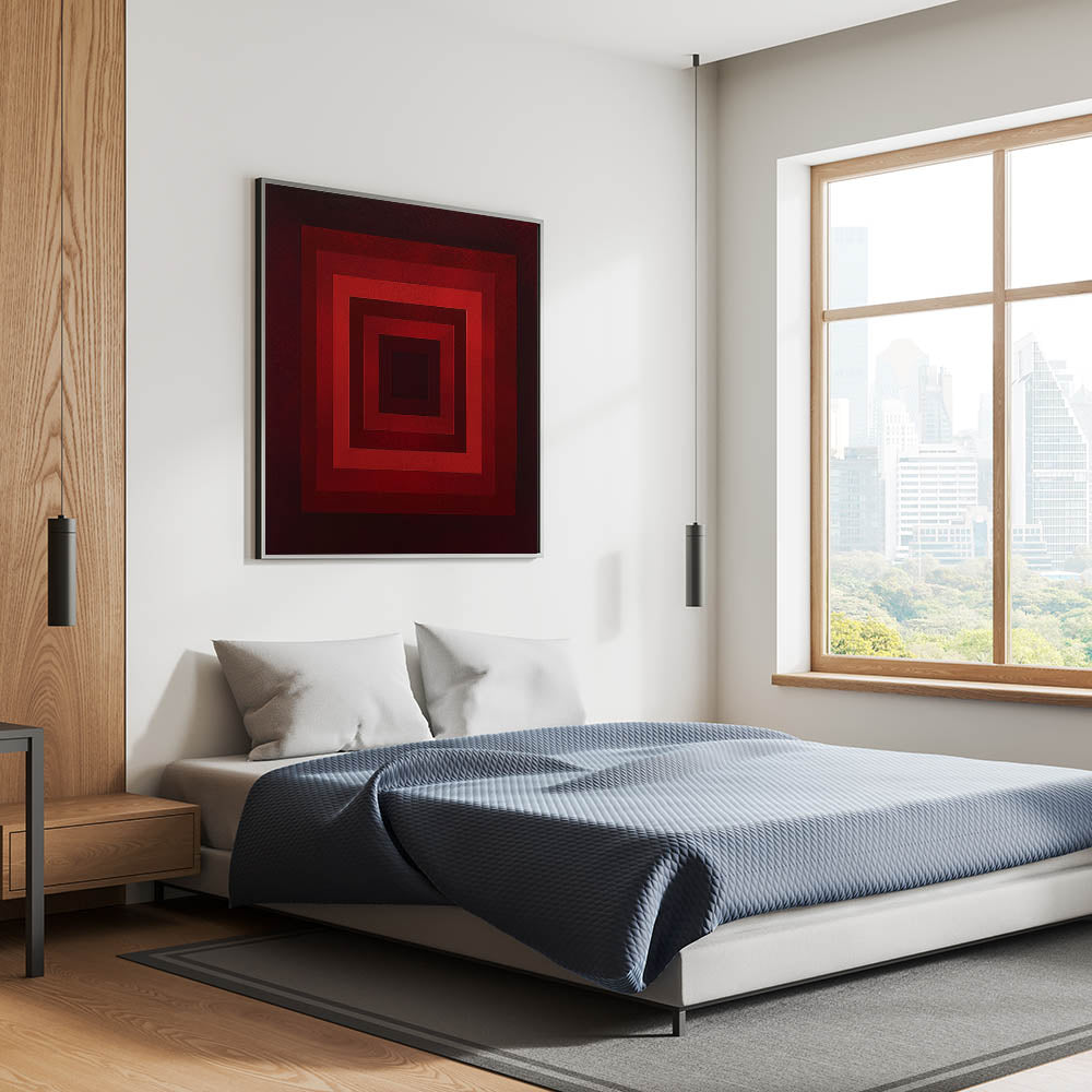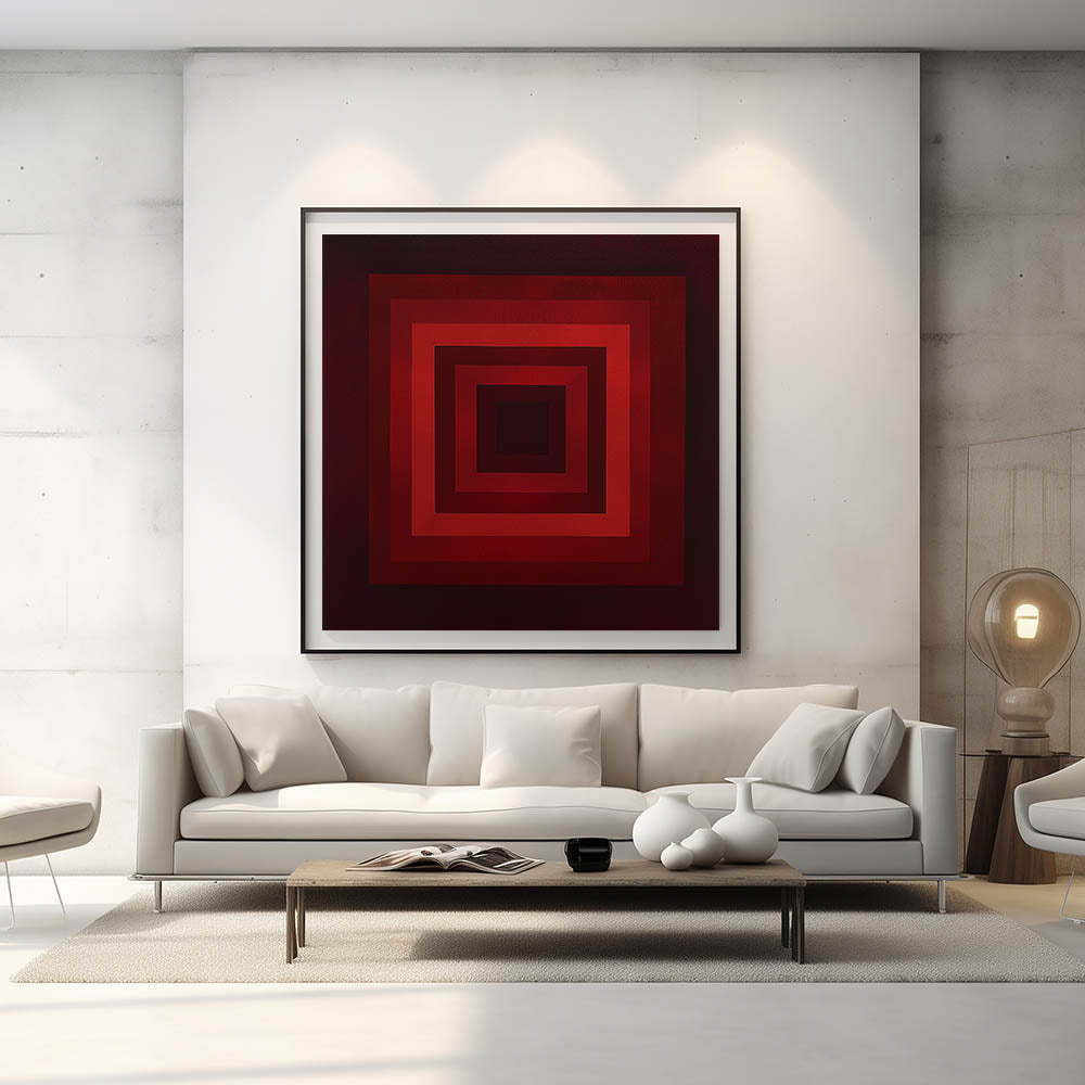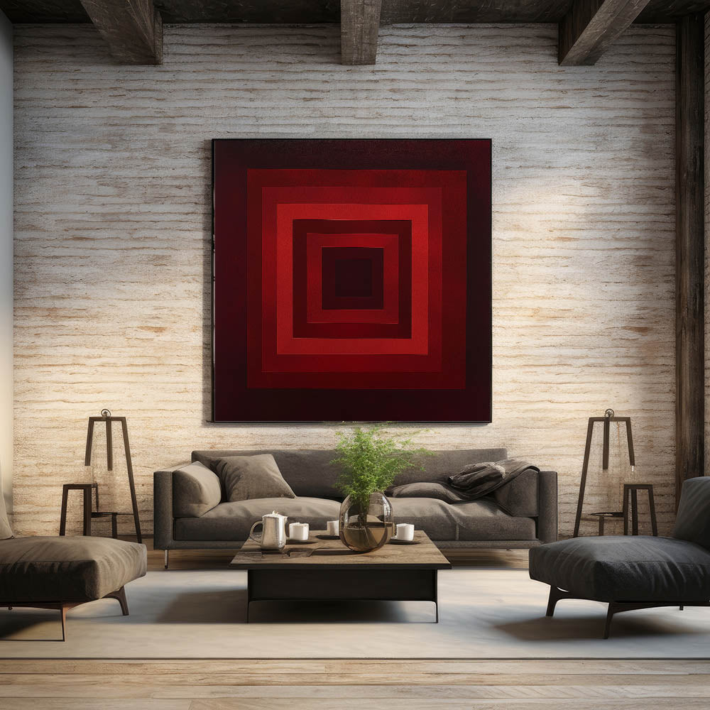 Make a powerful statement in your space with this modern wall art, featuring a striking composition of deep red, burgundy, and black geometric layers. This living room wall art is bold yet sophisticated, drawing attention with its abstract art pieces that create depth and contrast. Whether displayed as canvas wall art or framed wall art, this design is perfect for adding warmth and drama to modern living room decor.