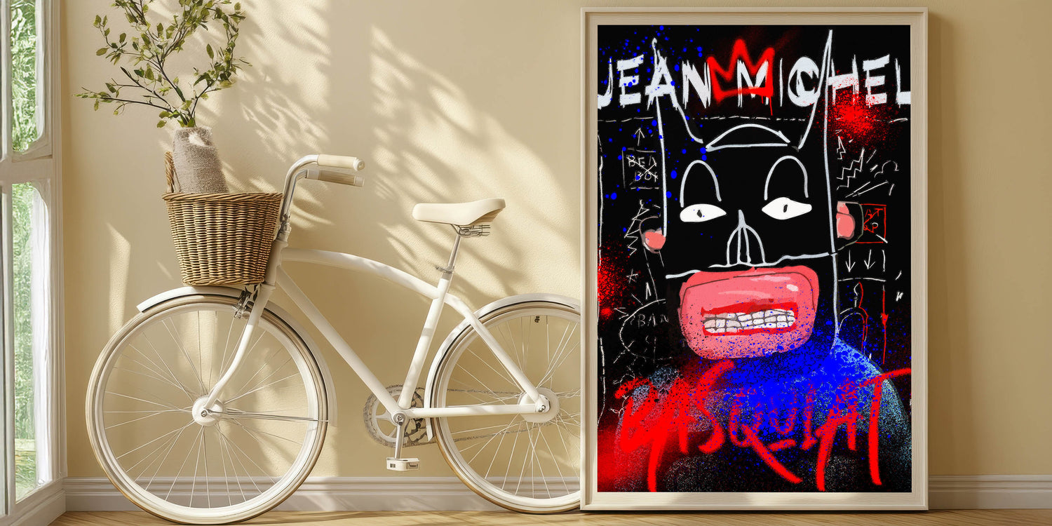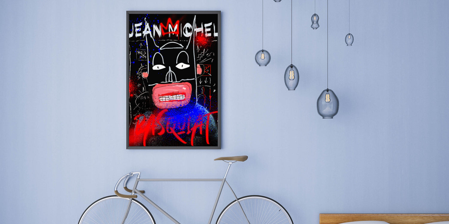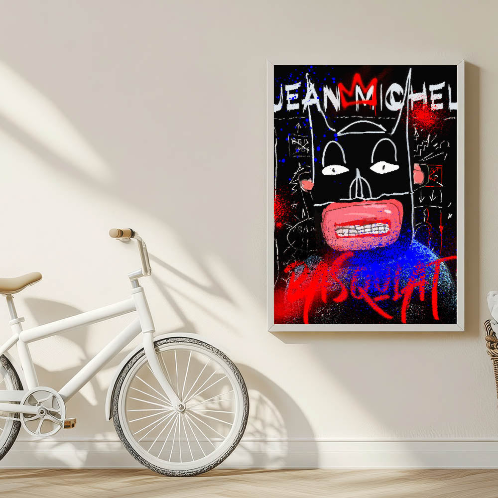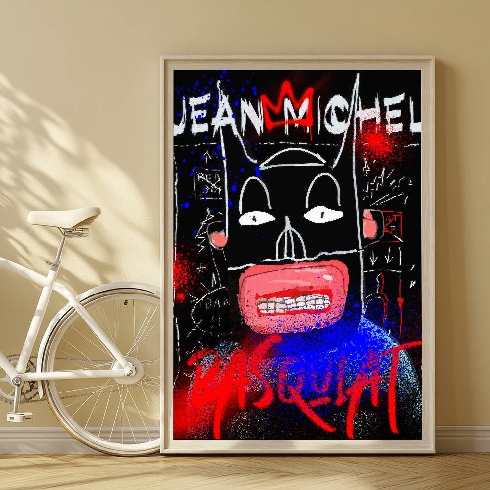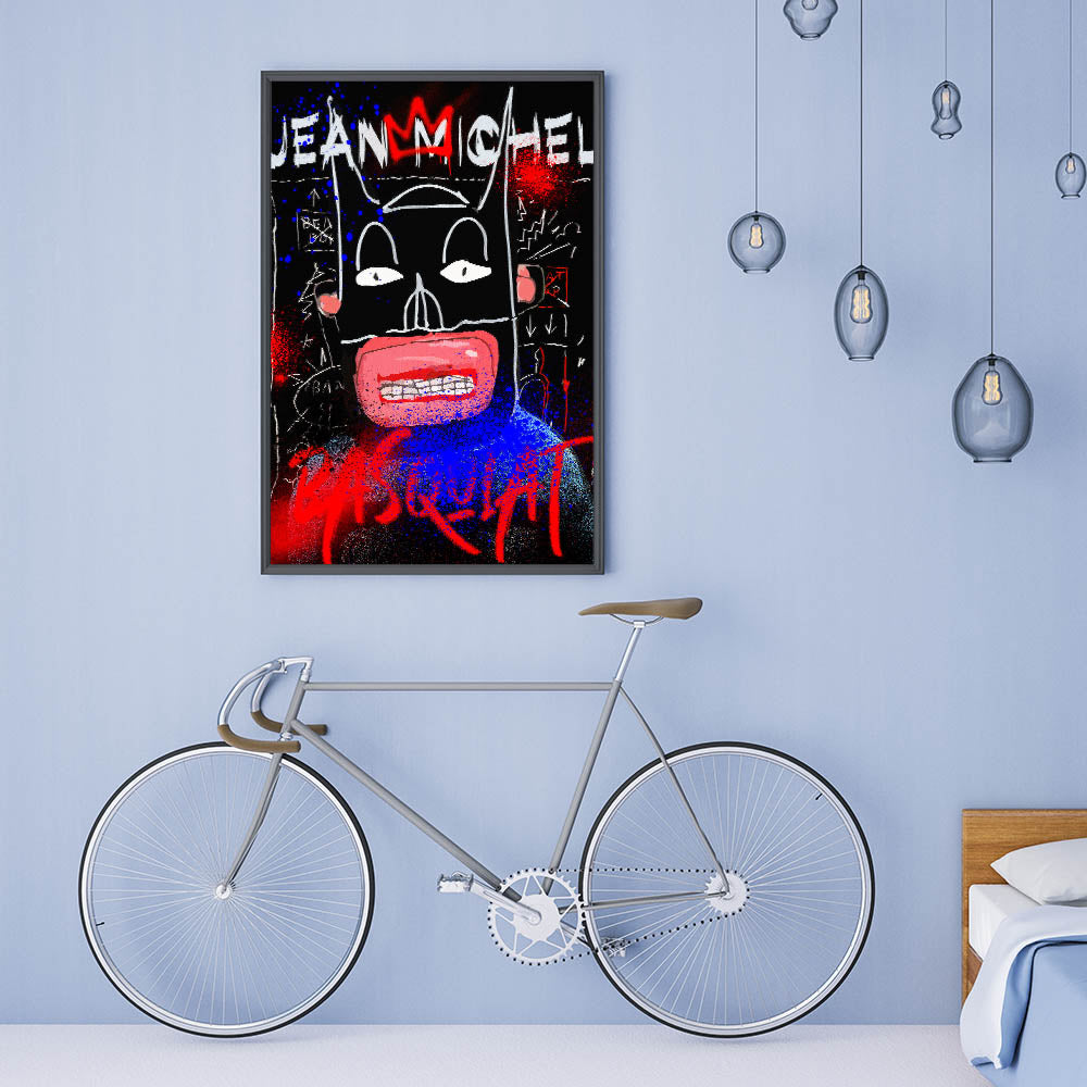 Make a powerful statement with this graffiti-inspired pop art wall art, featuring a bold portrait of a figure wearing a mask, with vibrant splashes of red and blue. The energetic design is a nod to Jean-Michel Basquiat's raw, expressive style, combining iconic symbols like crowns, chaotic text, and dynamic brushstrokes. This artwork captures the essence of modern street art with its rebellious aesthetic, making it the perfect addition to any contemporary space.