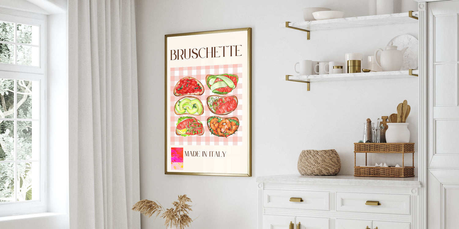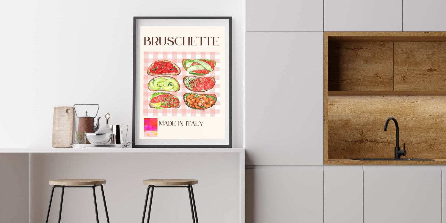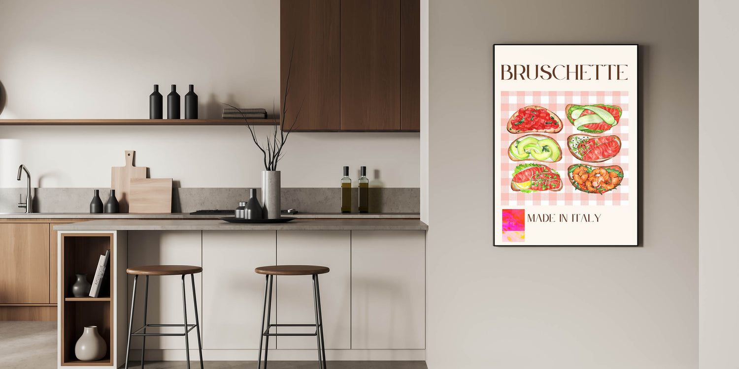 Celebrate the flavors of Italy with this bruschetta food wall art, a vibrant and artistic depiction of one of the most beloved appetizers. This kitchen wall art showcases a collection of beautifully illustrated bruschetta varieties, including fresh tomatoes, salmon, avocado, shrimp, and microgreens, all arranged on a charming checkered background. Perfect for food lovers, home chefs, and anyone who appreciates culinary wall art, this piece adds a fresh and inviting feel to any space.