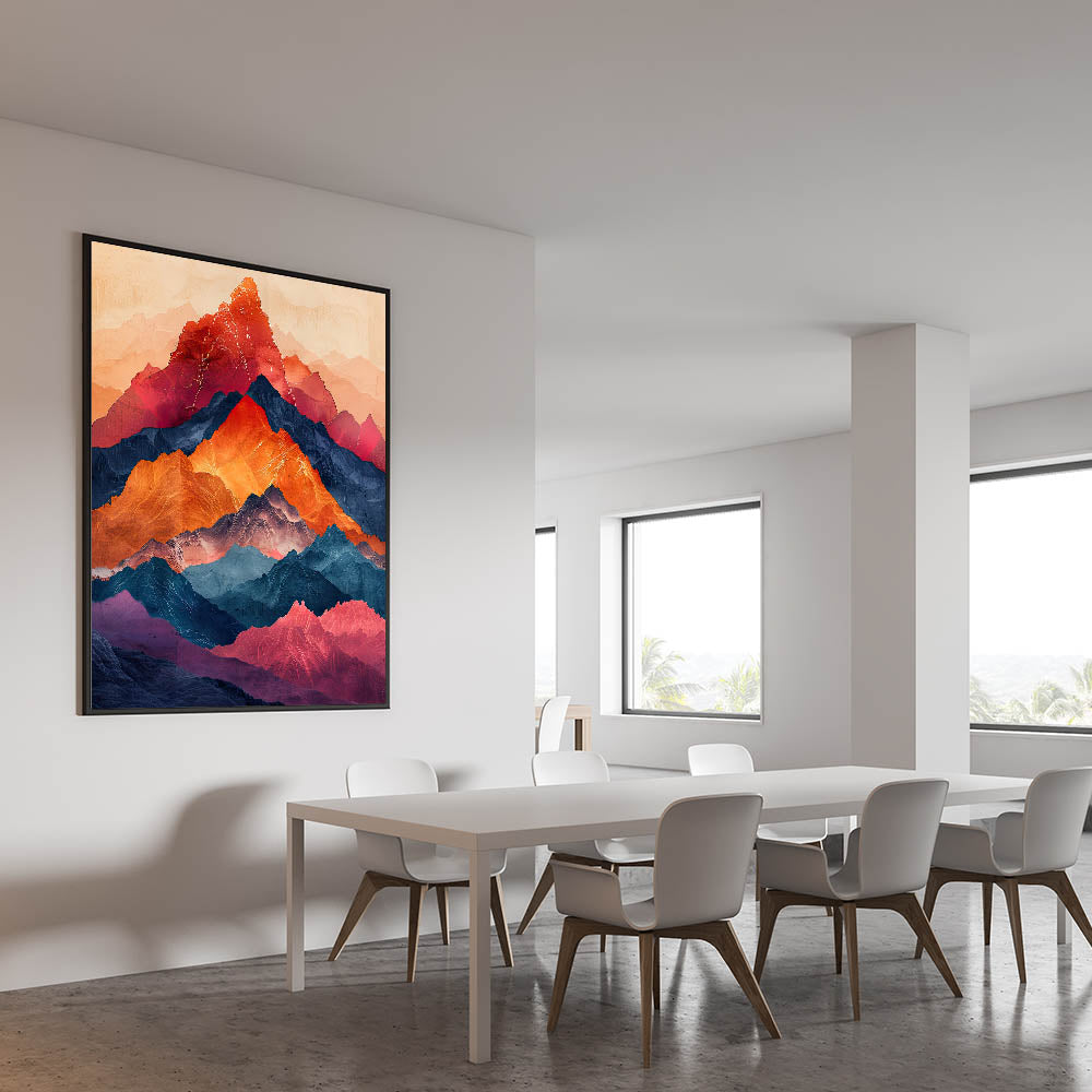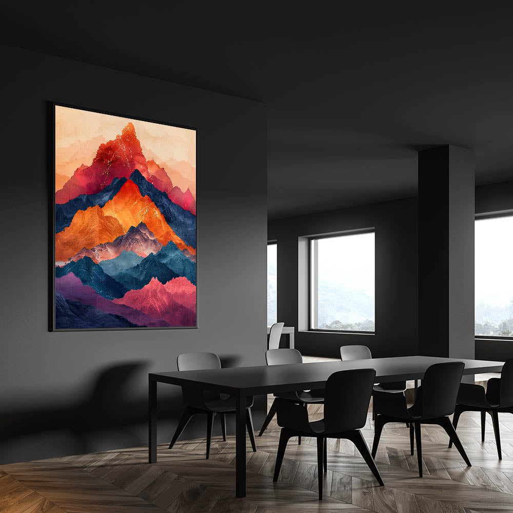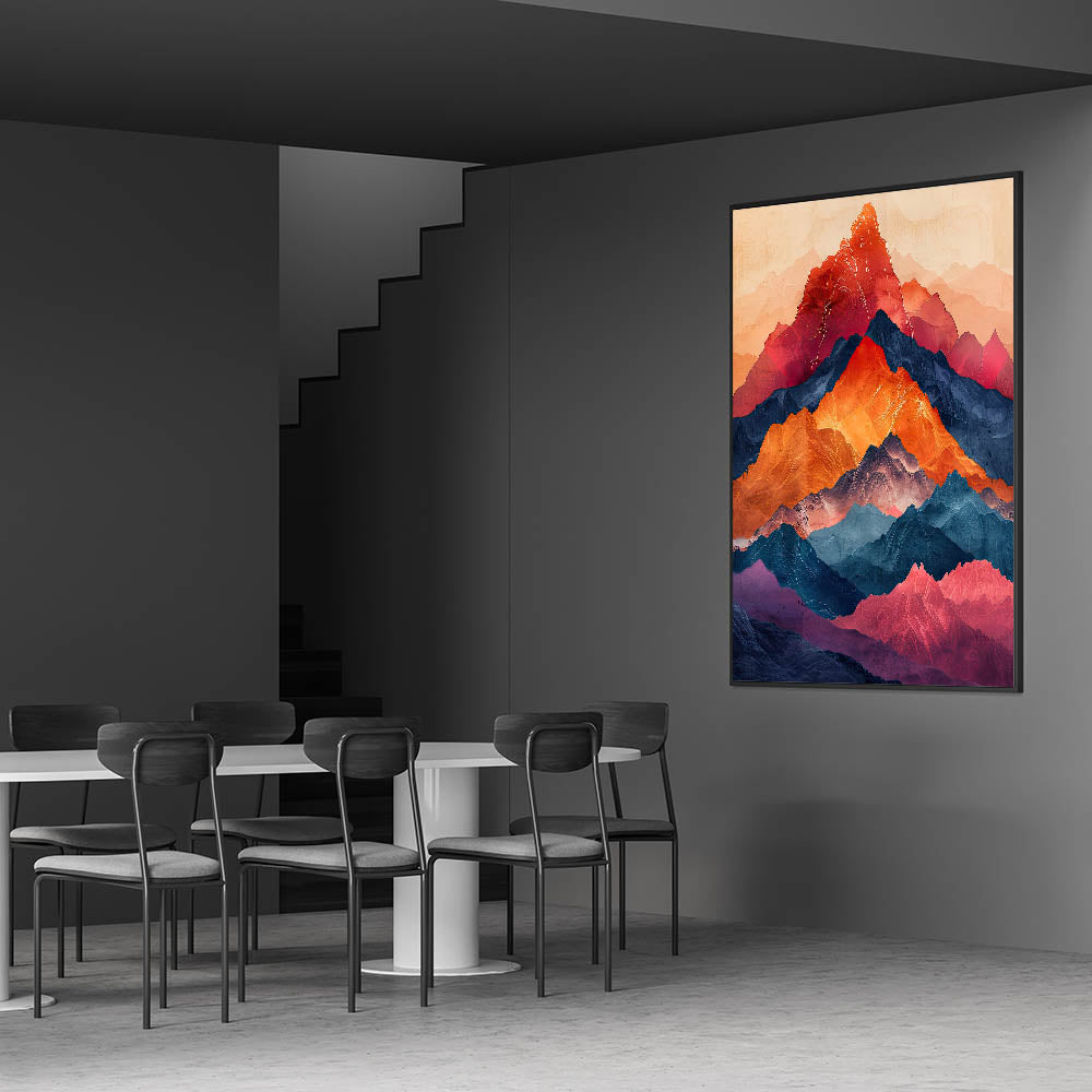 Bring the beauty of nature into your dining space with this elegant dining room wall art, featuring a breathtaking multicolor mountain landscape. Rich hues of red, orange, deep blue, and violet create a striking contrast, making this artwork a bold statement piece. The layered mountain peaks give a sense of depth and movement, making it a perfect choice for modern and nature-inspired interiors.