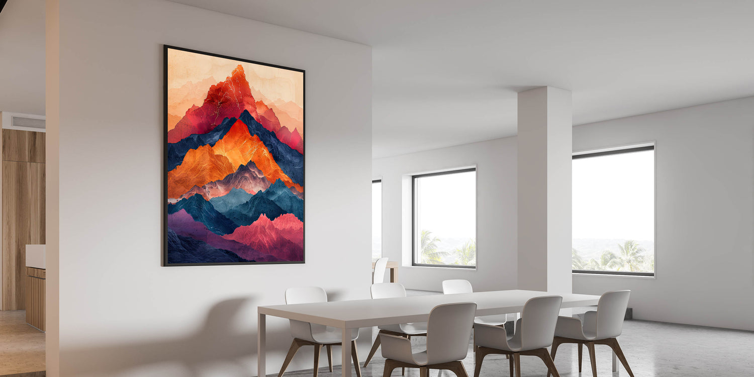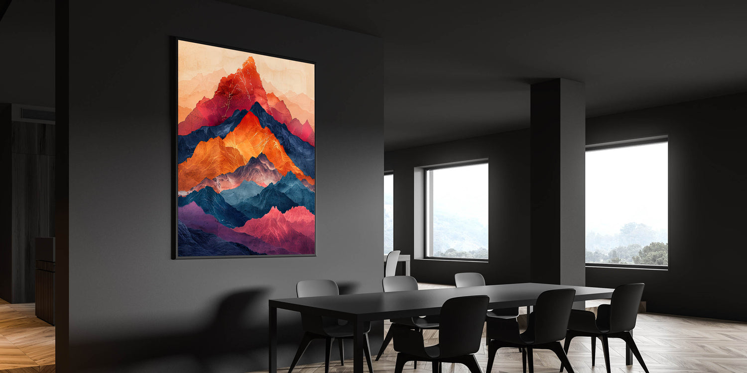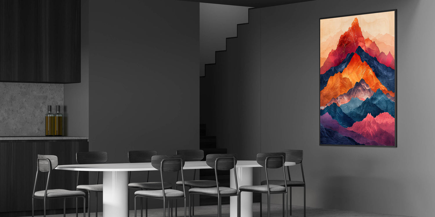 Bring the beauty of nature into your dining space with this elegant dining room wall art, featuring a breathtaking multicolor mountain landscape. Rich hues of red, orange, deep blue, and violet create a striking contrast, making this artwork a bold statement piece. The layered mountain peaks give a sense of depth and movement, making it a perfect choice for modern and nature-inspired interiors.