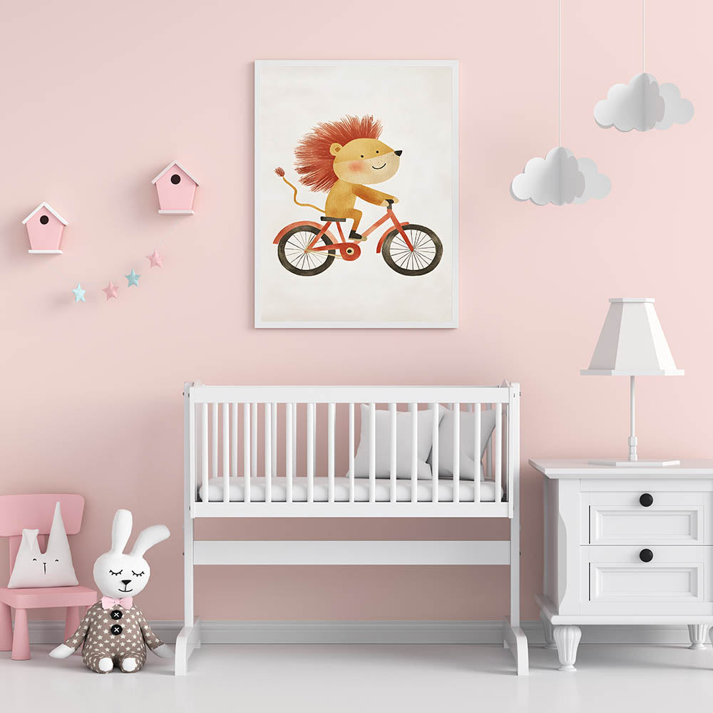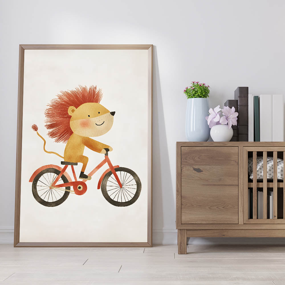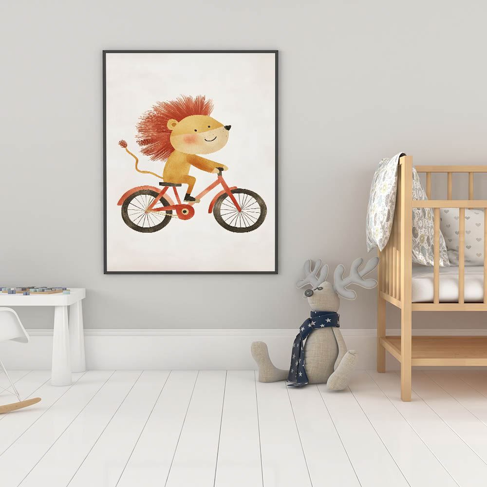 Bring adventure and fun into your child’s space with this Lion on Bicycle Nursery Wall Art. Featuring an adorable lion with a fluffy mane riding a vintage-style red bicycle, this artwork adds a playful and energetic touch to baby room decor and children’s wall art collections. The warm color palette of beige, brown, and red creates a cozy and inviting atmosphere for little explorers.