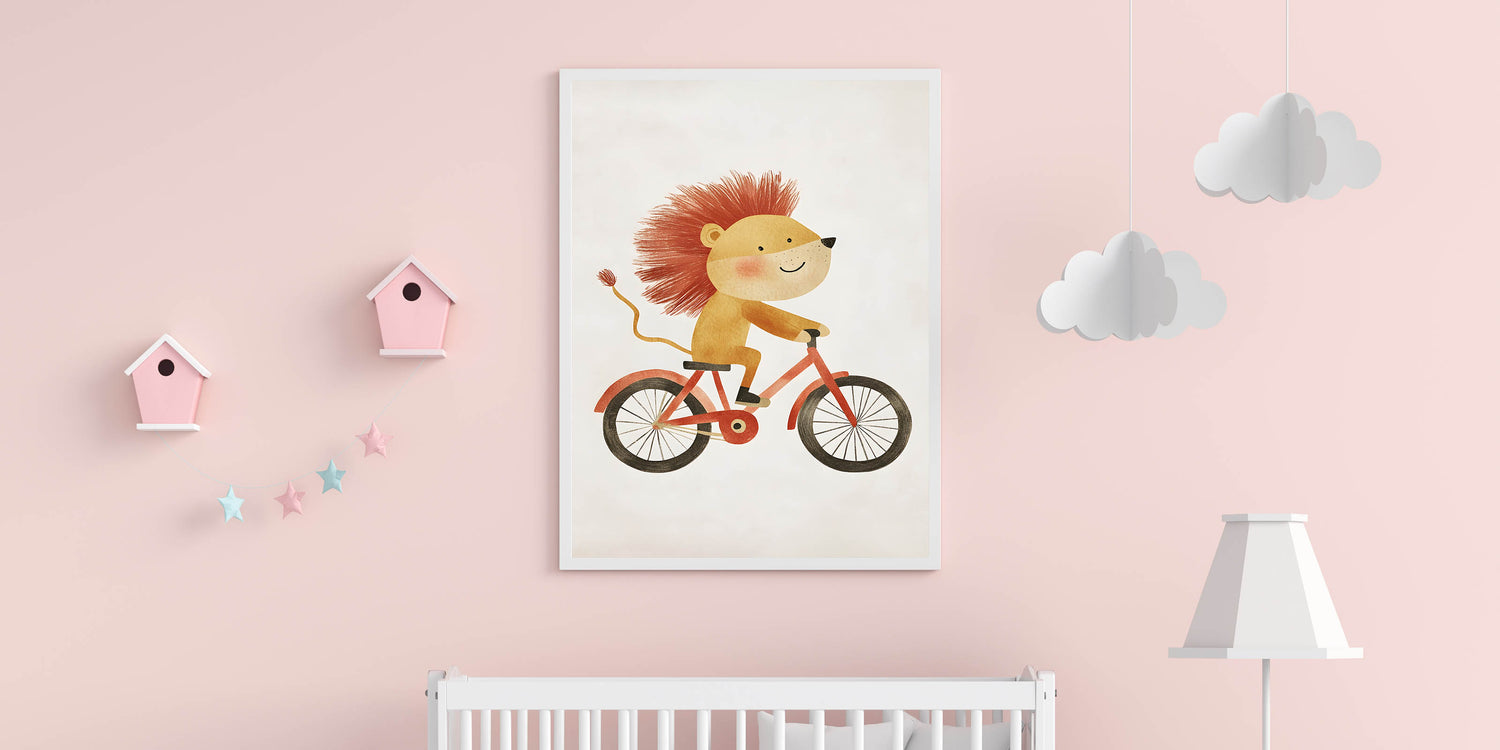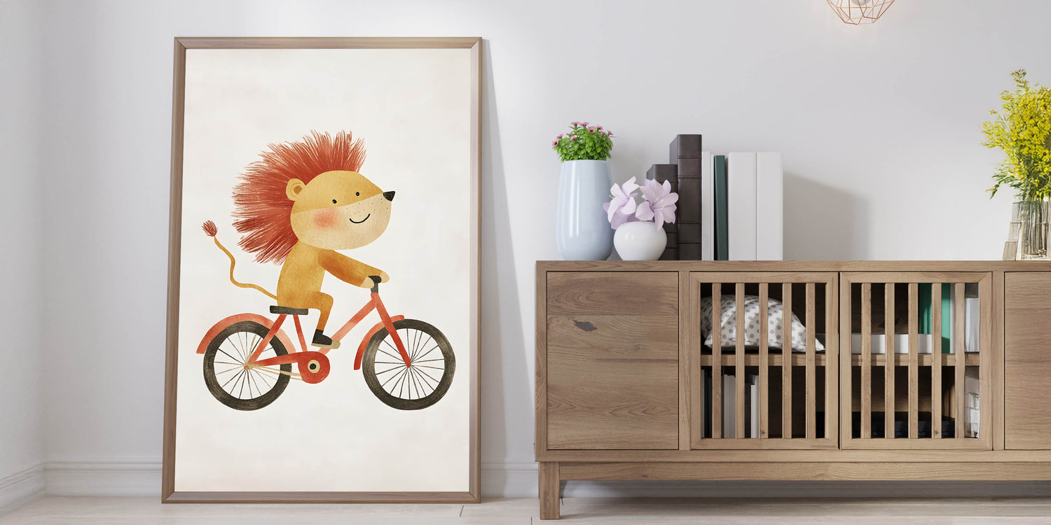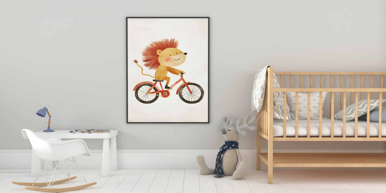 Bring adventure and fun into your child’s space with this Lion on Bicycle Nursery Wall Art. Featuring an adorable lion with a fluffy mane riding a vintage-style red bicycle, this artwork adds a playful and energetic touch to baby room decor and children’s wall art collections. The warm color palette of beige, brown, and red creates a cozy and inviting atmosphere for little explorers.