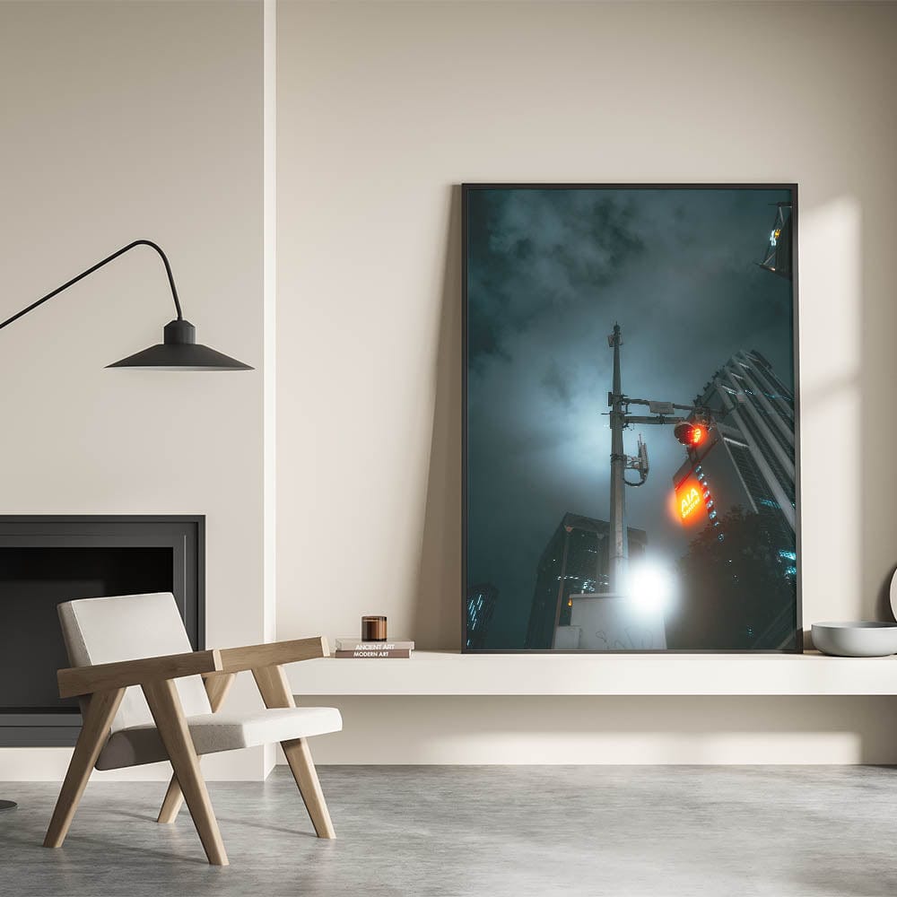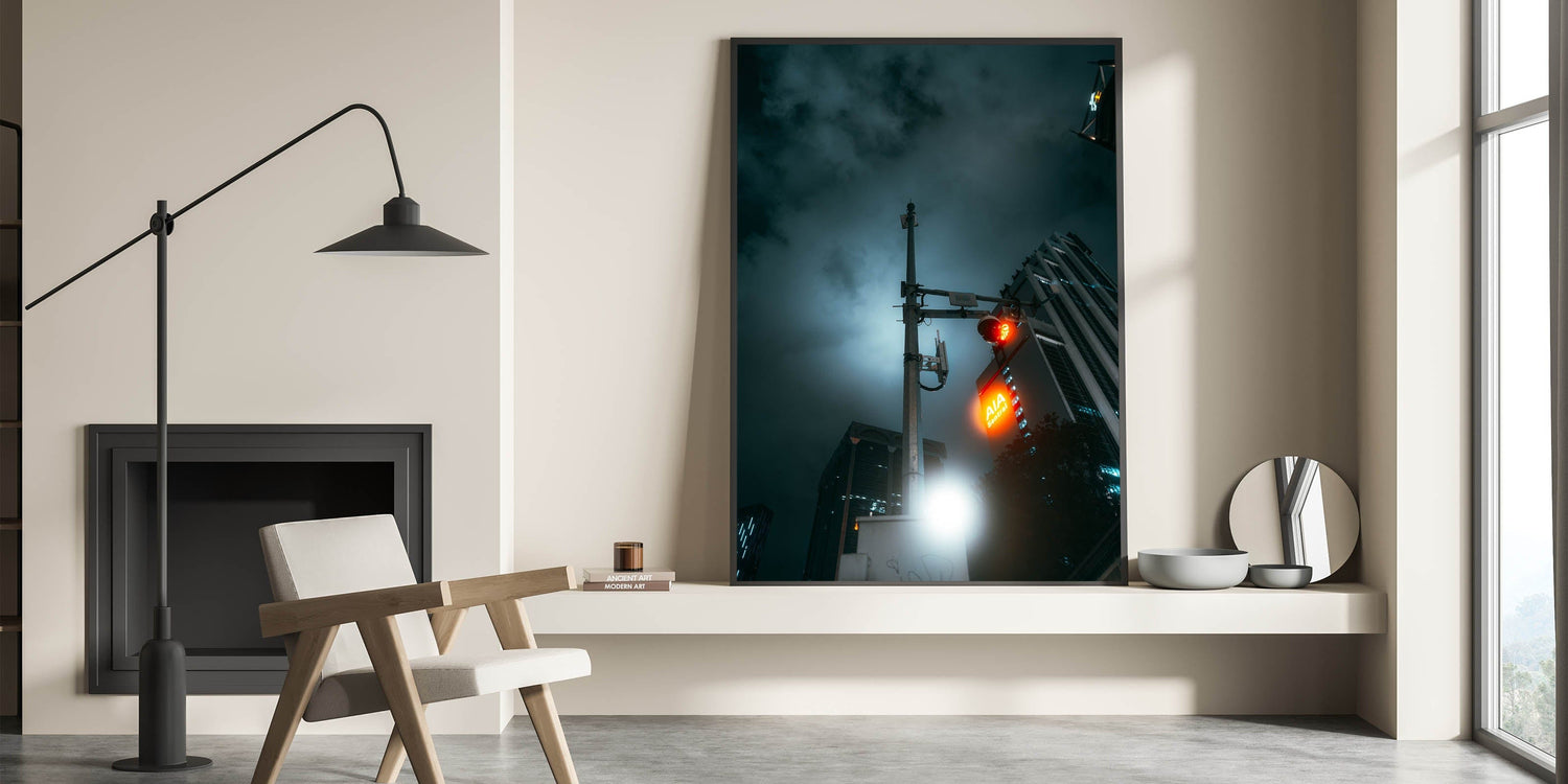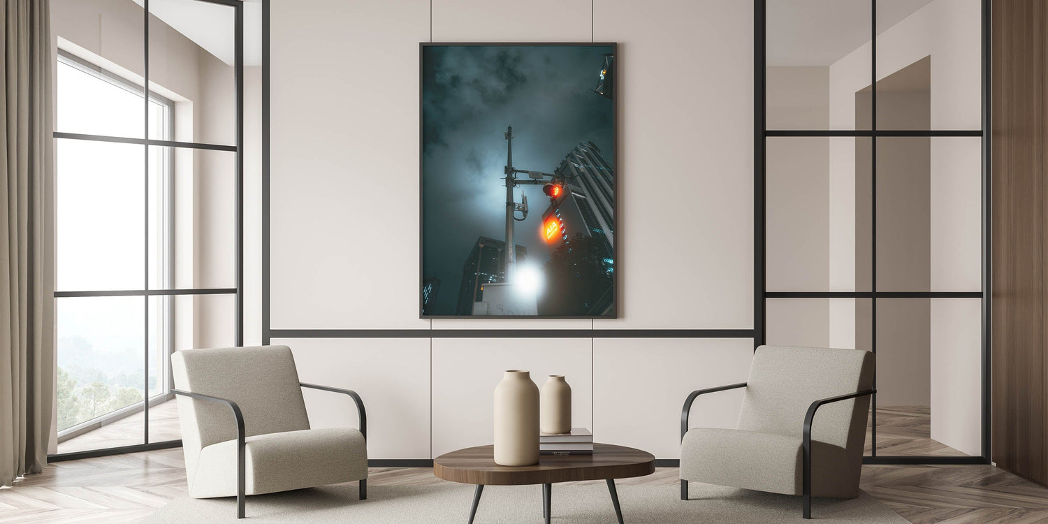 Step into a futuristic vision of the city with these captivating cityscape photography prints. This moody night shot features a glowing red traffic light, urban skyscrapers, and a hauntingly lit sky—perfectly capturing the mystery and energy of late-night city life. The dramatic lighting and sleek composition transform this ordinary street view into powerful urban scenery wall art.