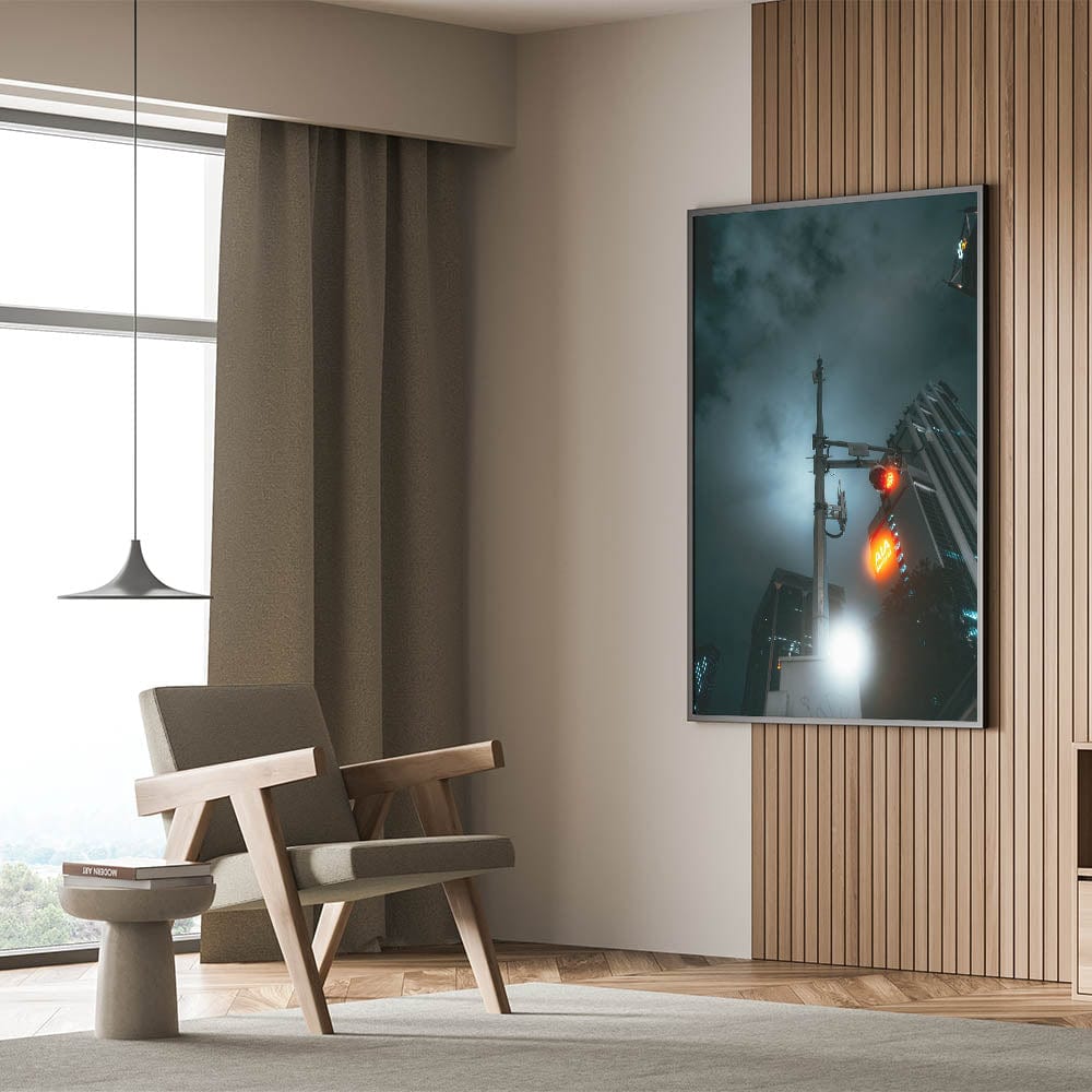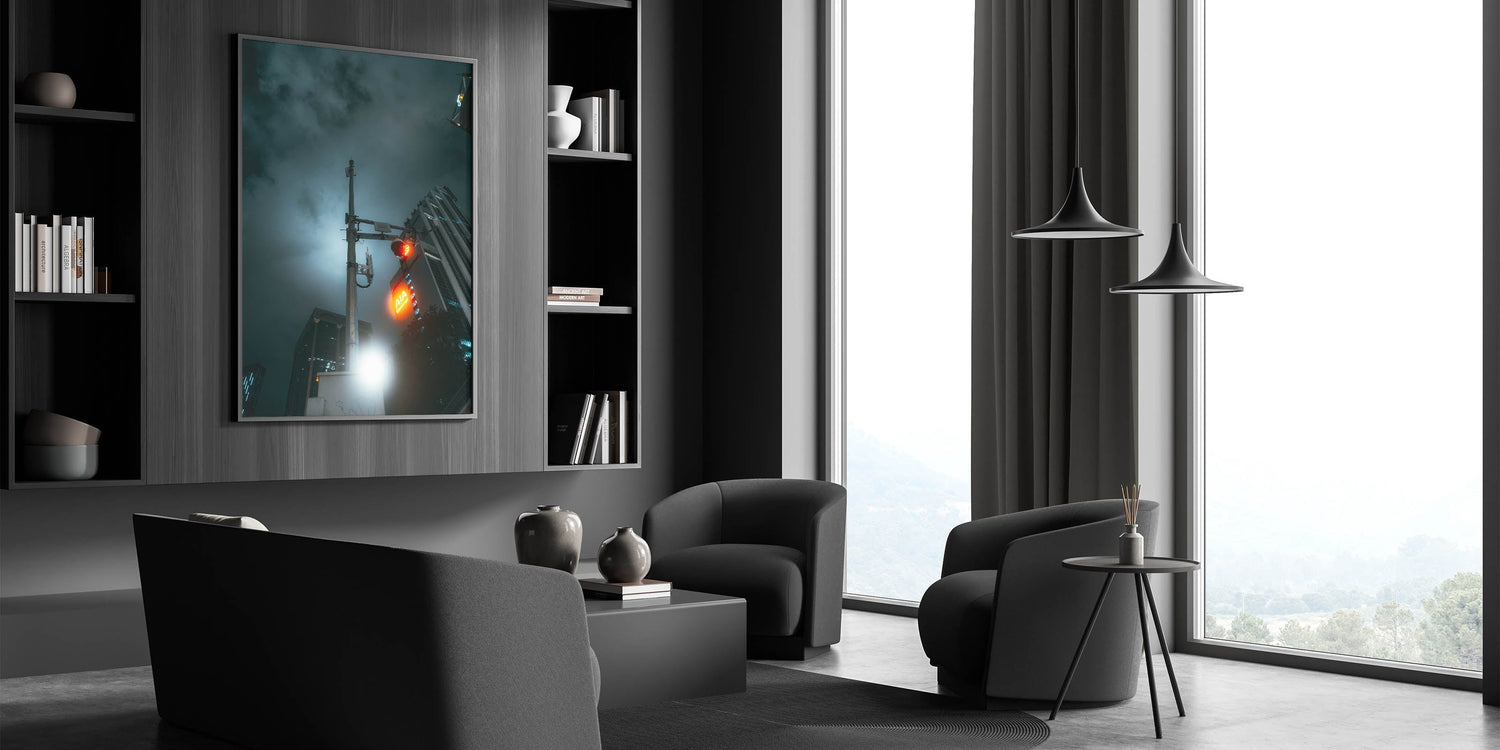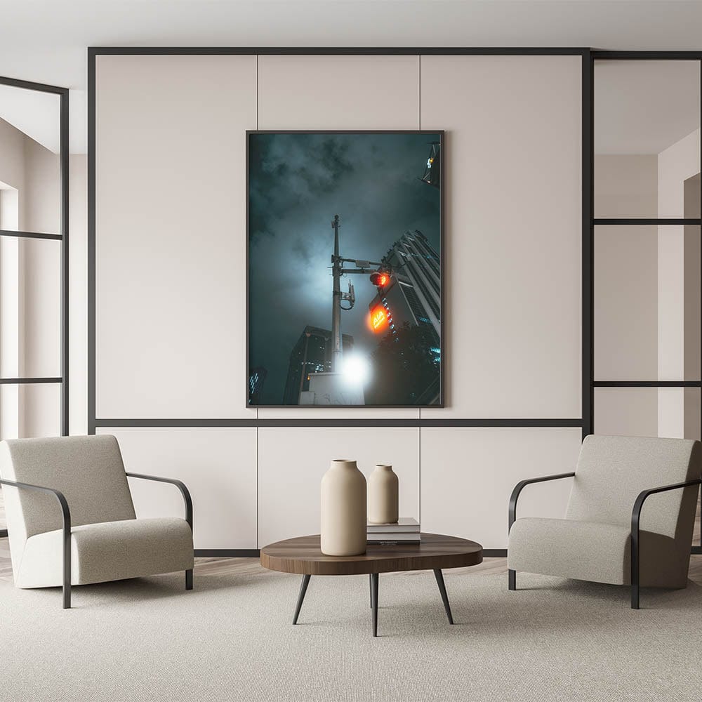 Step into a futuristic vision of the city with these captivating cityscape photography prints. This moody night shot features a glowing red traffic light, urban skyscrapers, and a hauntingly lit sky—perfectly capturing the mystery and energy of late-night city life. The dramatic lighting and sleek composition transform this ordinary street view into powerful urban scenery wall art.