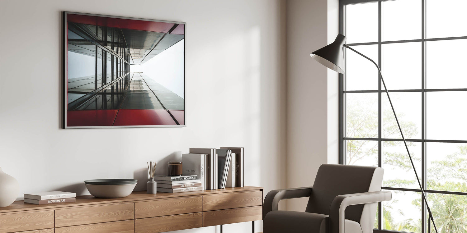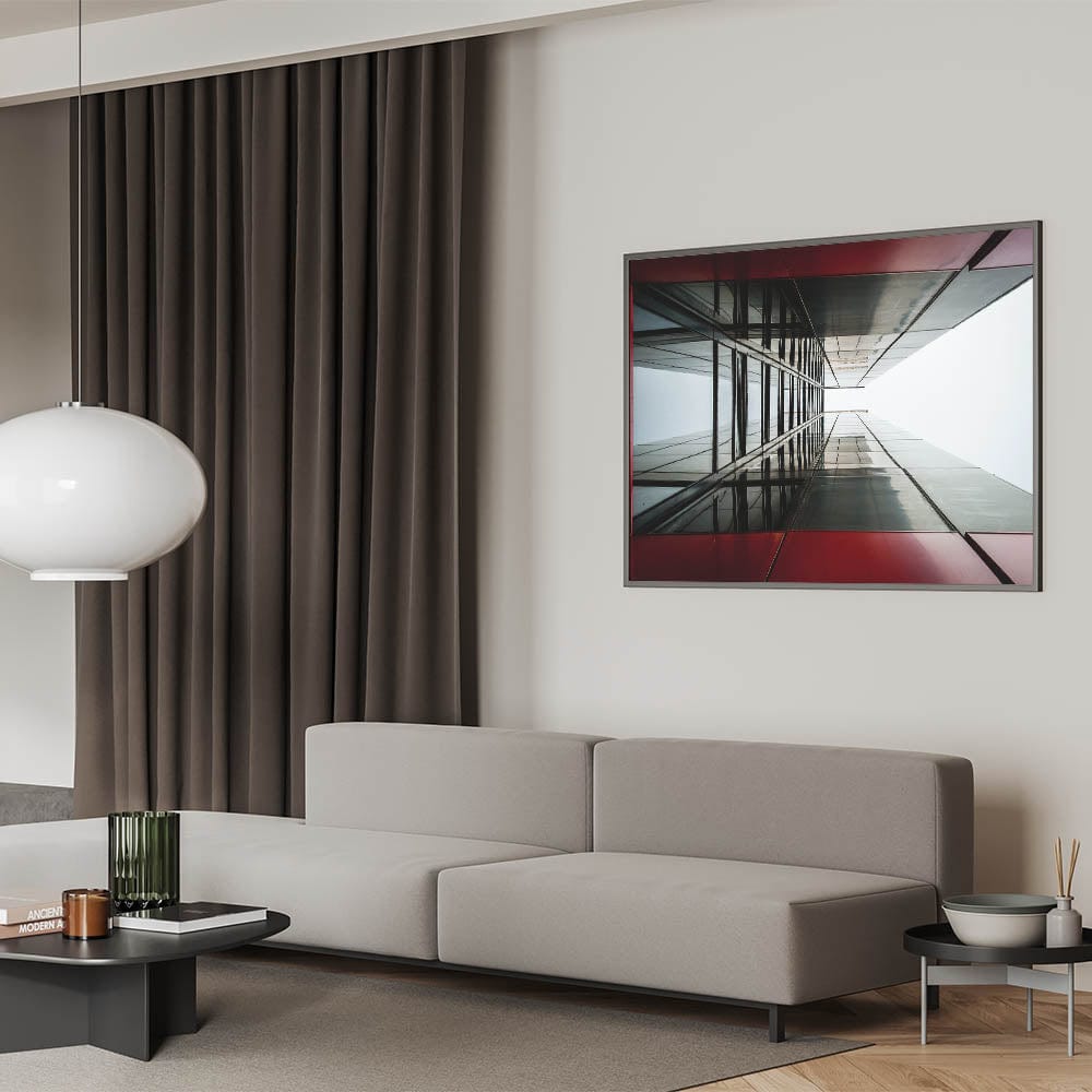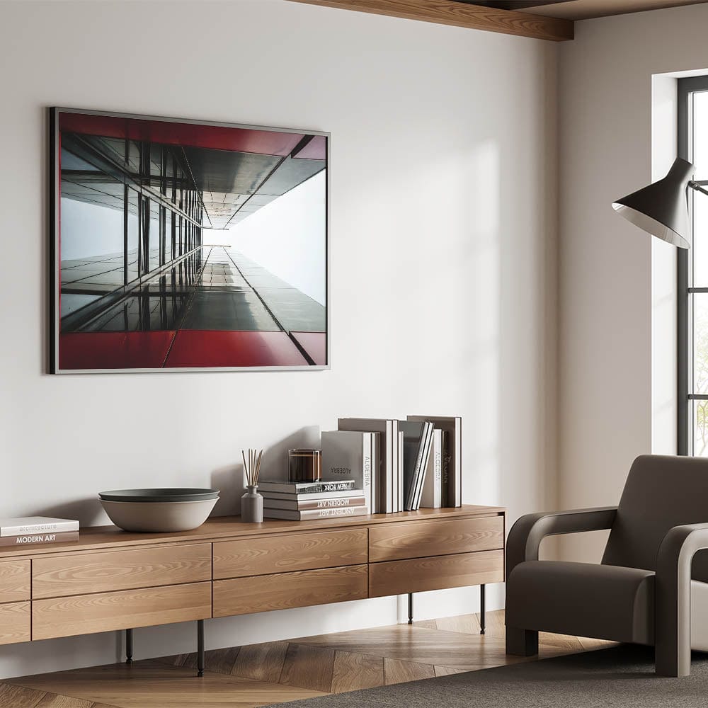 Bring a bold and dynamic urban aesthetic to your space with this striking cityscape photography print. Featuring a towering glass high-rise with vivid red architectural details, this piece captures the energy and sophistication of contemporary city life. A perfect addition for lovers of modern urban landscape art.