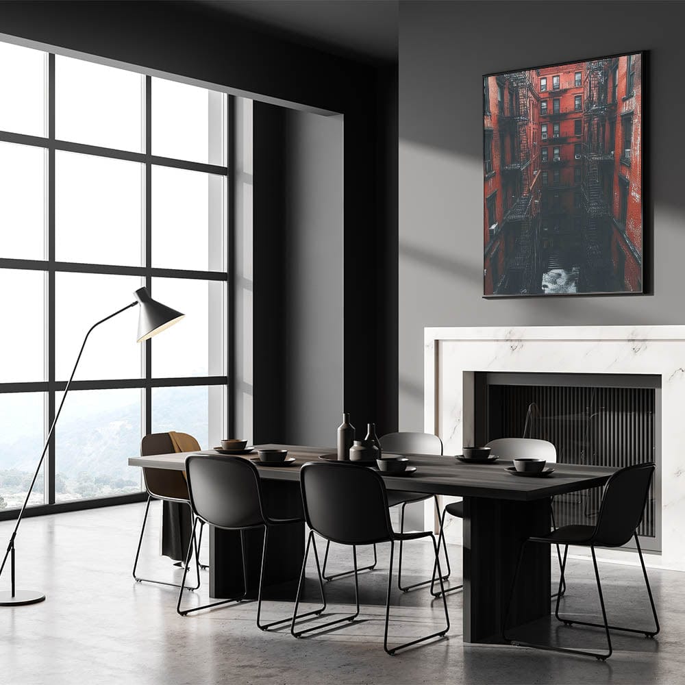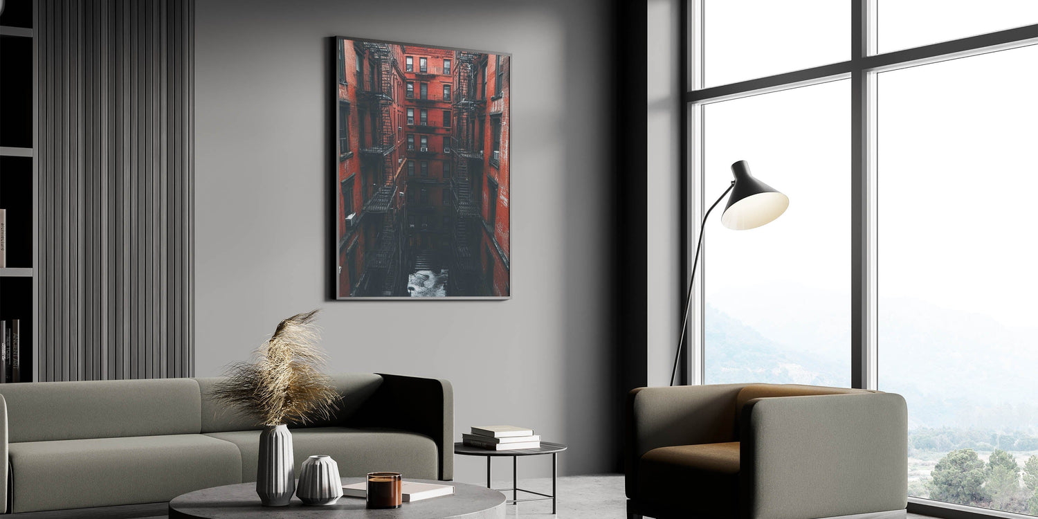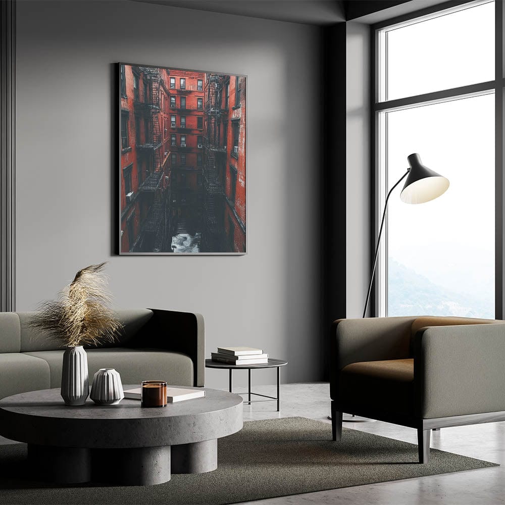 Step into the heart of the city with this bold and immersive example of cityscape photography prints. This image draws you into a towering red-brick courtyard, lined with classic fire escapes and deep shadows. It's a cinematic, textured view of timeless urban life—where architecture becomes the main character.