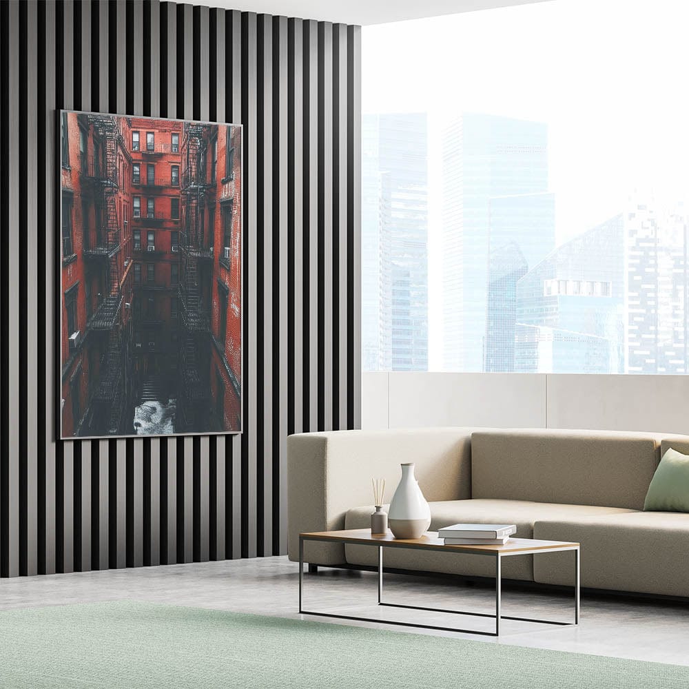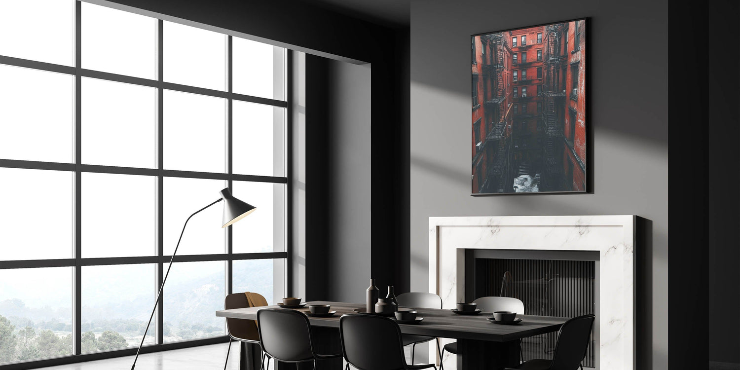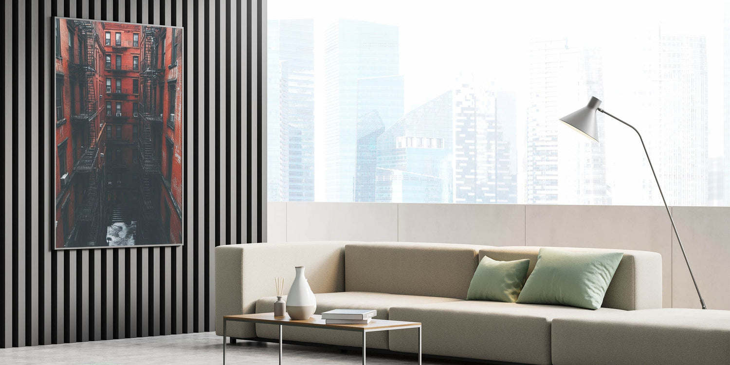 Step into the heart of the city with this bold and immersive example of cityscape photography prints. This image draws you into a towering red-brick courtyard, lined with classic fire escapes and deep shadows. It's a cinematic, textured view of timeless urban life—where architecture becomes the main character.