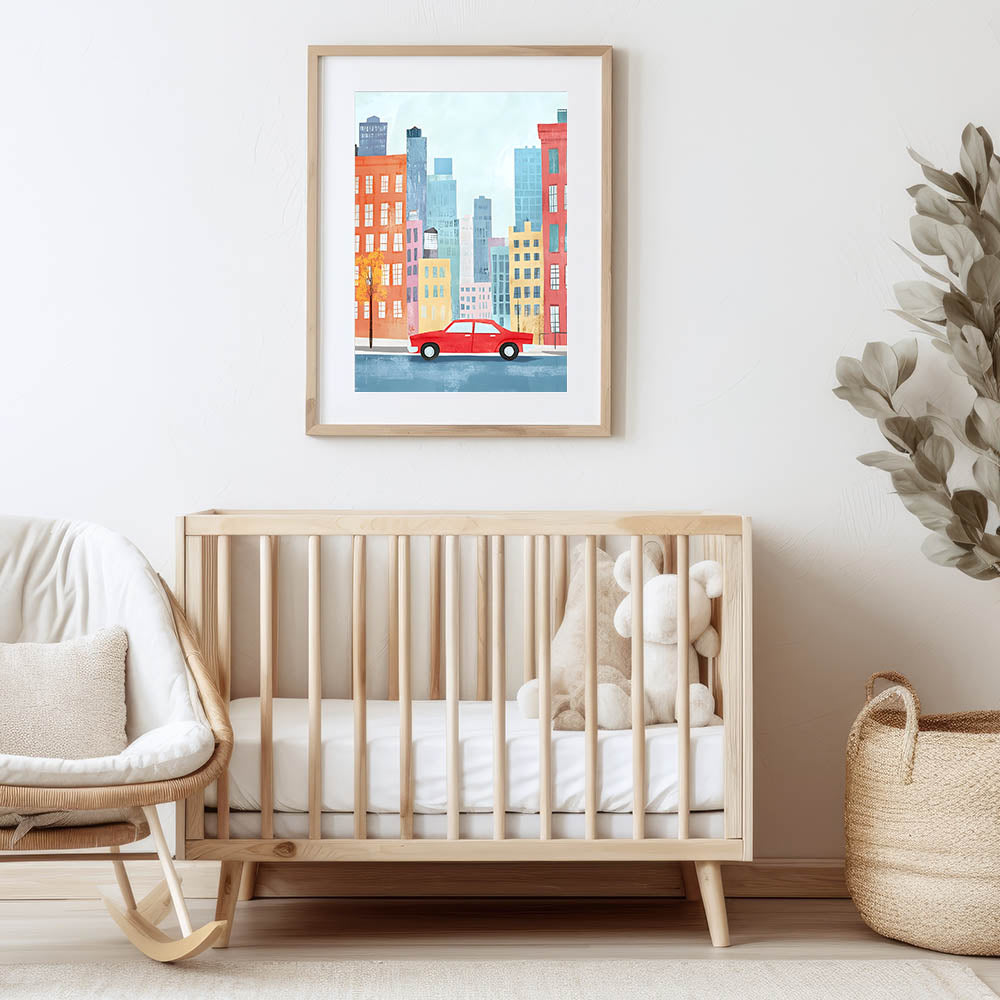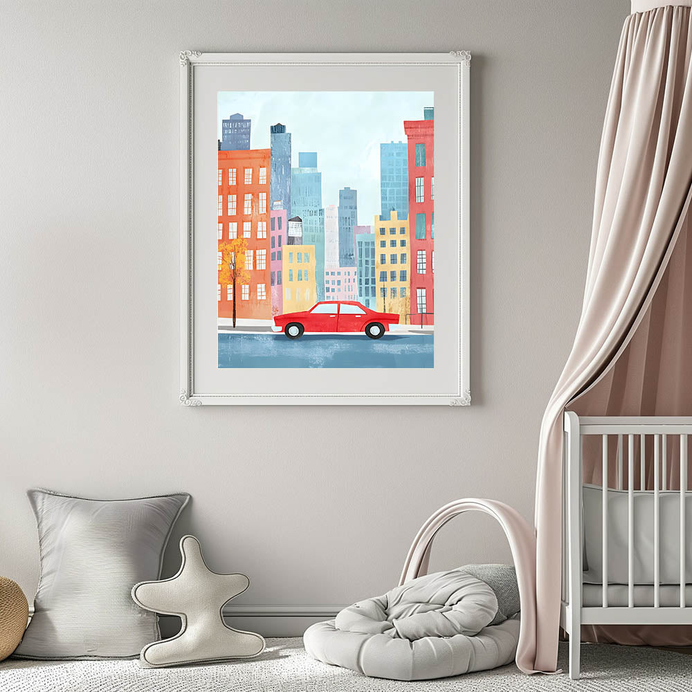 Transform your child’s space with this Cityscape Red Car Nursery Wall Art. This eye-catching illustration features a whimsical city skyline with tall, colorful buildings in shades of blue, orange, yellow, and red. A vintage red car drives through the lively streets, creating a fun and adventurous vibe for baby room decor and children’s wall art collections.