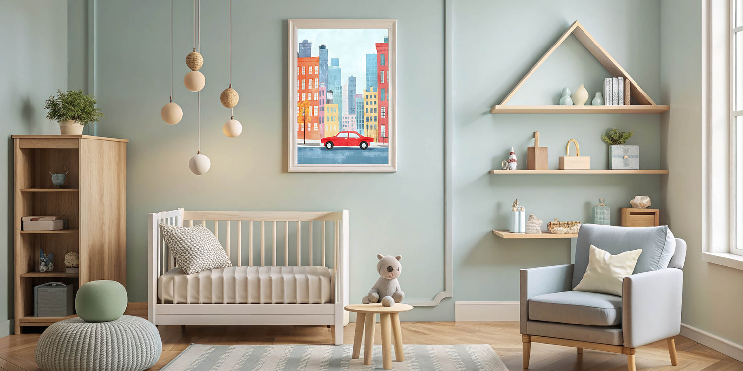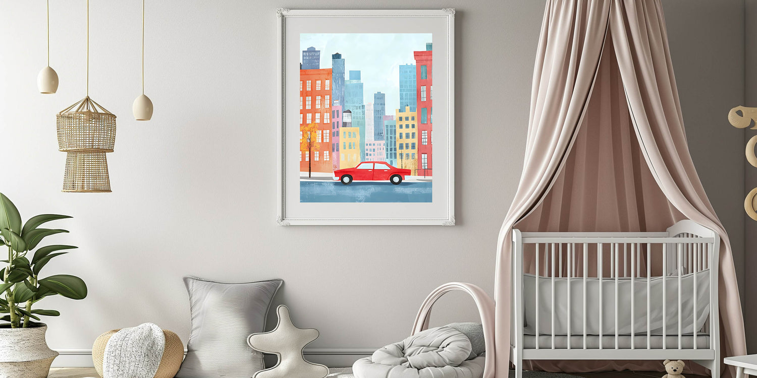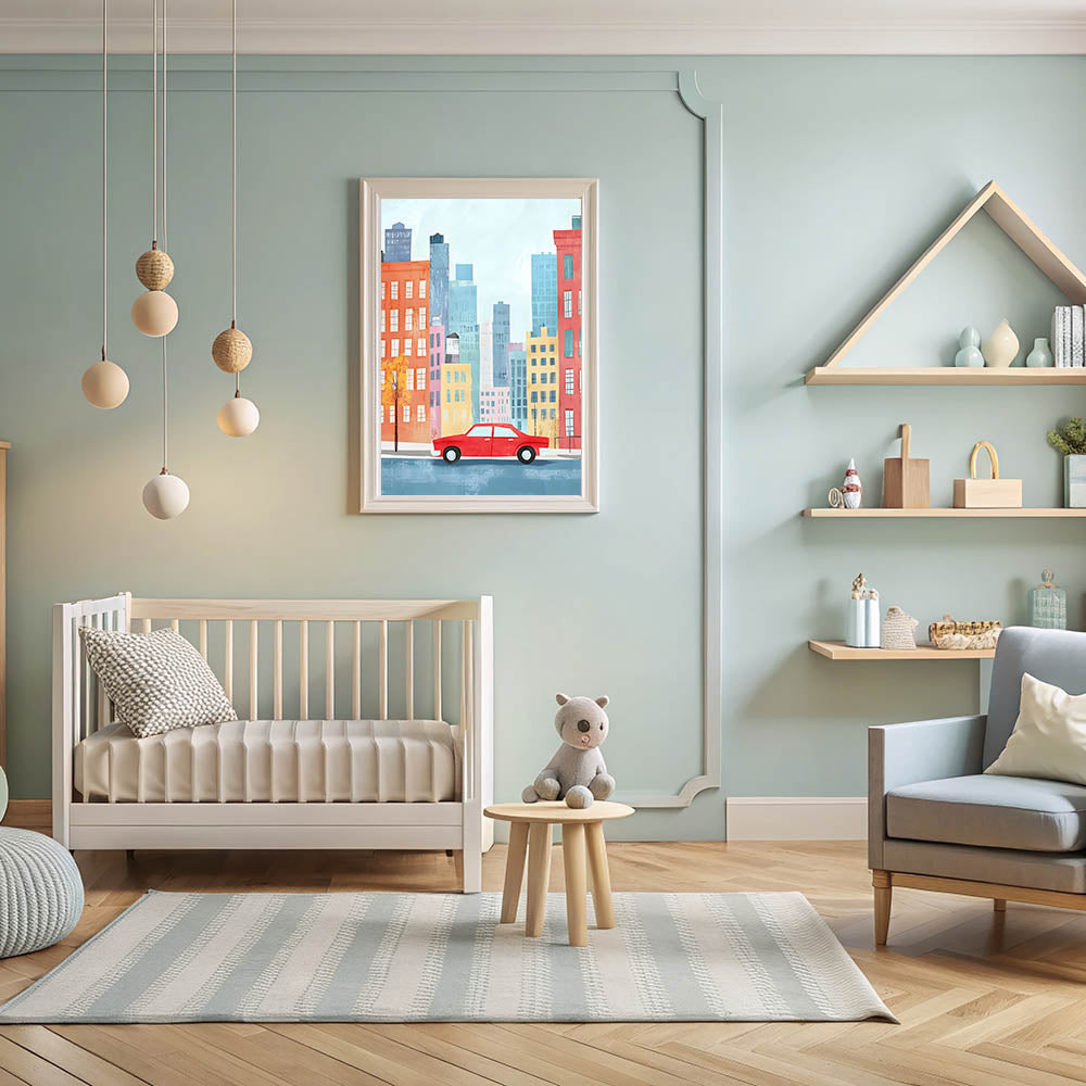 Cityscape Red Car Nursery Wall Art – Kids Room & Baby Decor
