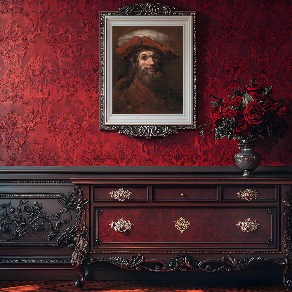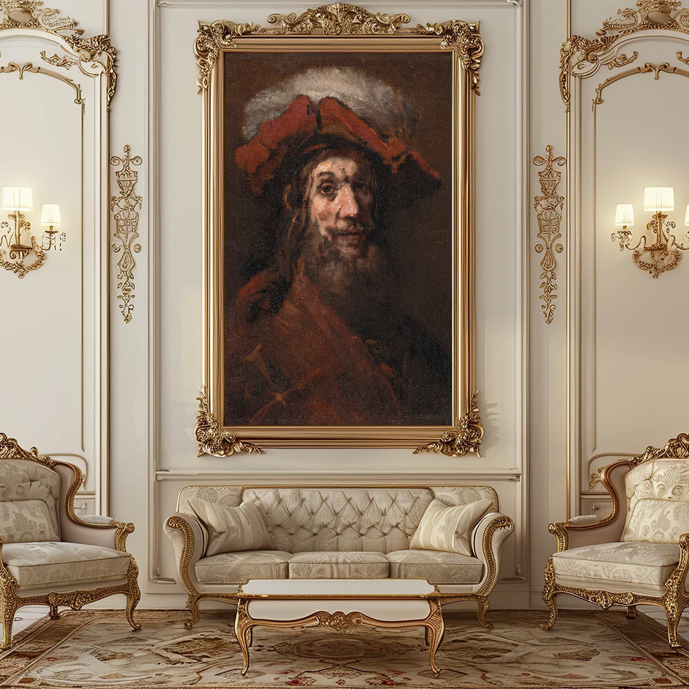 Dive into the captivating allure of Baroque art with this expressive and enigmatic portrait. Featuring a figure adorned with a striking red hat and dramatic lighting, this piece showcases the raw emotion and intricate detailing characteristic of the Baroque era. The rich textures and muted palette add depth, making this artwork a timeless addition to any collection.