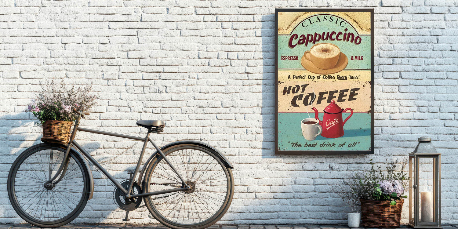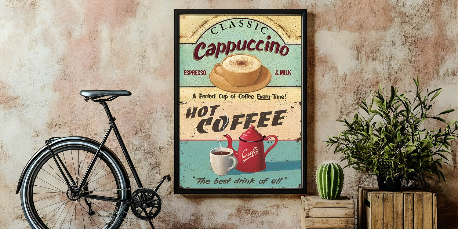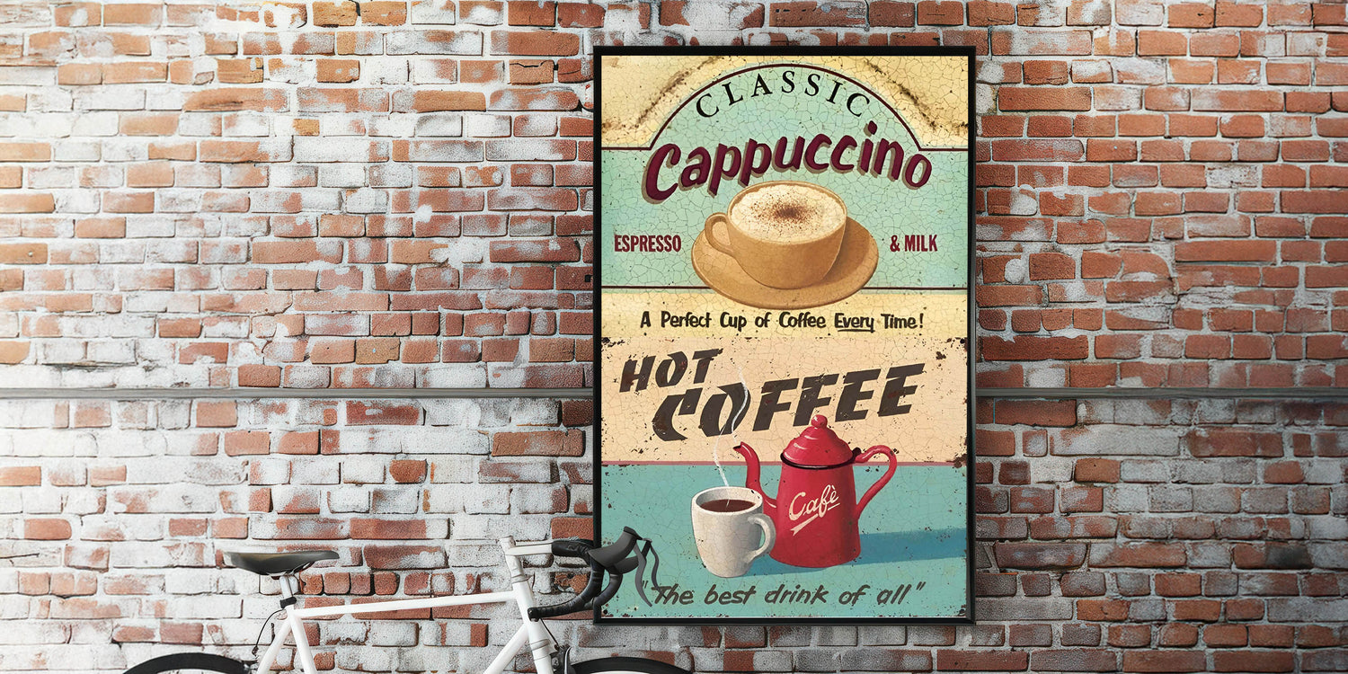 - High-quality reproduction of a classic cappuccino and hot coffee ad
