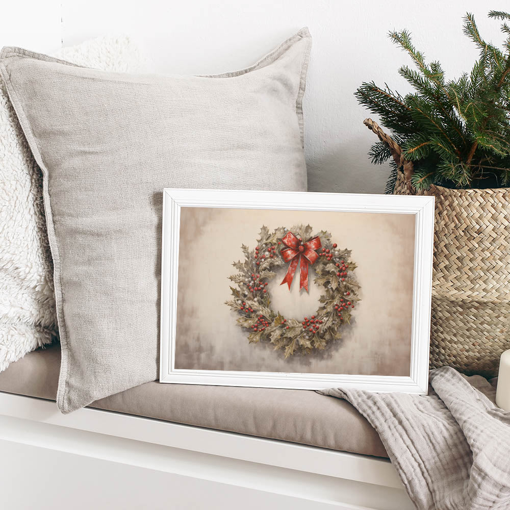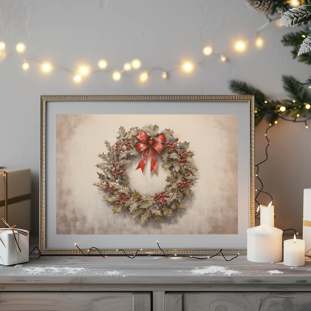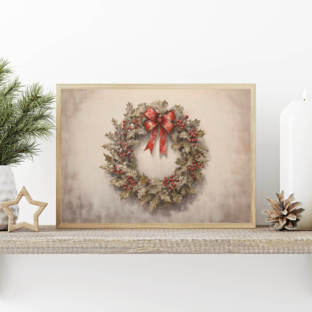 Celebrate the beauty of the season with this exquisite Christmas Wall Decor, featuring a classic holiday wreath adorned with holly berries, frosted leaves, and a festive red bow. The soft beige background and rich seasonal colors create a timeless and elegant holiday aesthetic, making this artwork a perfect addition to your Christmas decorations. Whether placed in your living room, entryway, or dining space, this piece brings traditional holiday charm to any setting.