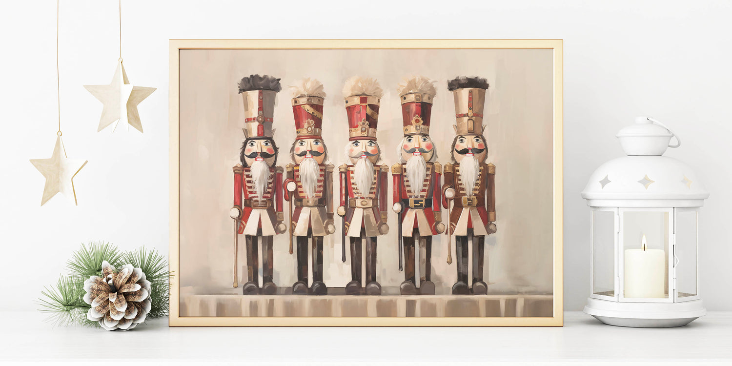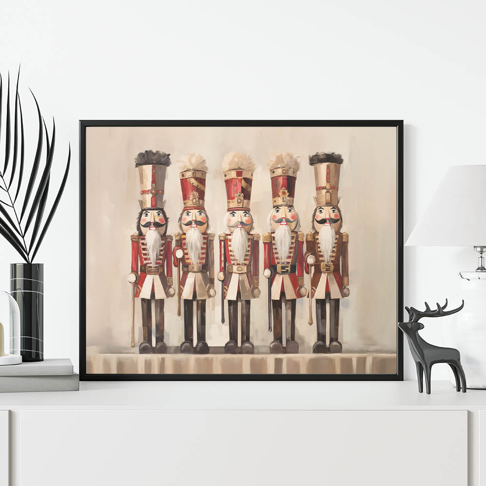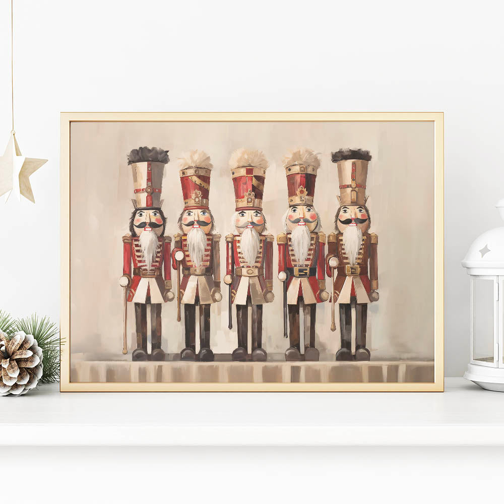 Celebrate the holiday season with this timeless Christmas Wall Hangings design, featuring five beautifully detailed nutcracker soldiers standing proudly in festive red and gold uniforms. With their classic craftsmanship, elegant attire, and regal stance, these nutcrackers bring a traditional and nostalgic charm to your holiday decor. Whether displayed in your living room, mantel, or entryway, this artwork adds a sophisticated festive touch to your home.