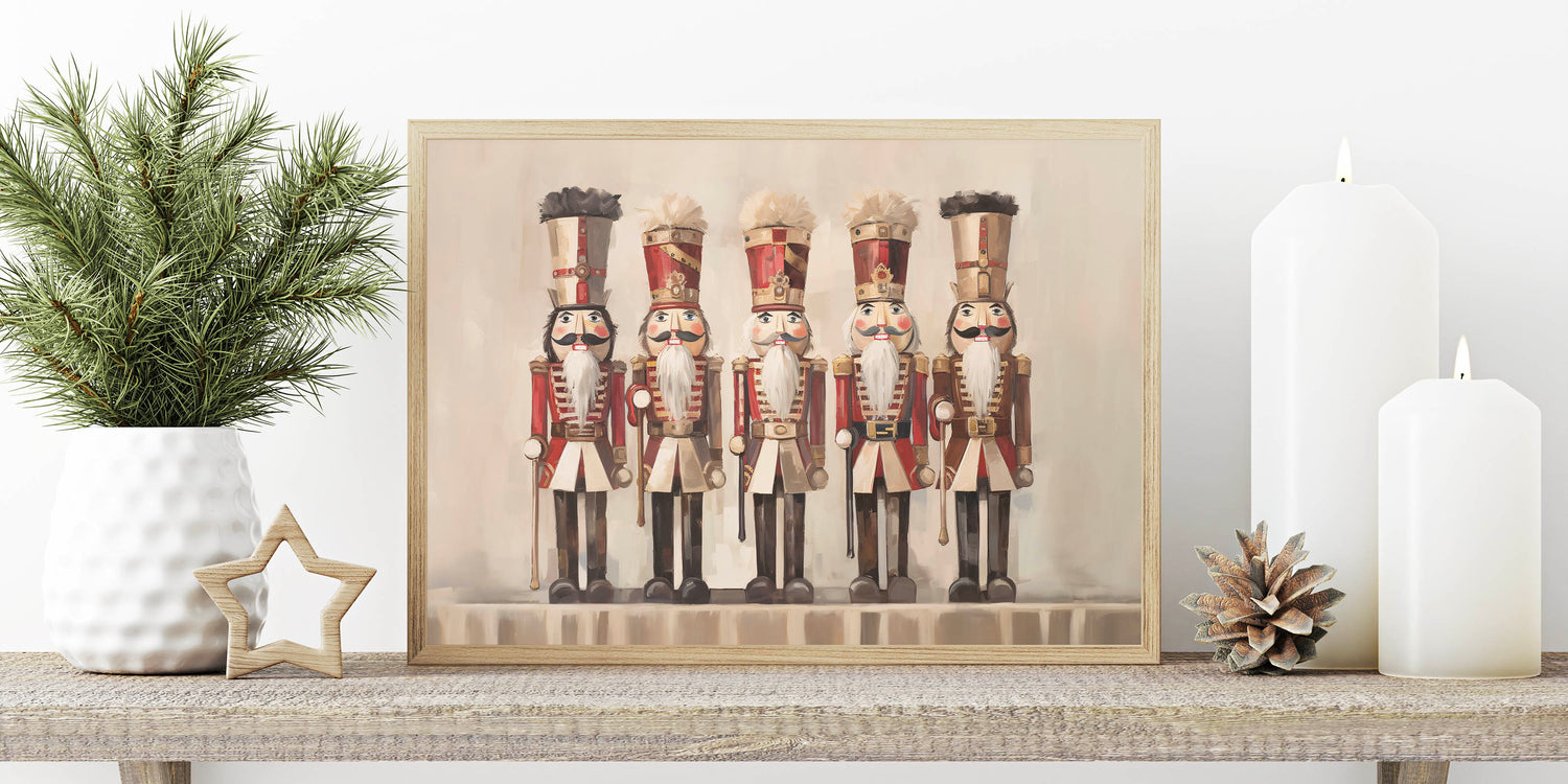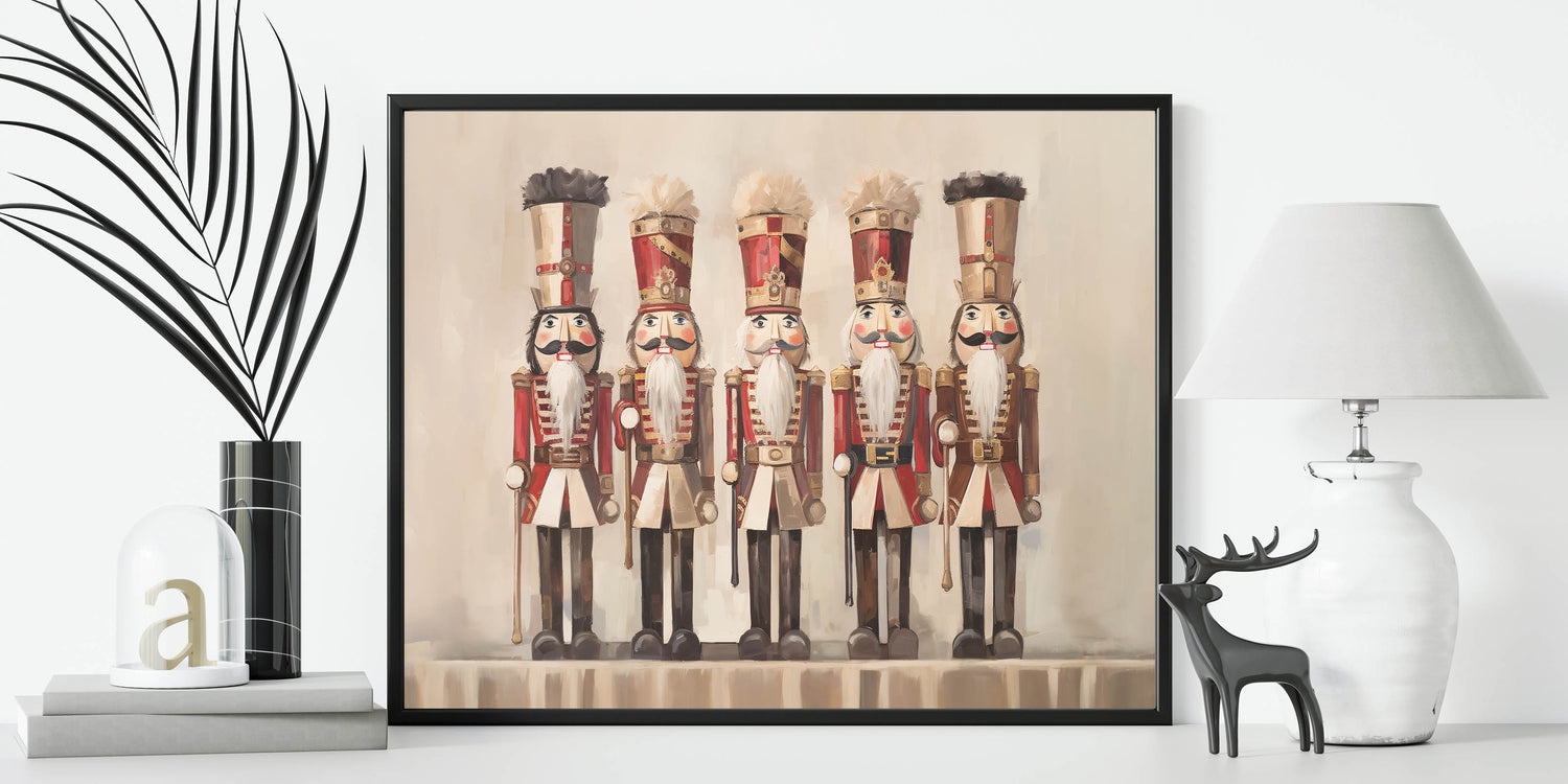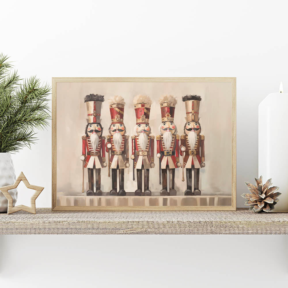 Celebrate the holiday season with this timeless Christmas Wall Hangings design, featuring five beautifully detailed nutcracker soldiers standing proudly in festive red and gold uniforms. With their classic craftsmanship, elegant attire, and regal stance, these nutcrackers bring a traditional and nostalgic charm to your holiday decor. Whether displayed in your living room, mantel, or entryway, this artwork adds a sophisticated festive touch to your home.