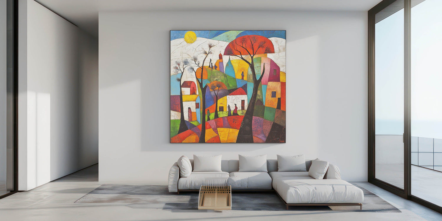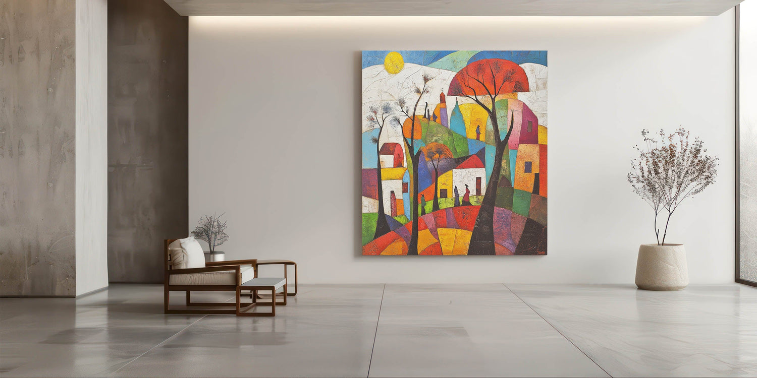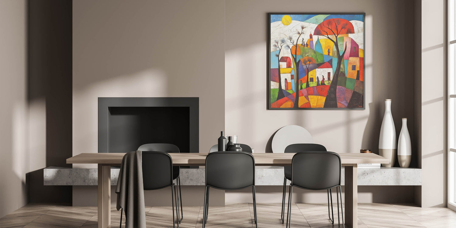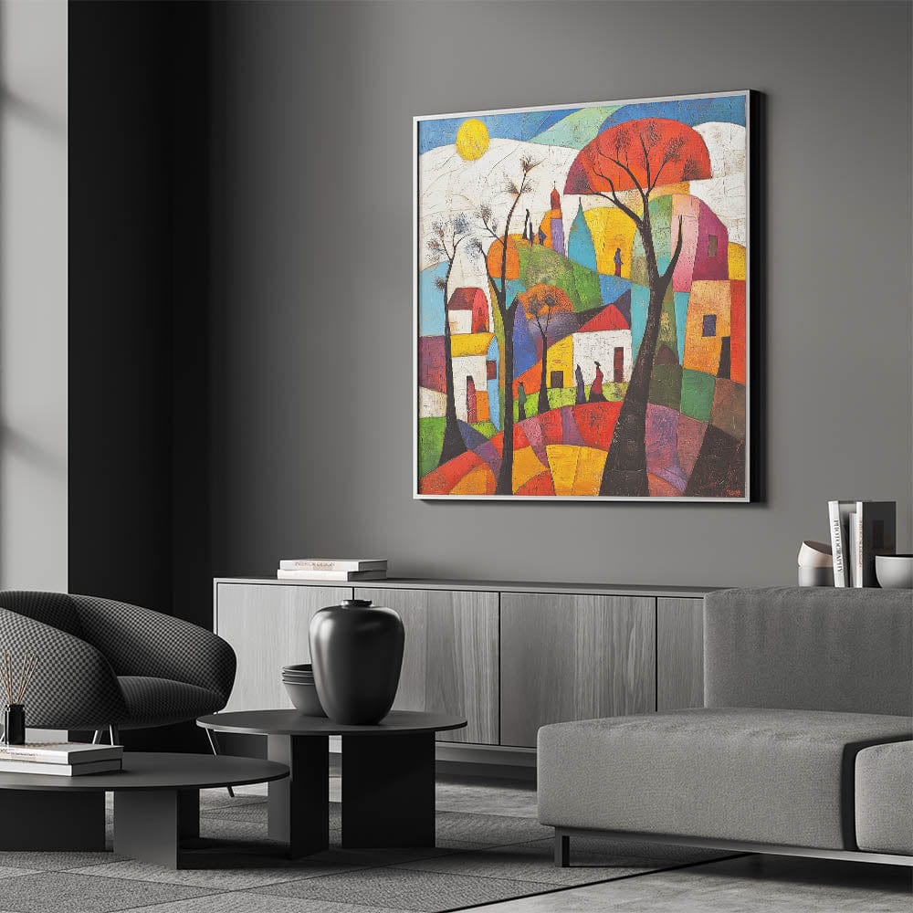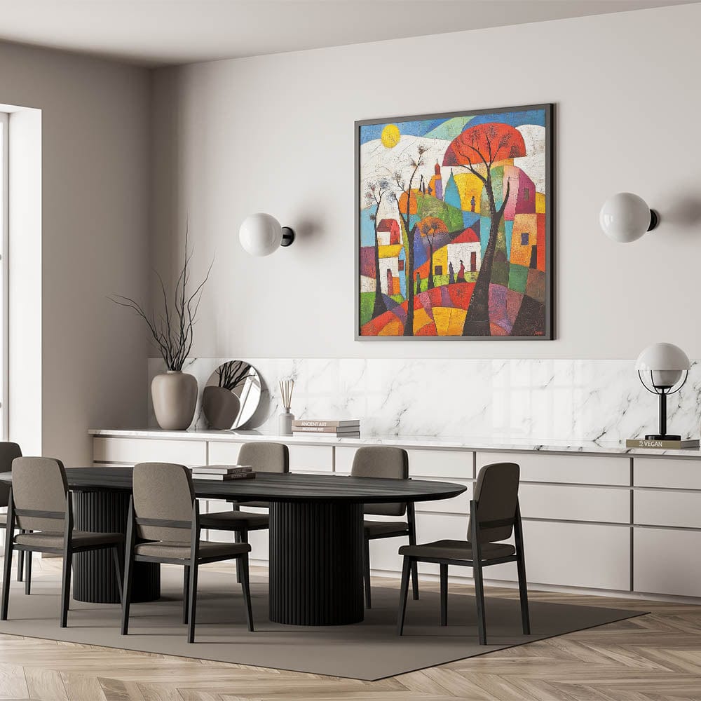 Bring a vibrant touch to your space with this abstract architecture wall art collection, showcasing a stunning composition of bold geometric shapes, vivid colors, and an artistic cityscape. This modern architectural abstract design captures the harmony of urban life through an expressive blend of abstract skyline wall art and dynamic color contrasts.