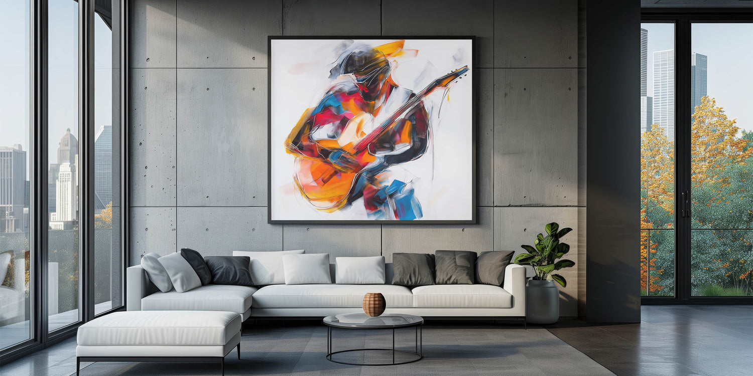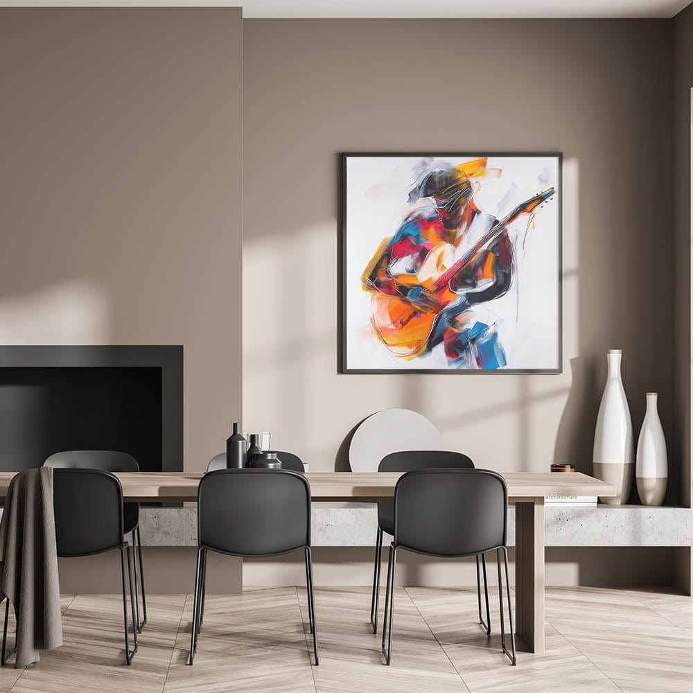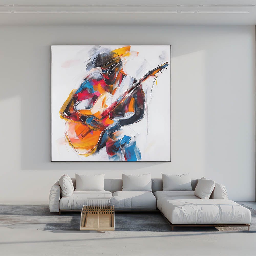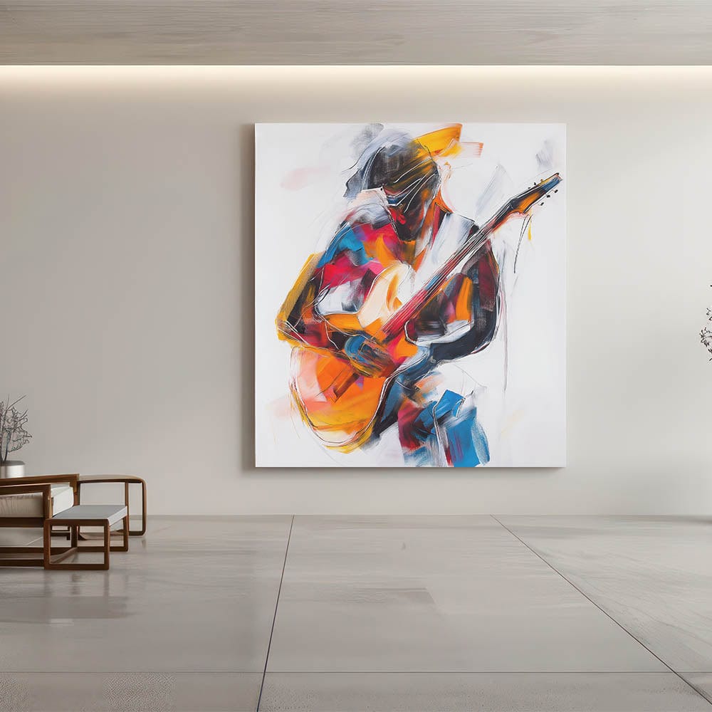 Immerse yourself in the vibrant energy of this Abstract Figurative Art Collection piece, featuring a dynamic guitarist brought to life with bold strokes and an explosion of color. This modern figure-inspired wall art masterfully blends movement and emotion, making it a striking focal point for contemporary spaces. The fluid brushwork and expressive palette evoke passion and creativity, ideal for music lovers and art enthusiasts alike.