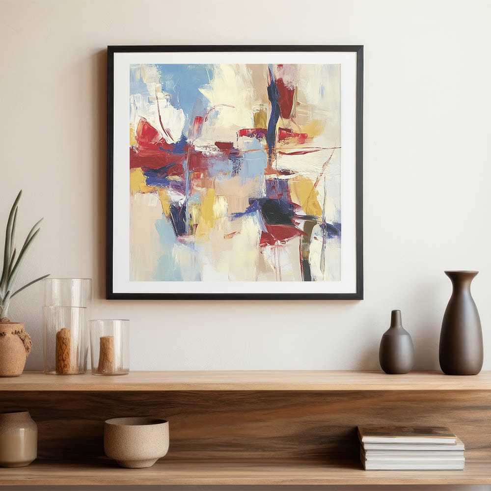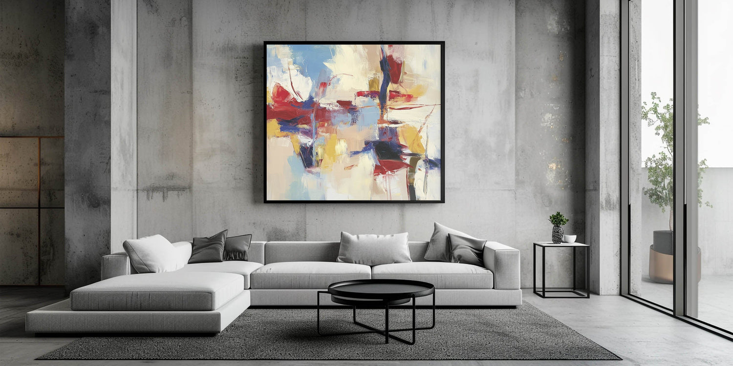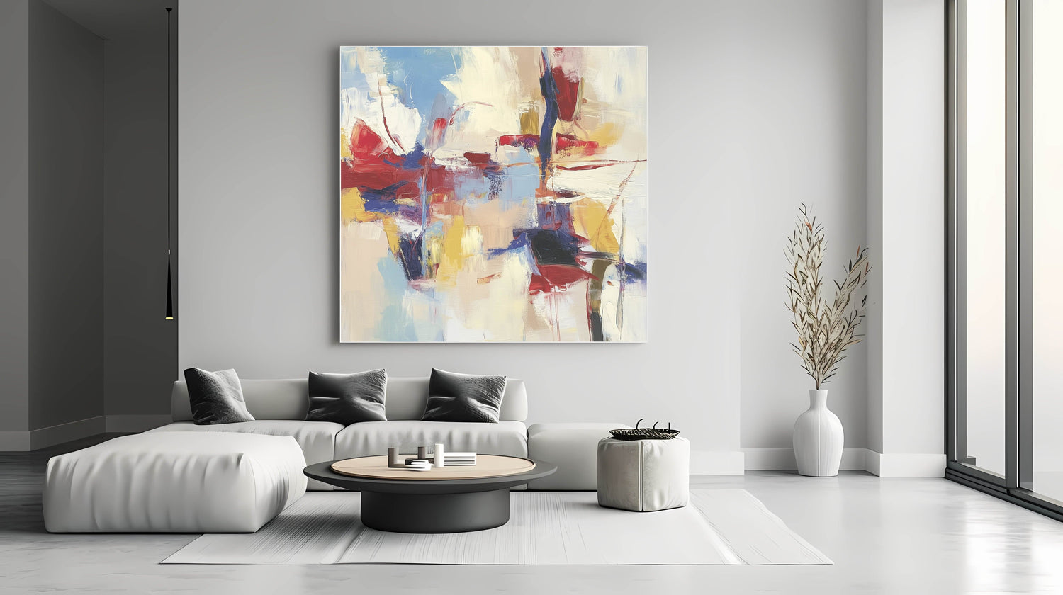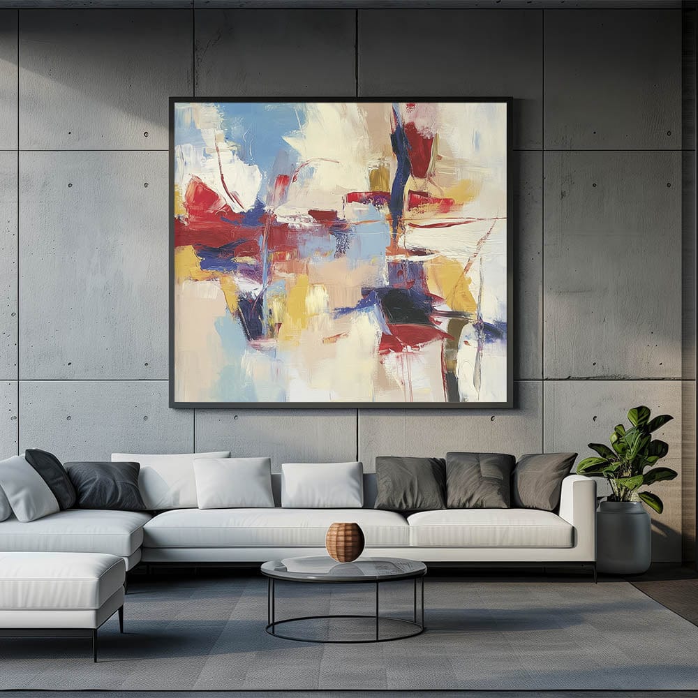 Bursting with energy and warmth, this colorful abstract wall art blends bold red, blue, yellow, and cream strokes in a layered, expressive composition. It’s the perfect piece to infuse your space with color, creativity, and dynamic modern style.