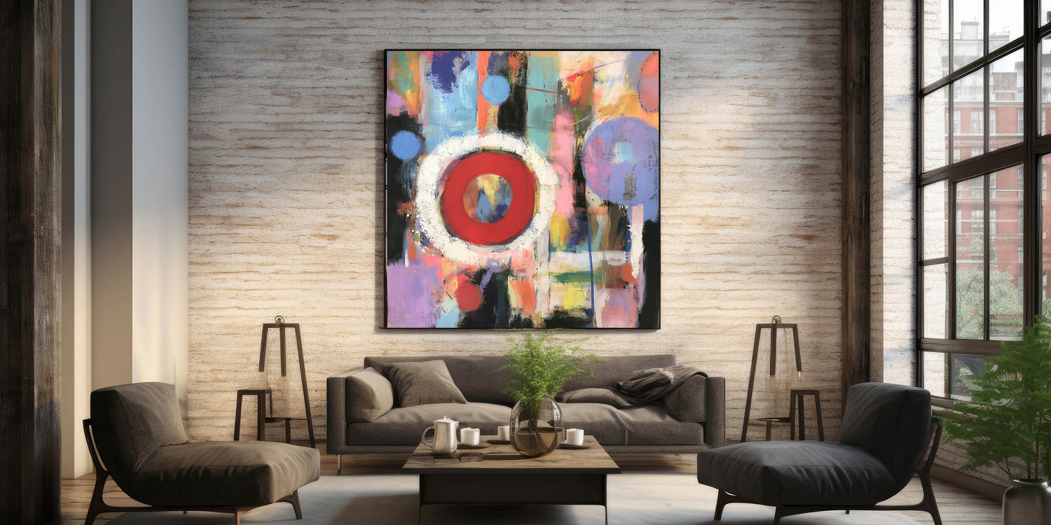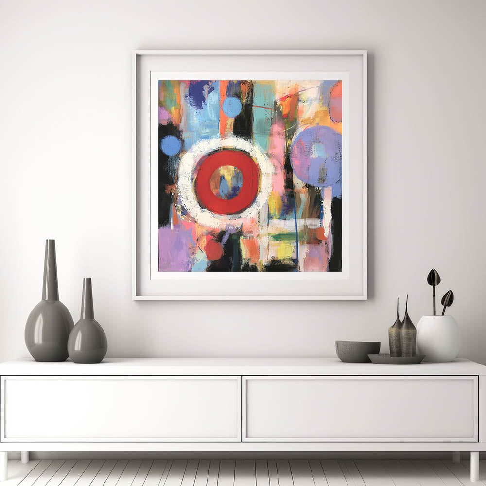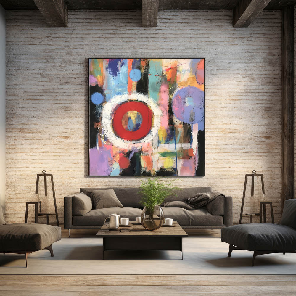 Add a bold artistic statement to your space with this modern wall art, featuring an expressive abstract design filled with rich hues of red, blue, pink, yellow, and multicolor. The dynamic brushstrokes and geometric circular elements create a visually striking canvas wall art piece that enhances modern living room decor.
