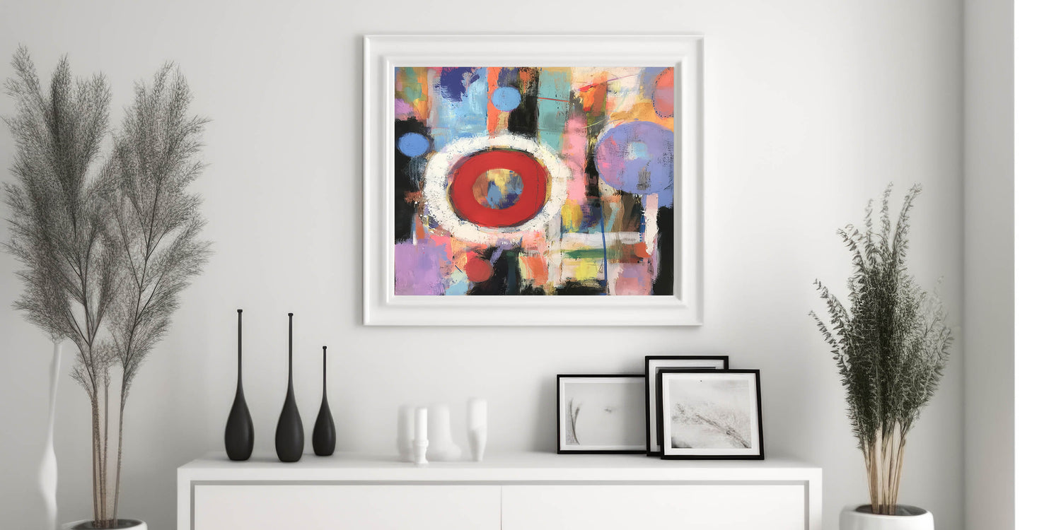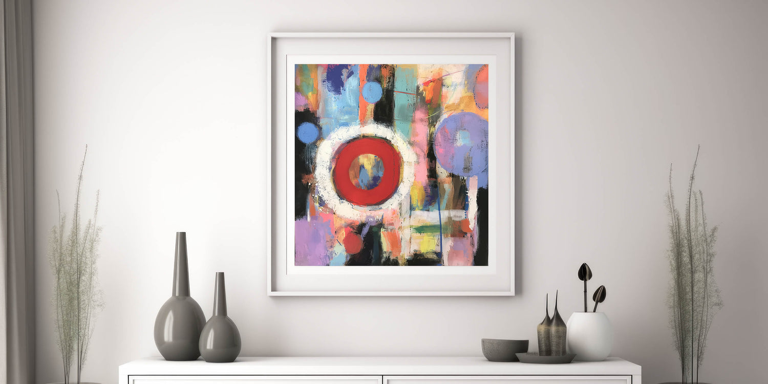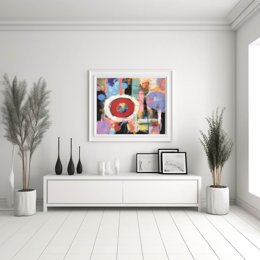 Add a bold artistic statement to your space with this modern wall art, featuring an expressive abstract design filled with rich hues of red, blue, pink, yellow, and multicolor. The dynamic brushstrokes and geometric circular elements create a visually striking canvas wall art piece that enhances modern living room decor.