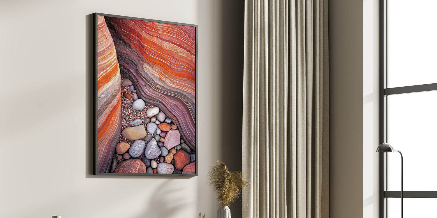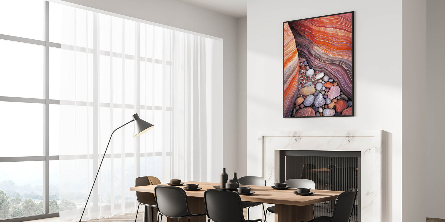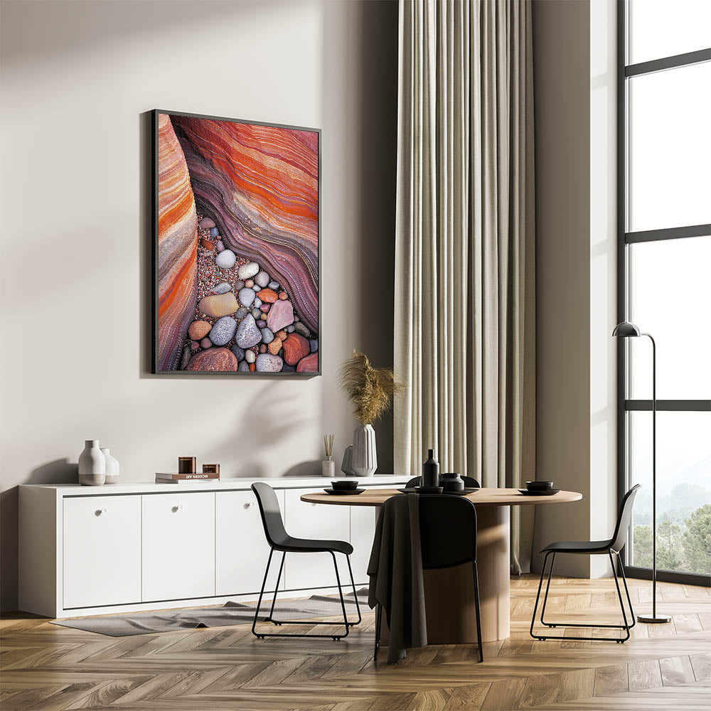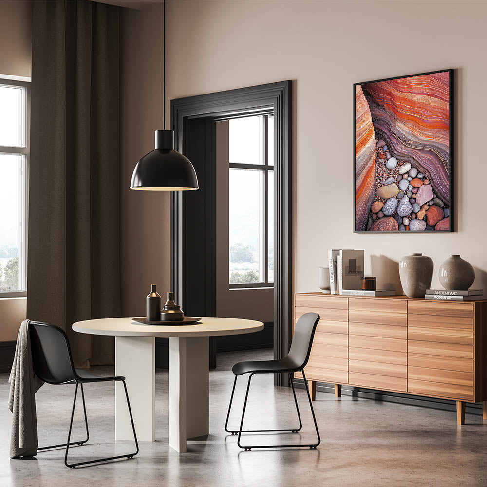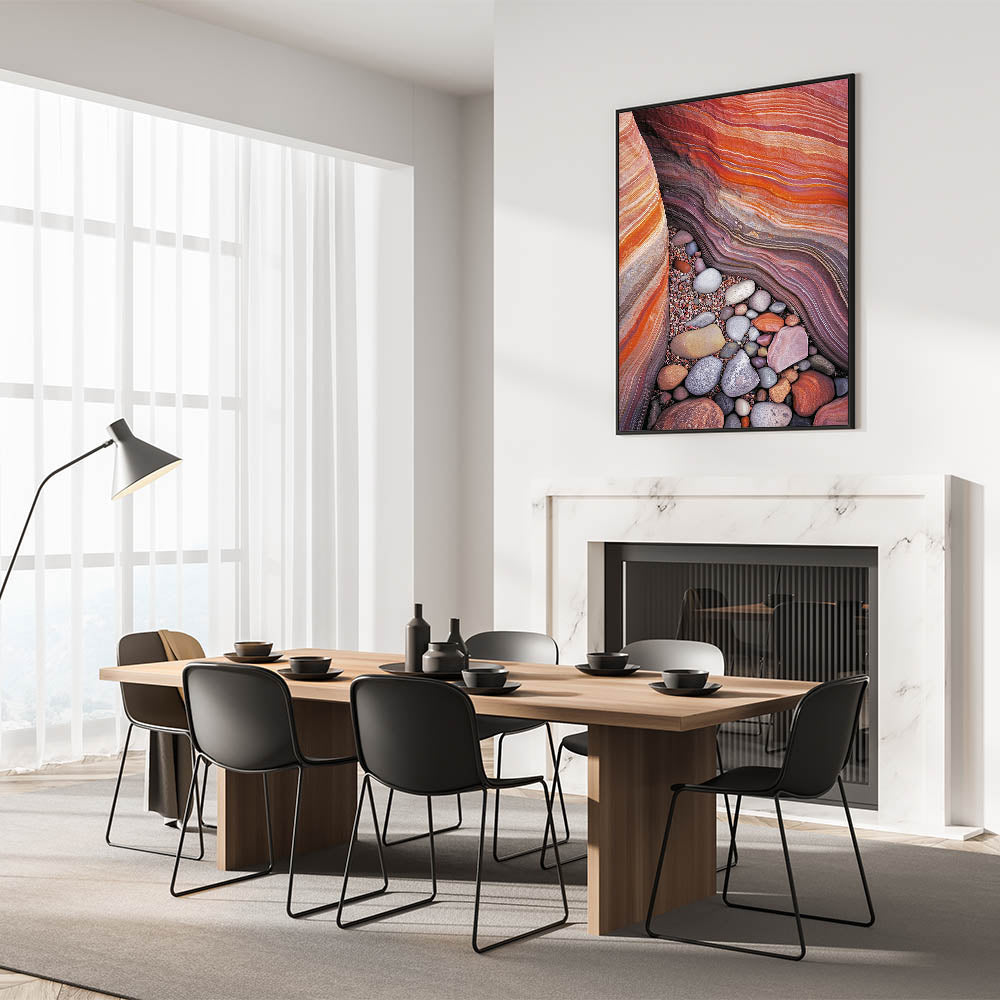 Discover the vivid beauty of nature with this colorful desert sandstone artwork. Featuring layers of rich red, orange, and beige sandstone complemented by an array of smooth, multicolored pebbles, this piece captures the intricate textures and stunning color palette of the desert. Perfect for bringing warmth and vibrancy to any modern or rustic space.