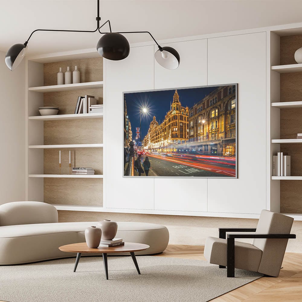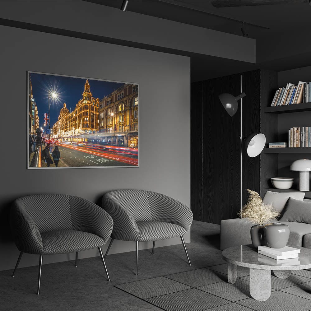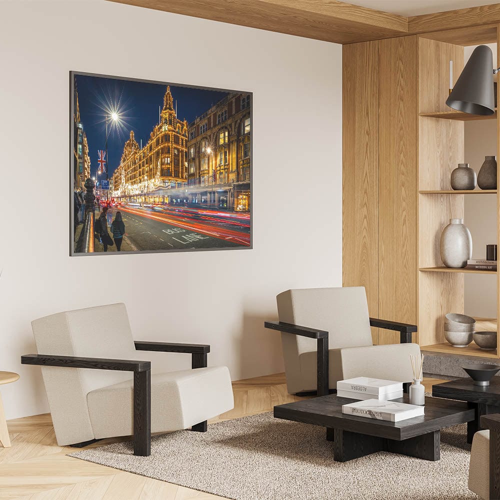 Illuminate your space with the charm and elegance of a historic city at night. This contemporary city wall decor captures the glowing storefronts and radiant architecture of London, highlighted by streaks of motion from passing cars. The brilliant golden building lights contrast beautifully with the deep blue sky and city bustle, creating a composition that feels both timeless and modern. Ideal for urban enthusiasts and admirers of classic European architecture, this print brings sophistication and movement to your walls.