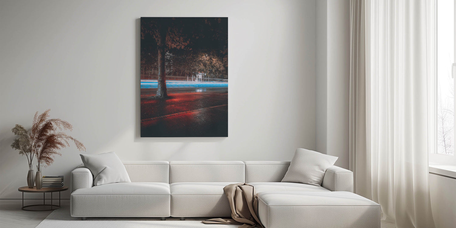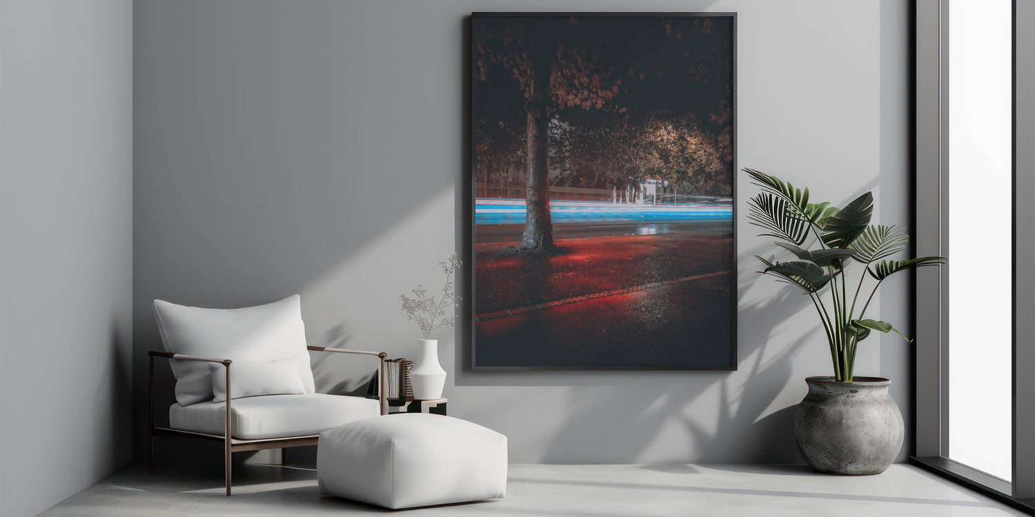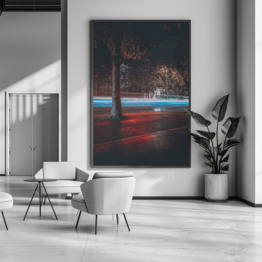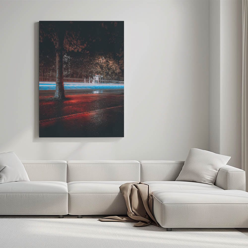 Bring motion, mood, and modern edge to your space with this contemporary city wall decor. Capturing the dynamic energy of nighttime traffic, this striking photograph features glowing red and blue light trails rushing through a tree-lined street. The reflections on wet pavement, the rich shadowy background, and the vivid contrast in color give this piece a dramatic and artistic flair.