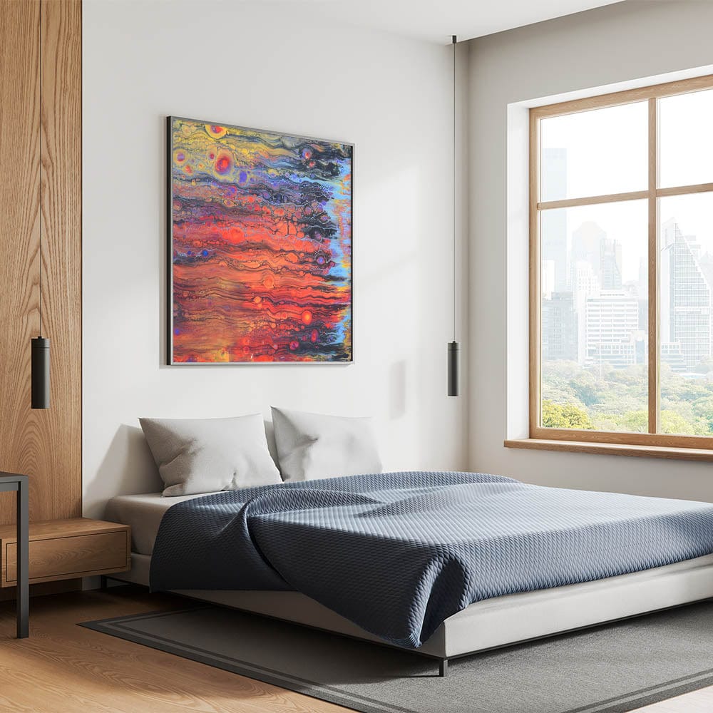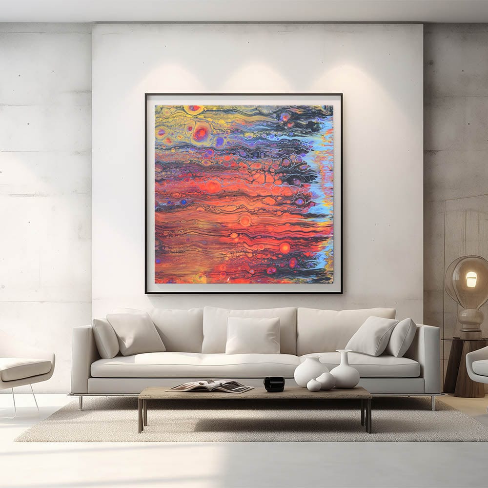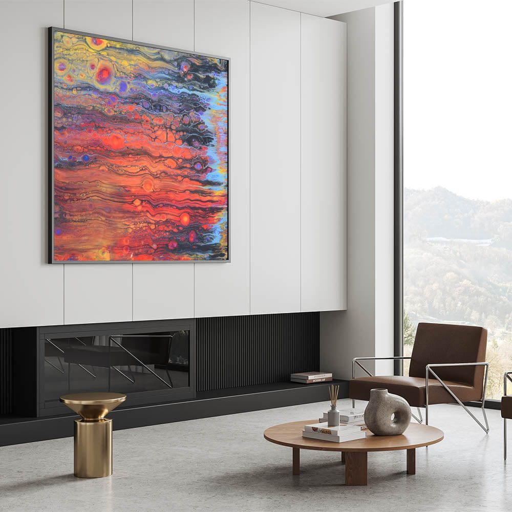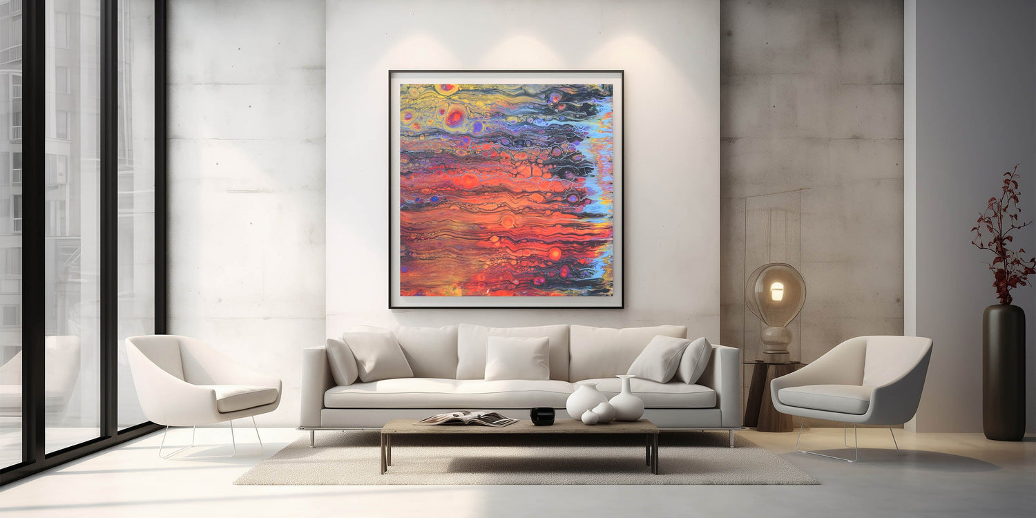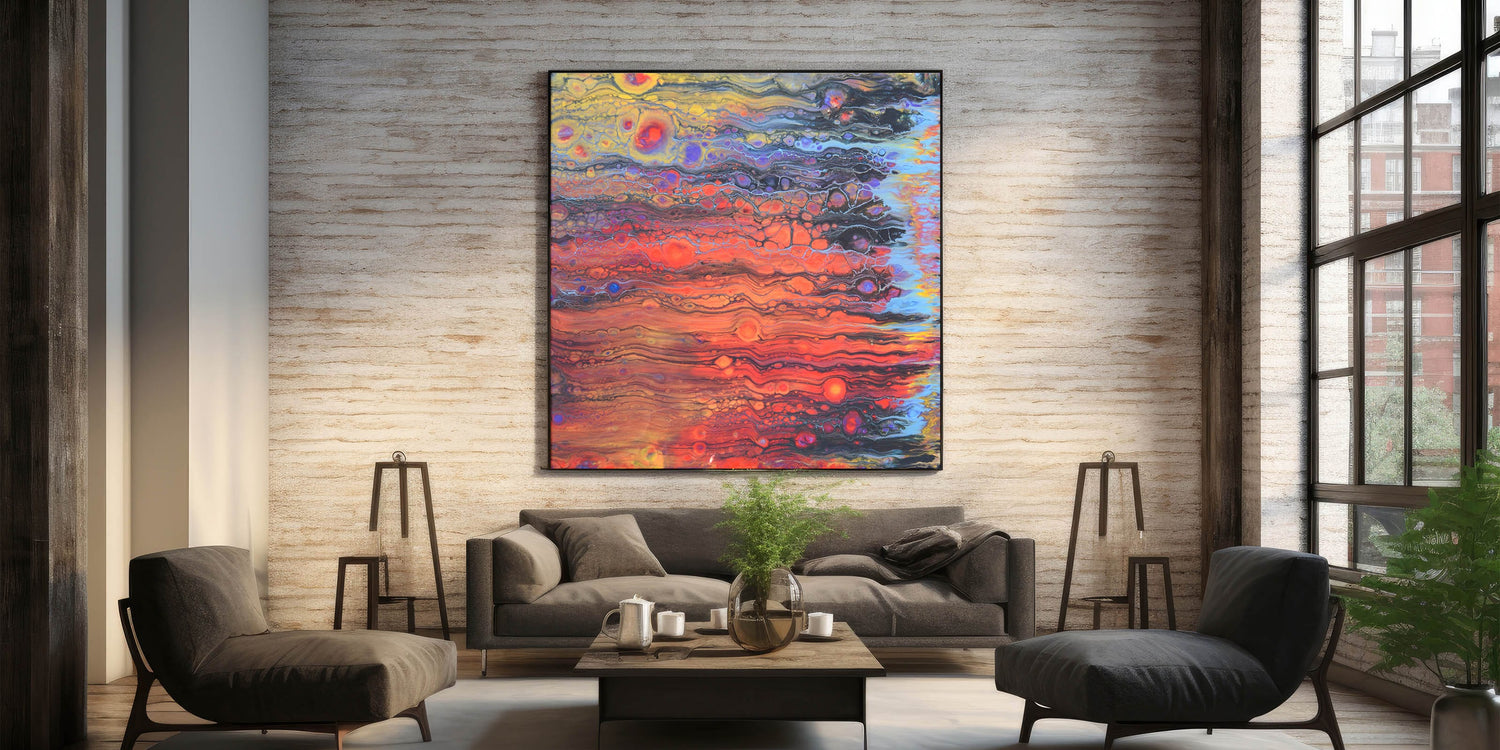 Transform your walls with abstract fluid canvas art that blends intense colors and organic flow. Whether for home or office, this contemporary fluid art painting adds warmth and energy to any space.