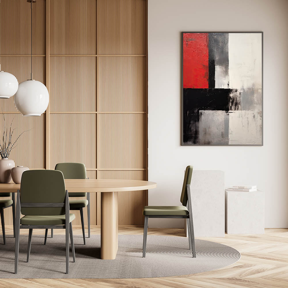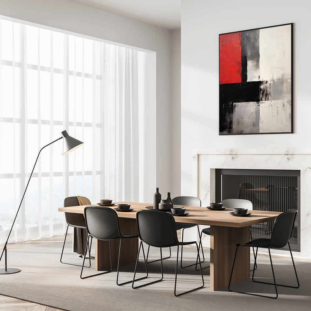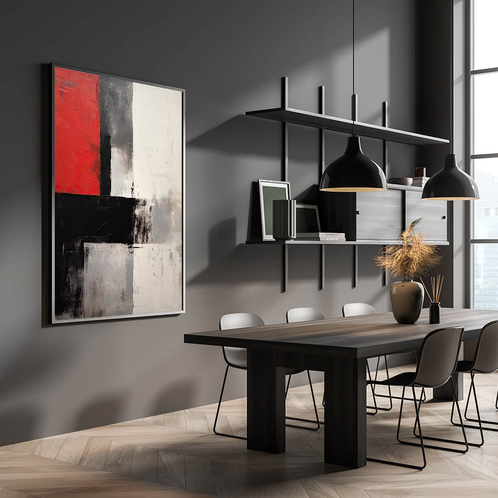 Make a statement in your space with this elegant dining room wall art, featuring a powerful mix of red, black, and white tones. This modern dining room art captivates with its bold abstract design, creating an eye-catching focal point for your dining area.
