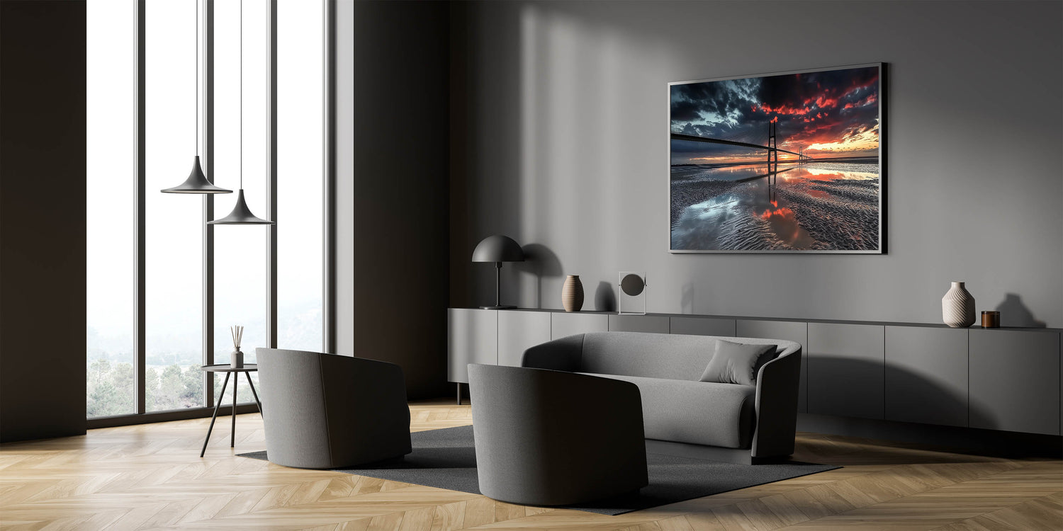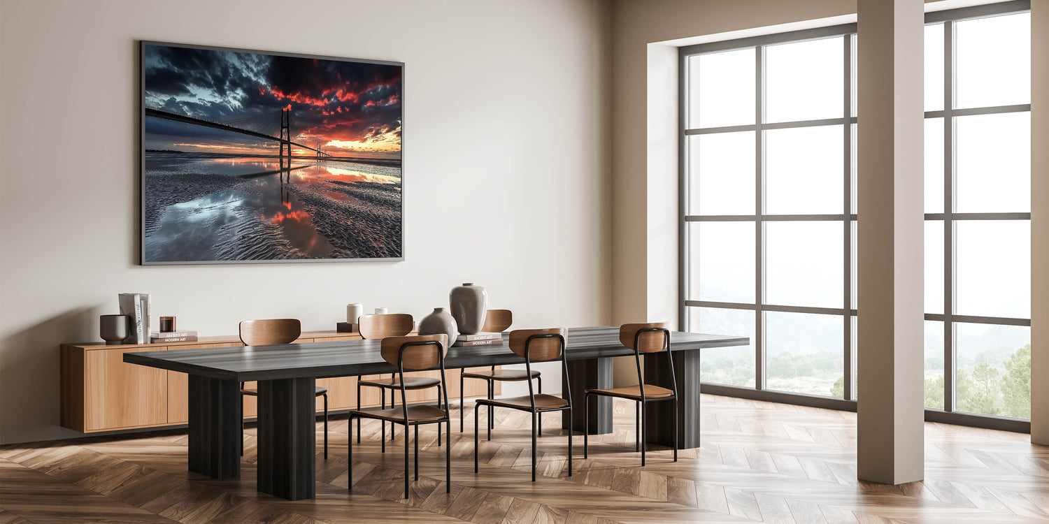 Bring drama and elegance to your interior with this sunset-inspired bridge painting. Perfect for living rooms, offices, or bedrooms, this unique art print will create an inviting and inspiring atmosphere. Celebrate the harmony of nature and architecture with this timeless masterpiece.