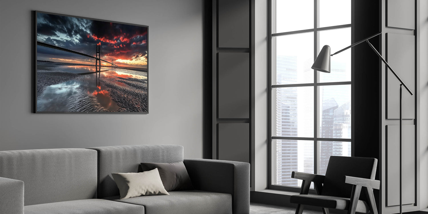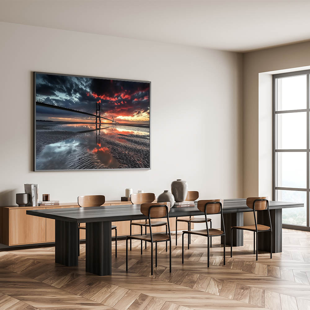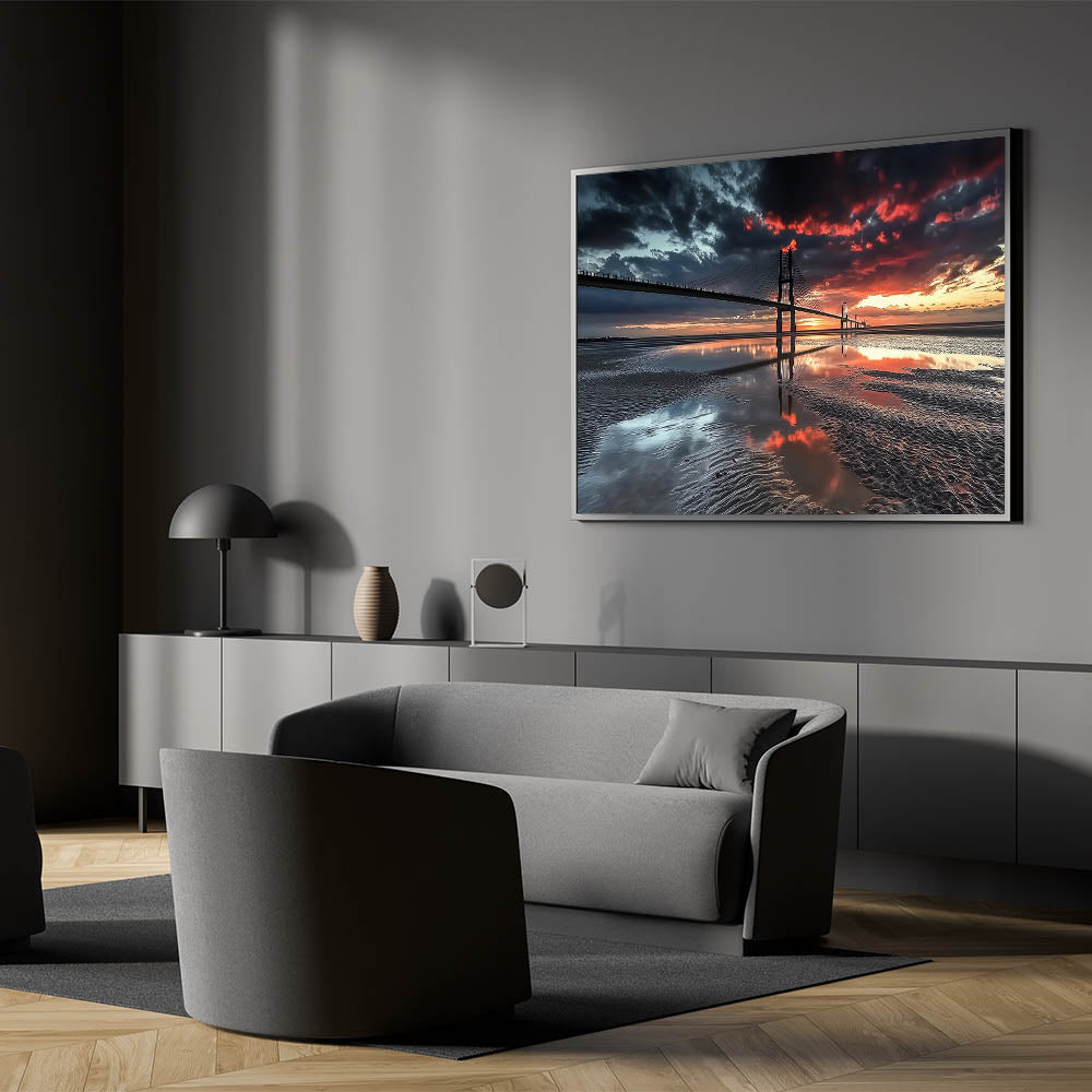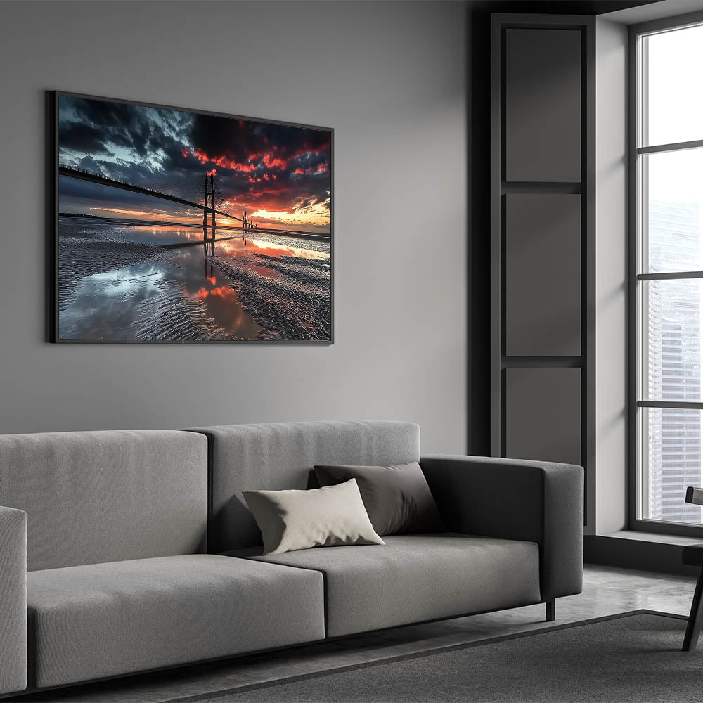 Capture the breathtaking beauty of this decorative bridge wall art, featuring a sleek suspension bridge reflected perfectly in the rippled water below. Set against a stunning sunset sky filled with fiery reds and oranges contrasted by deep blues and grays, this artwork radiates intensity and tranquility. The composition masterfully combines the elegance of modern engineering with the grandeur of nature, making it an extraordinary addition to your decor.