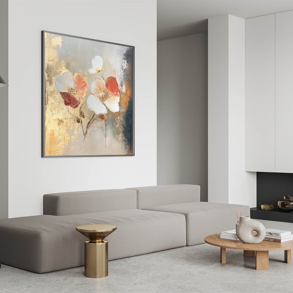- A striking mix of gold, red, and neutral tones creates a large-scale flower abstract art