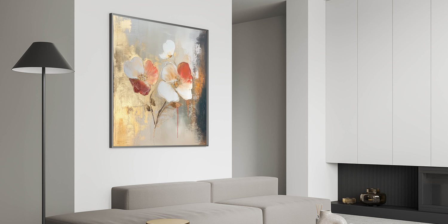 - High-quality abstract floral art on canvas available in multiple sizes and materials
