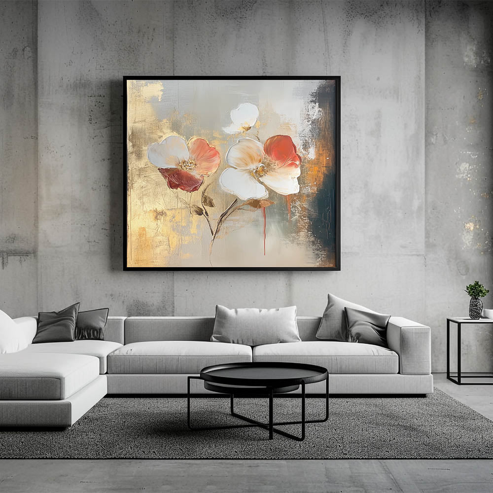 Enhance your home decor with this abstract floral artwork for home decor, featuring bold brushstrokes and rich textures in gold, red, and soft white. This modern flower abstract painting showcases a captivating blend of warm hues, adding depth and sophistication to any space. The luxurious gold accents and organic floral details make this piece a stunning contemporary botanical canvas print for those who appreciate art with elegance.