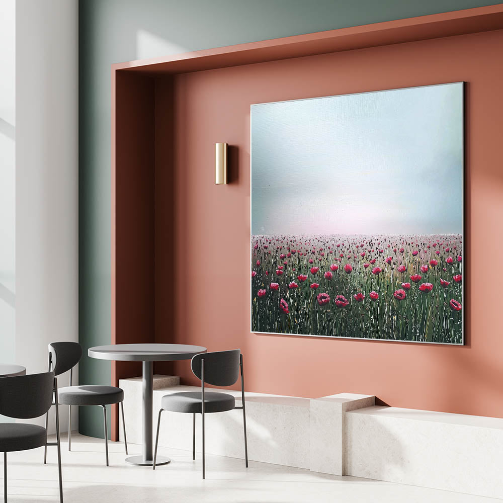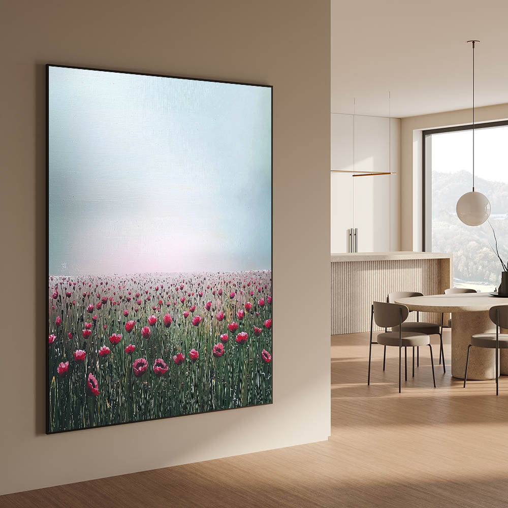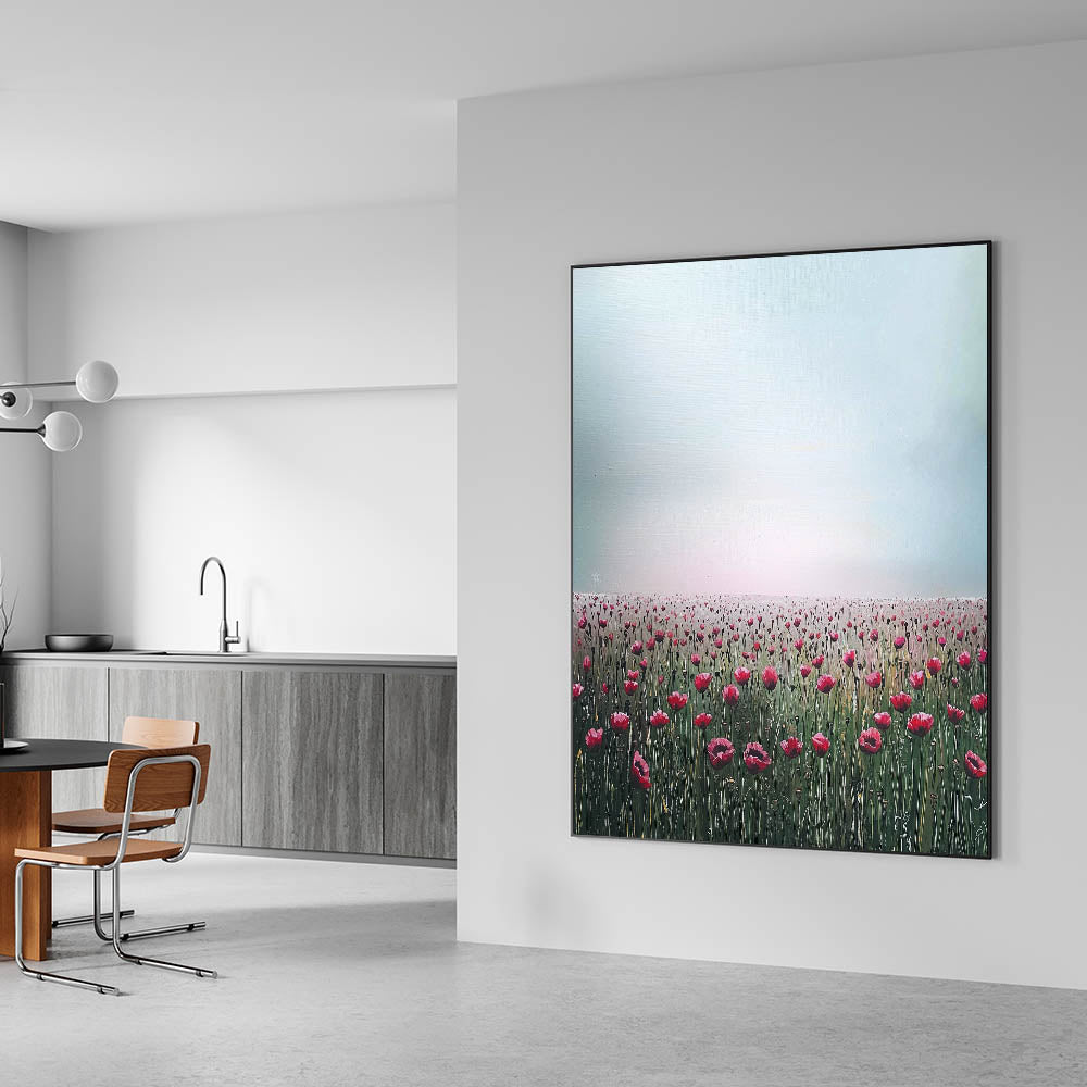 Bring the beauty of nature into your dining space with this elegant dining room wall art, featuring a breathtaking field of red poppies against a misty sky. The soft hues of green, muted blue, and red create a calming and sophisticated ambiance, making this modern dining room art an ideal focal point for your decor.