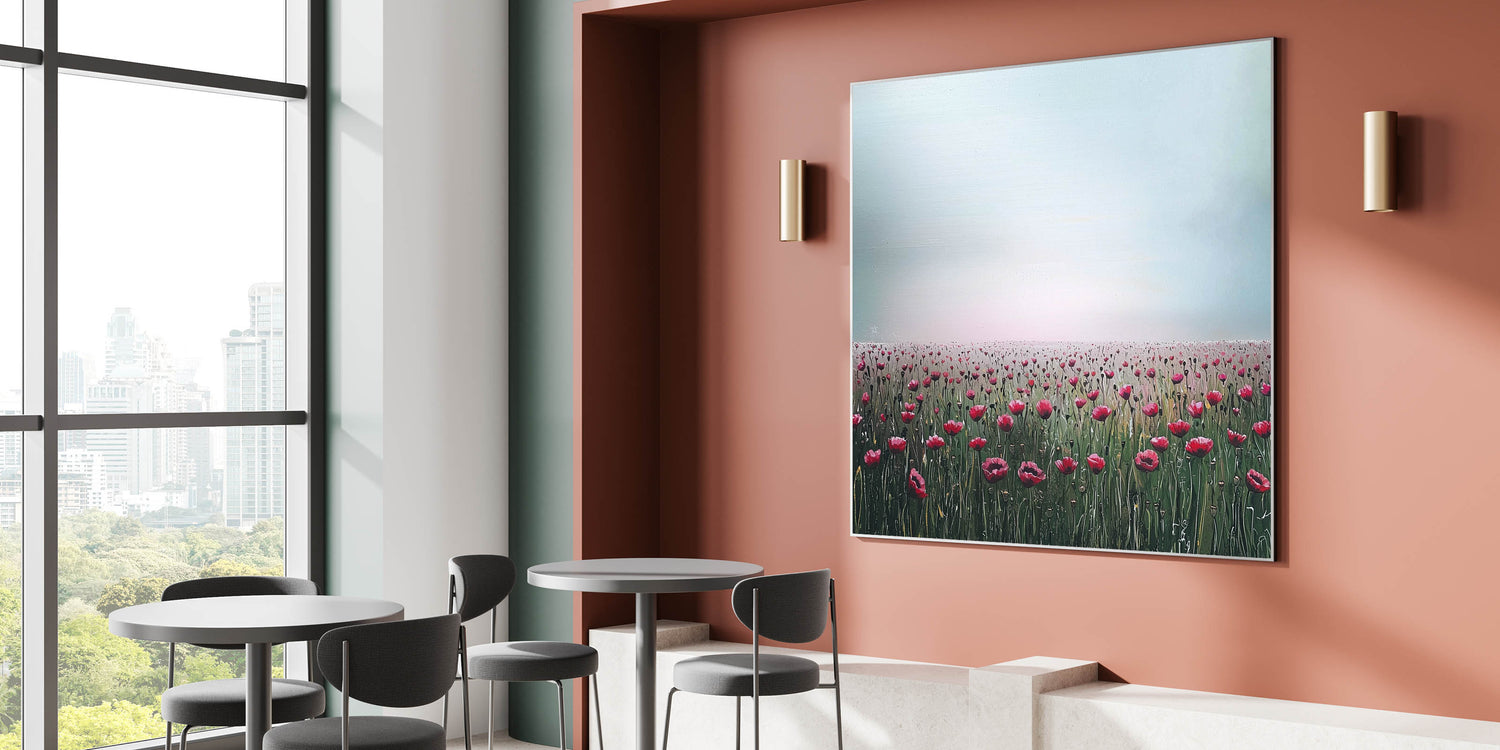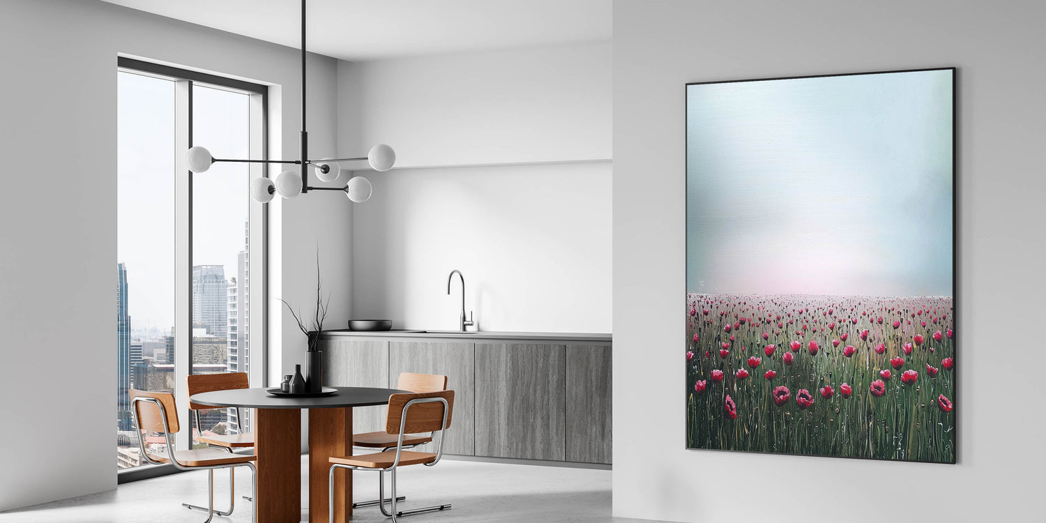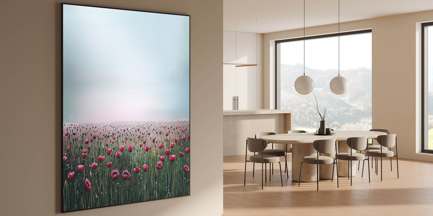 Bring the beauty of nature into your dining space with this elegant dining room wall art, featuring a breathtaking field of red poppies against a misty sky. The soft hues of green, muted blue, and red create a calming and sophisticated ambiance, making this modern dining room art an ideal focal point for your decor.